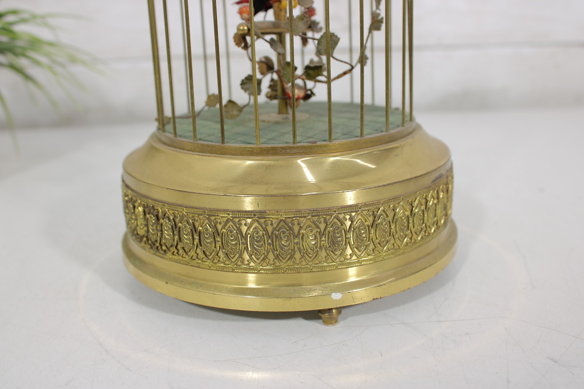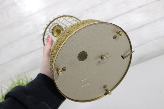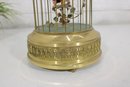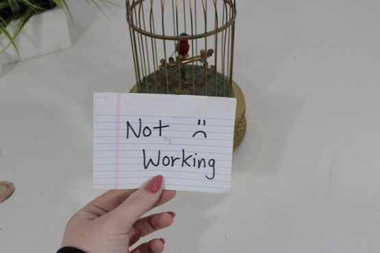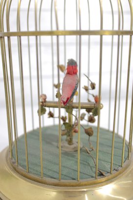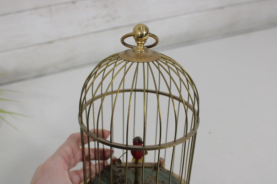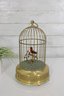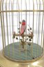 a charming vintage singing bird in cage automaton music box, featuring a colorful bird perched inside a decorative brass birdcage. These novelty mechanical pieces were designed to play music while the bird moves and sings, making them popular decorative collectibles.