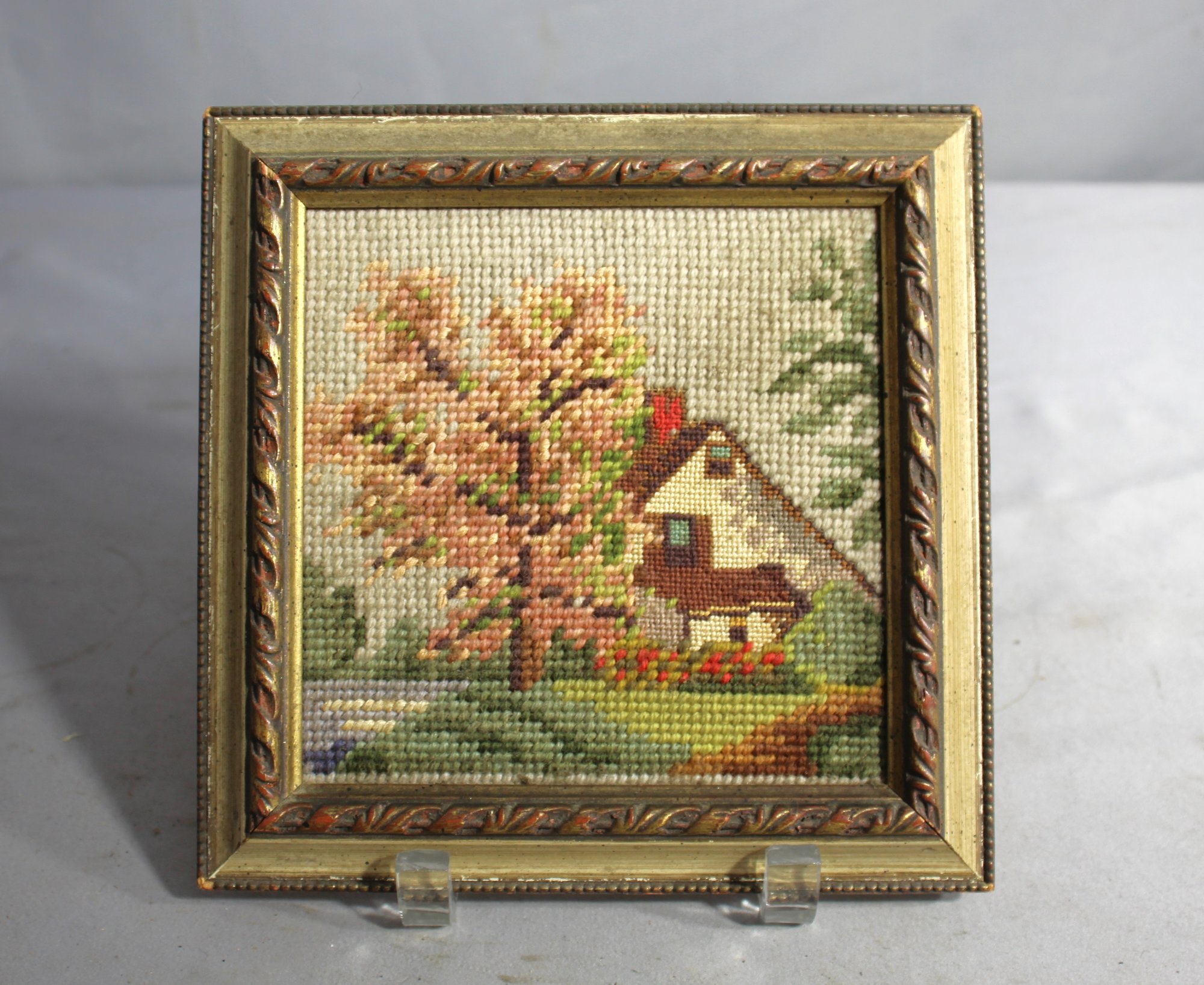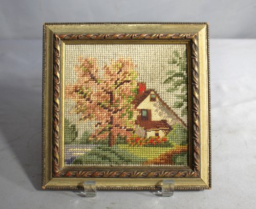 Vintage Small Framed Needlepoint Cottage Country Scene Blues Pinks - 8" X 8"
