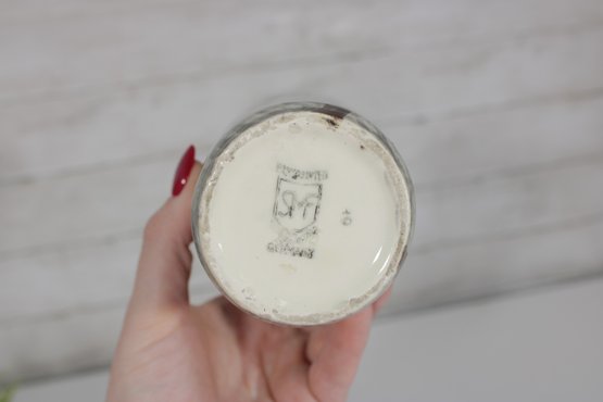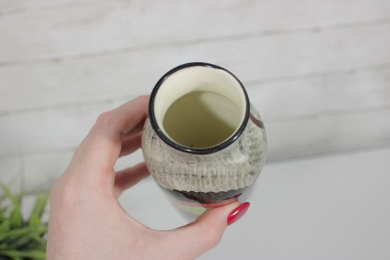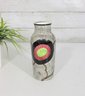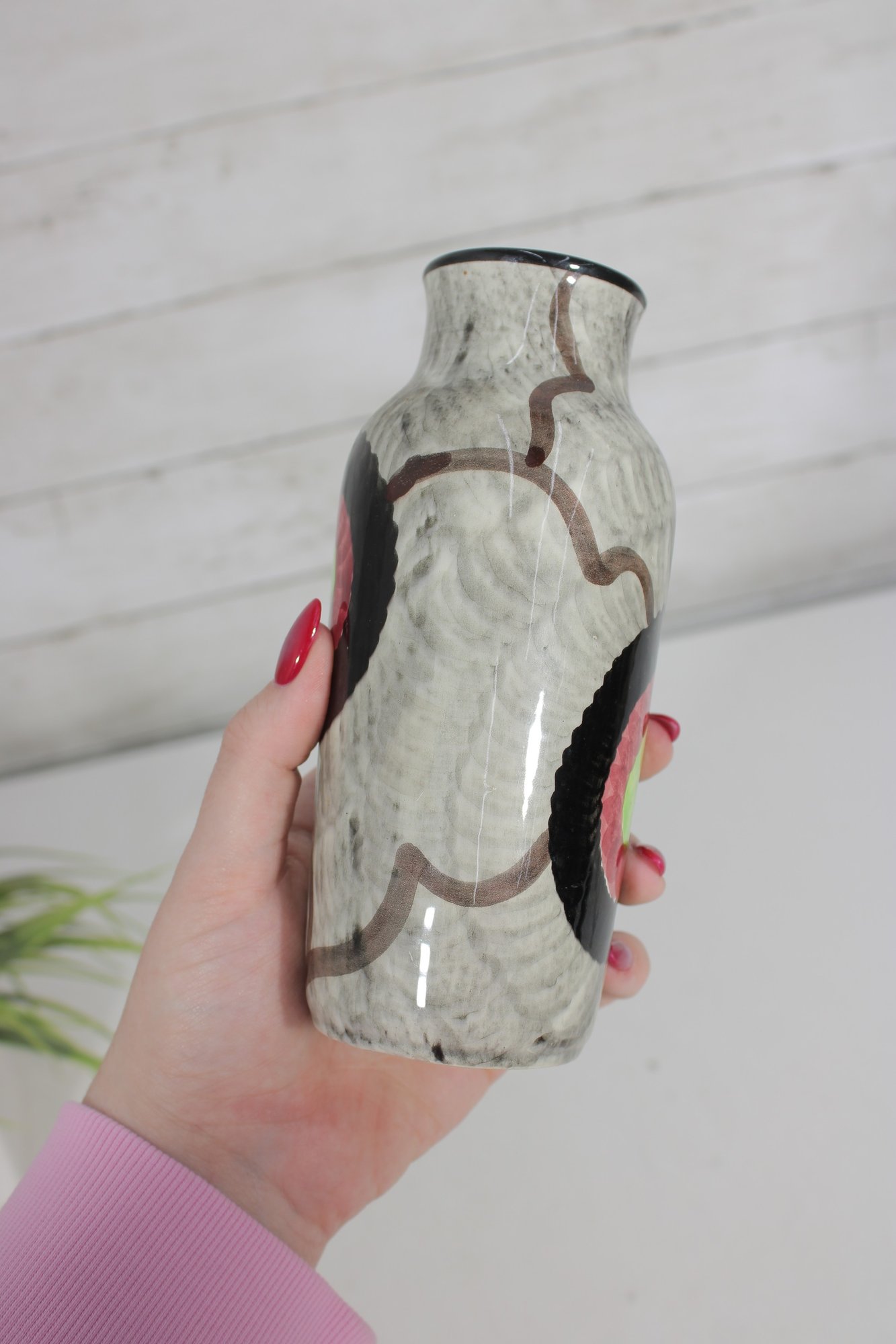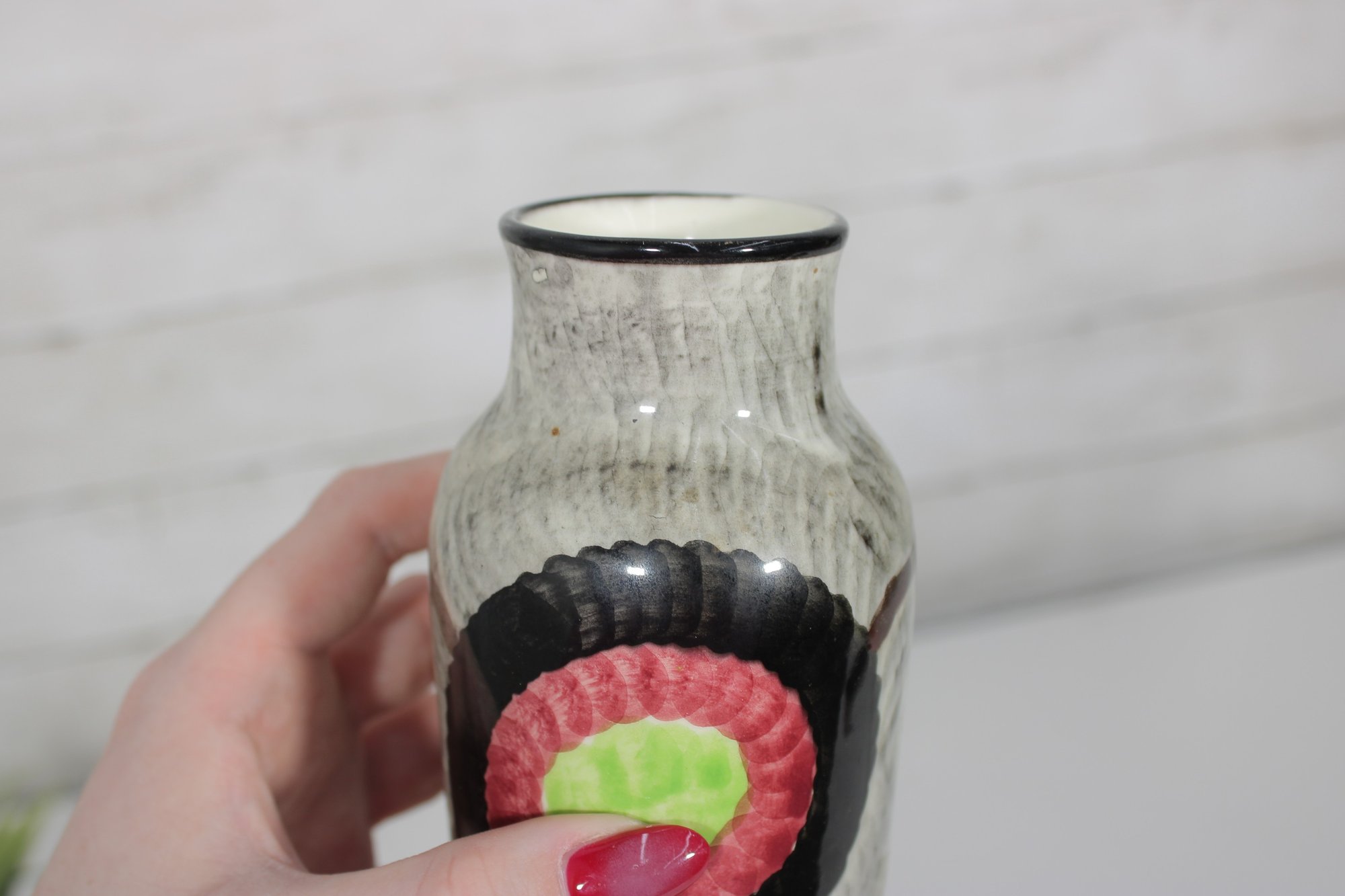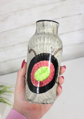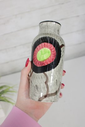 a stylish vintage SMF Schramberg art pottery vase, made in Germany and showcasing classic mid-century modern design. This eye-catching piece features a textured gray-toned glaze with a bold circular motif in vibrant red, black, and green, creating a striking focal point.
