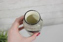 The vase has a clean, cylindrical form with a slightly flared neck, making it ideal for displaying flowers or as a standalone decorative accent. The combination of neutral tones and bright geometric design reflects the distinctive aesthetic of German mid-century ceramics.