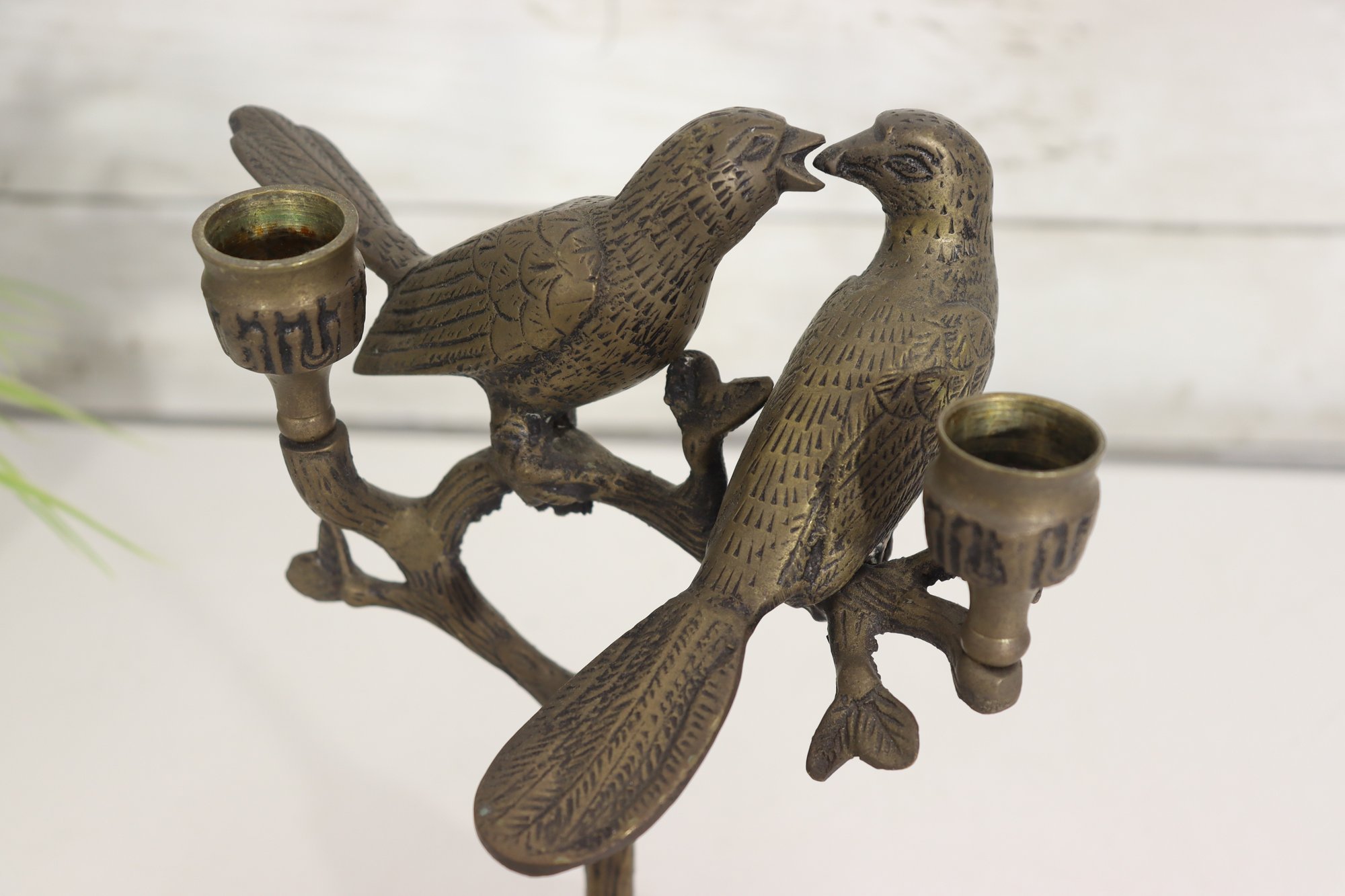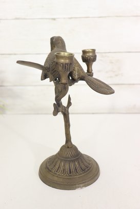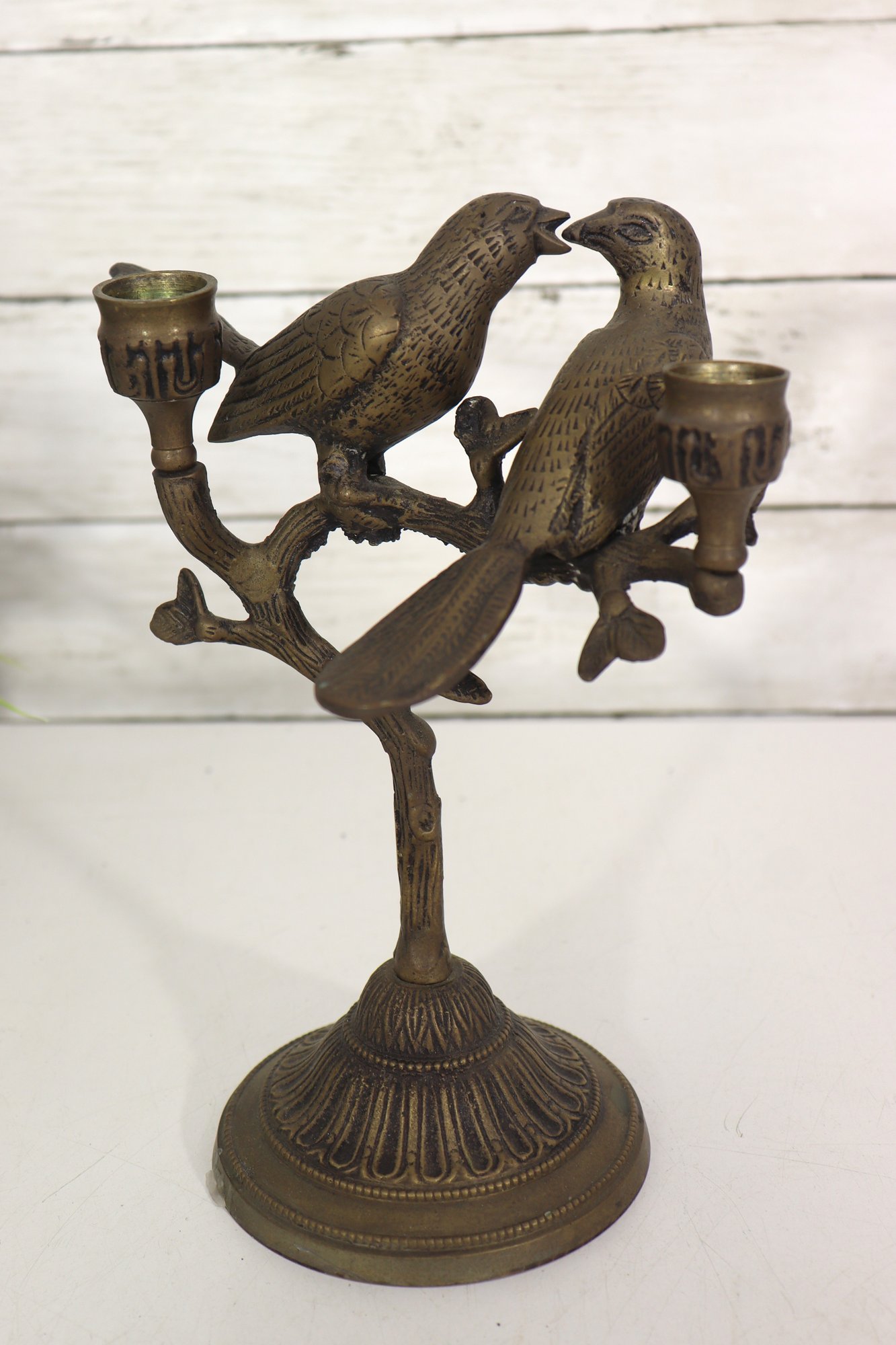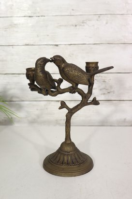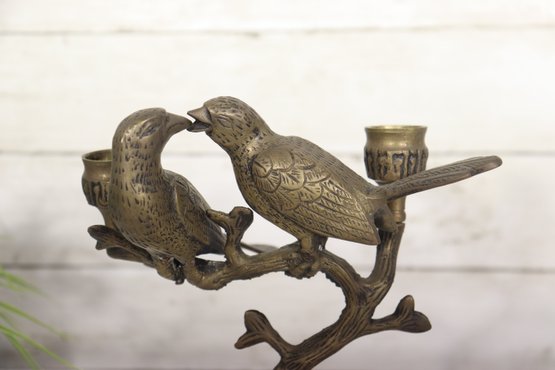 Charming and full of vintage character, this solid brass candle holder features two beautifully detailed birds perched on a branch, sharing a tender moment. Standing 9.5 inches tall, it’s designed to hold two taper candles — one at the tip of each branch — creating a warm, romantic ambiance when lit.
