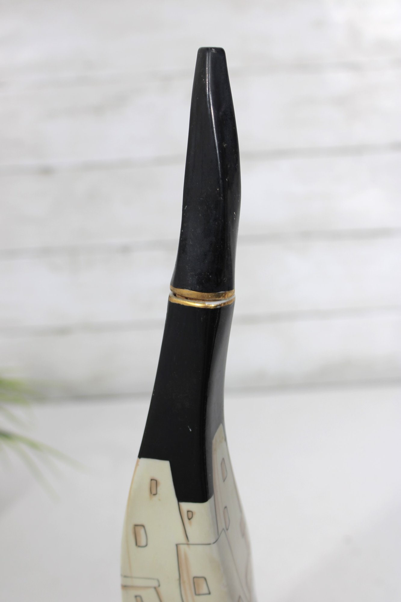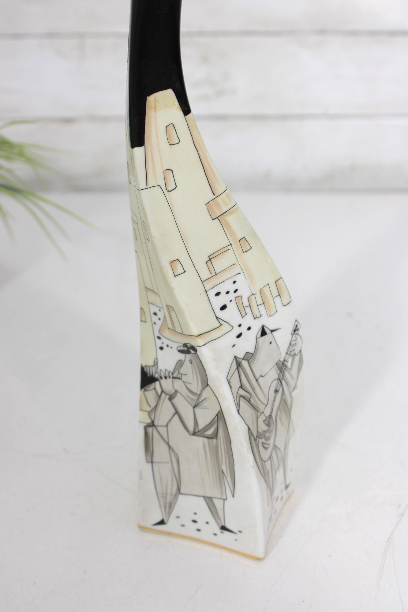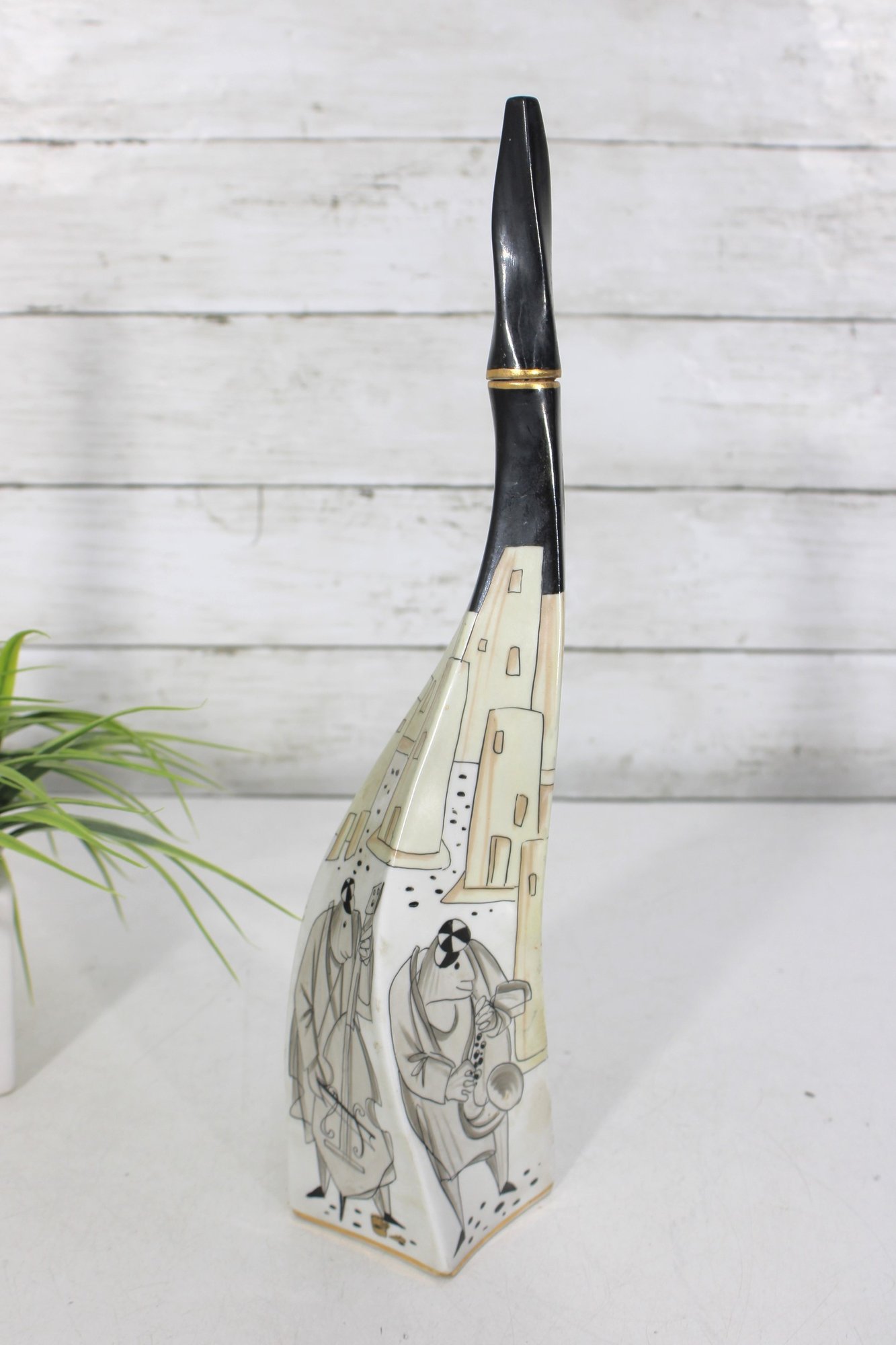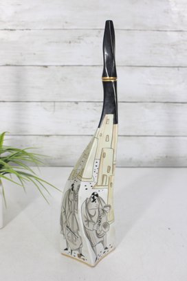 Striking vintage ceramic decanter made in Spain featuring a tall tapered form with black glazed neck and stopper, accented with a gold band detail. The body showcases stylized figural and architectural motifs in a cream, black, and neutral palette.