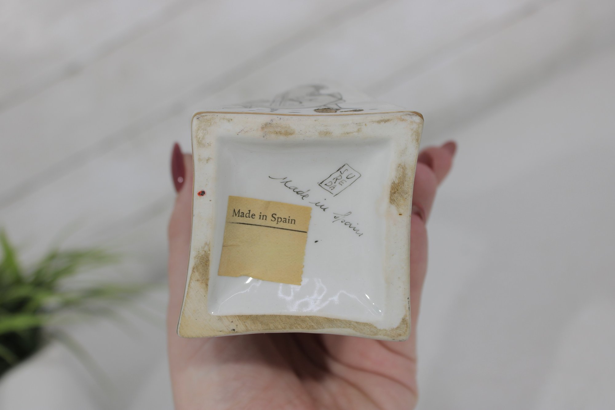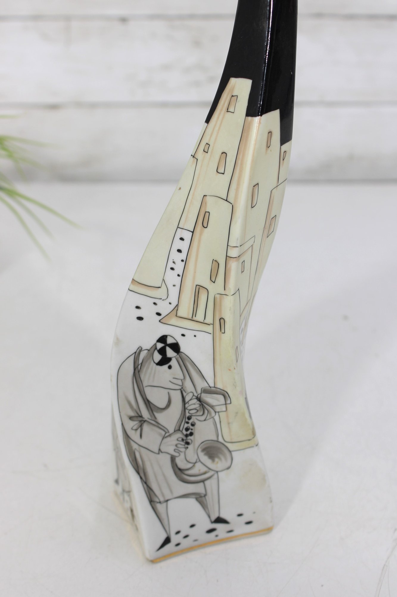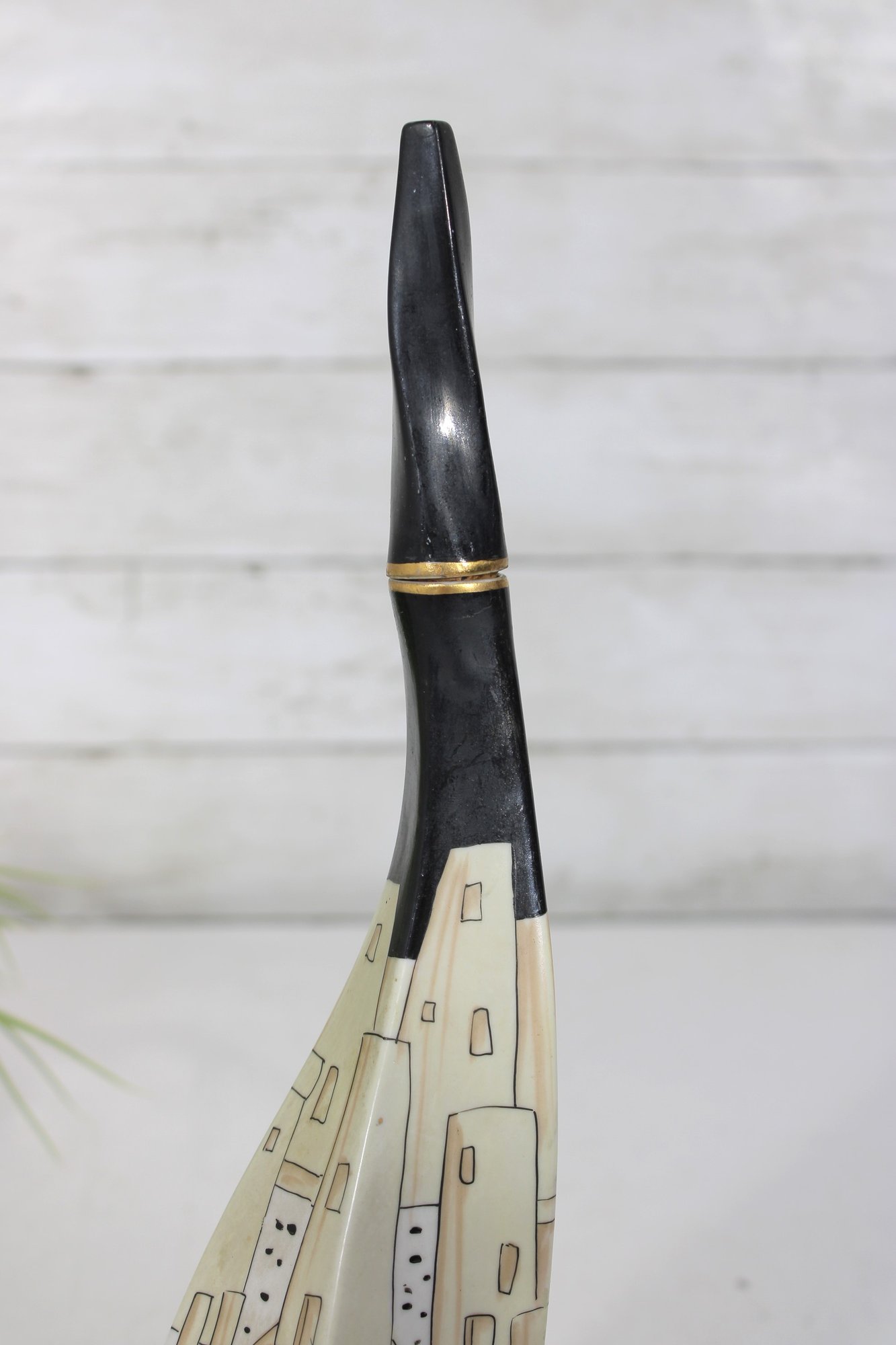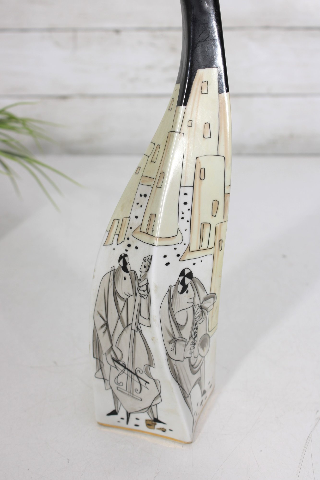 Striking vintage ceramic decanter made in Spain featuring a tall tapered form with black glazed neck and stopper, accented with a gold band detail. The body showcases stylized figural and architectural motifs in a cream, black, and neutral palette.