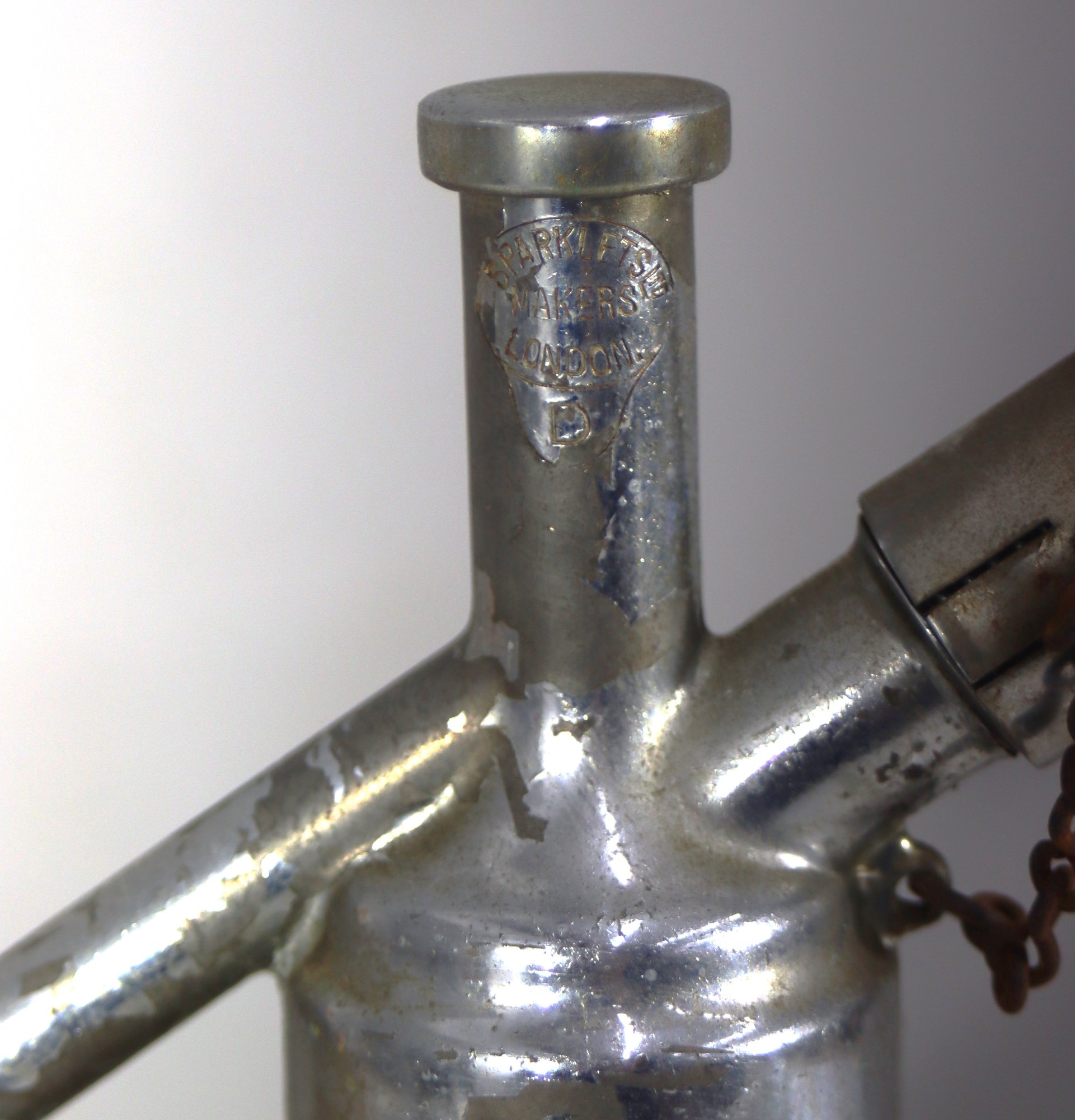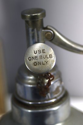 The metal top mechanism, marked "Sparklets Makers London," includes a functional lever and a chain-attached cap that reads "USE ONE BULB ONLY." Though it shows signs of age with some wear and patina, this adds to its vintage charm and authenticity.