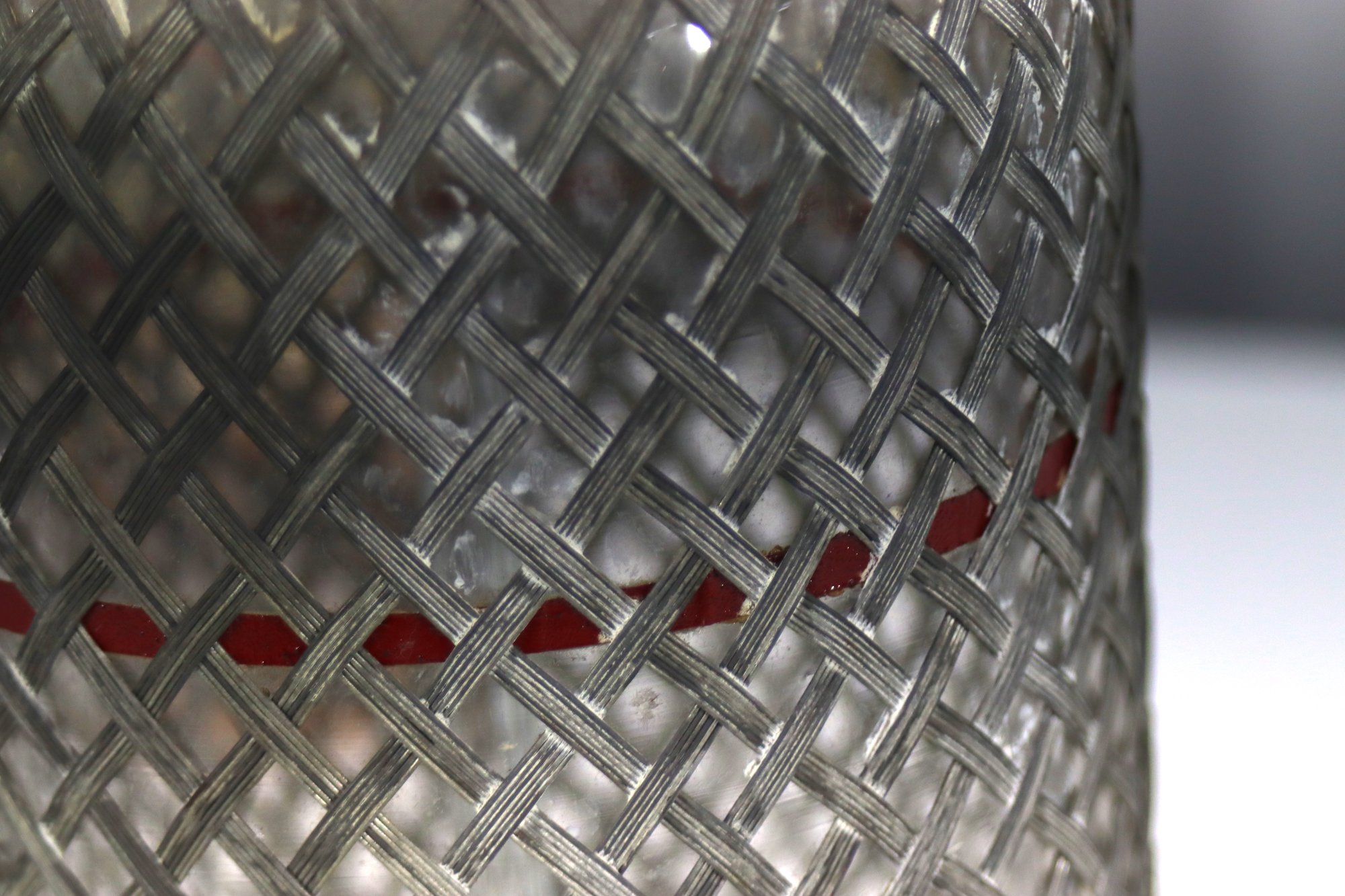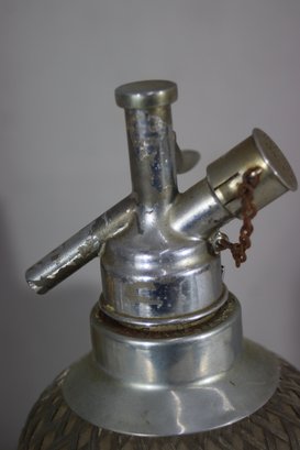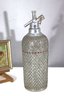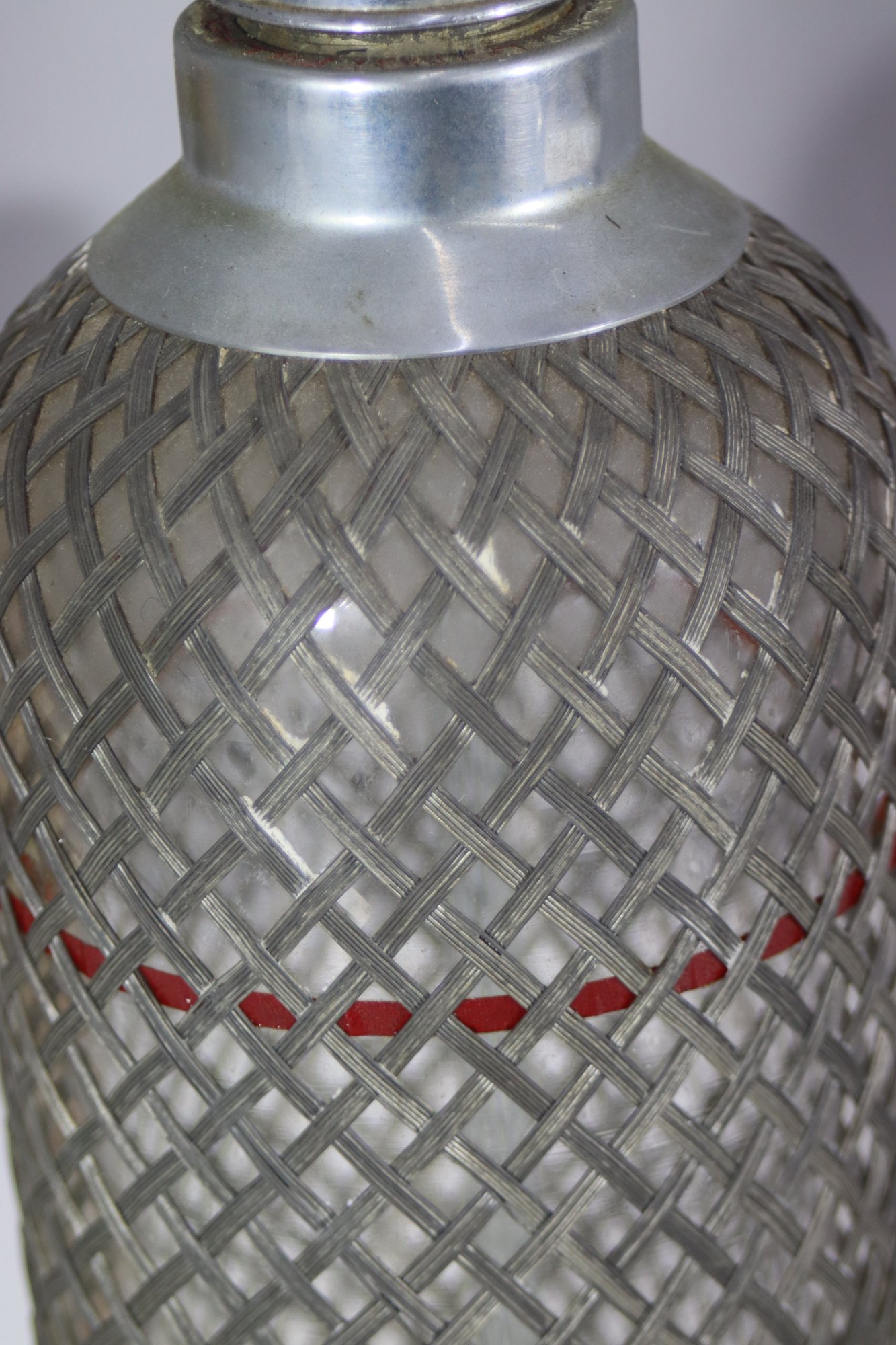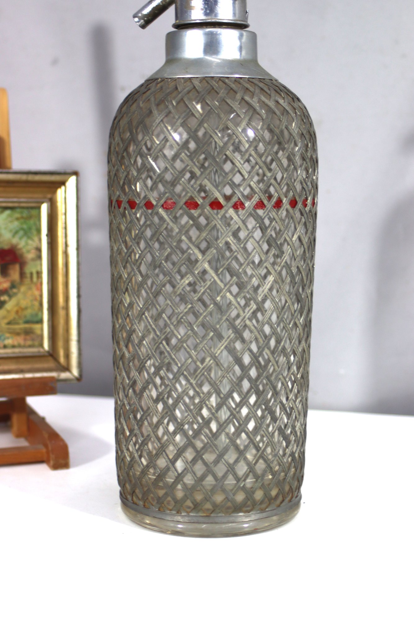 This rare vintage Sparklets London soda syphon is a beautiful collectible from the mid-20th century, perfect for any retro kitchen, barware collection, or décor. The bottle features a classic glass body encased in a woven metal mesh for durability and aesthetic appeal. A striking red stripe accents the midsection, adding to its unique design.