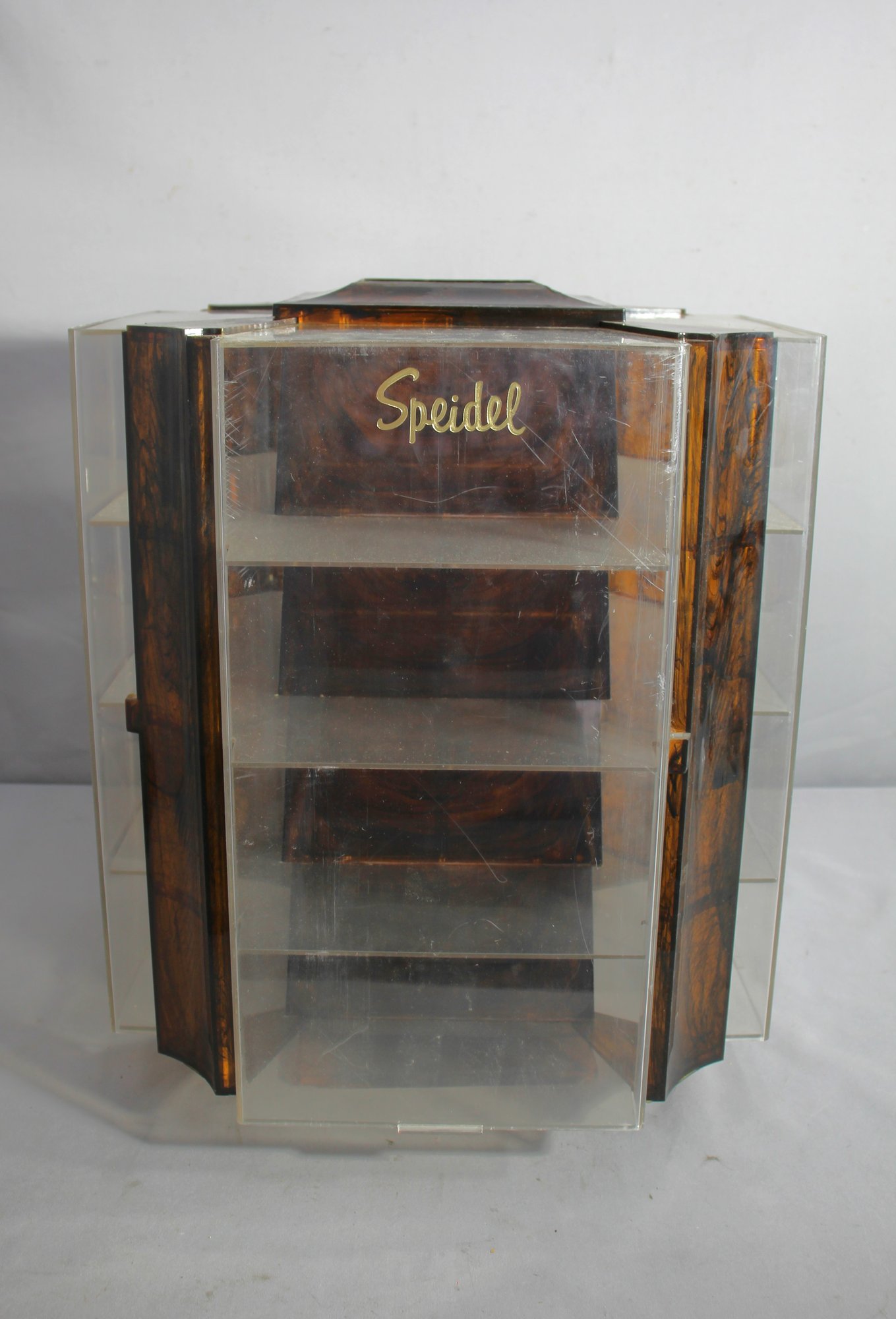 This collector's item combines functionality and style, perfect for showcasing watches, jewelry, or small trinkets. The clear lucite panels allow for unobstructed viewing of the contents adding a touch of classic elegance.Marked with the Speidel logo