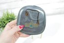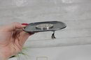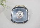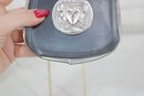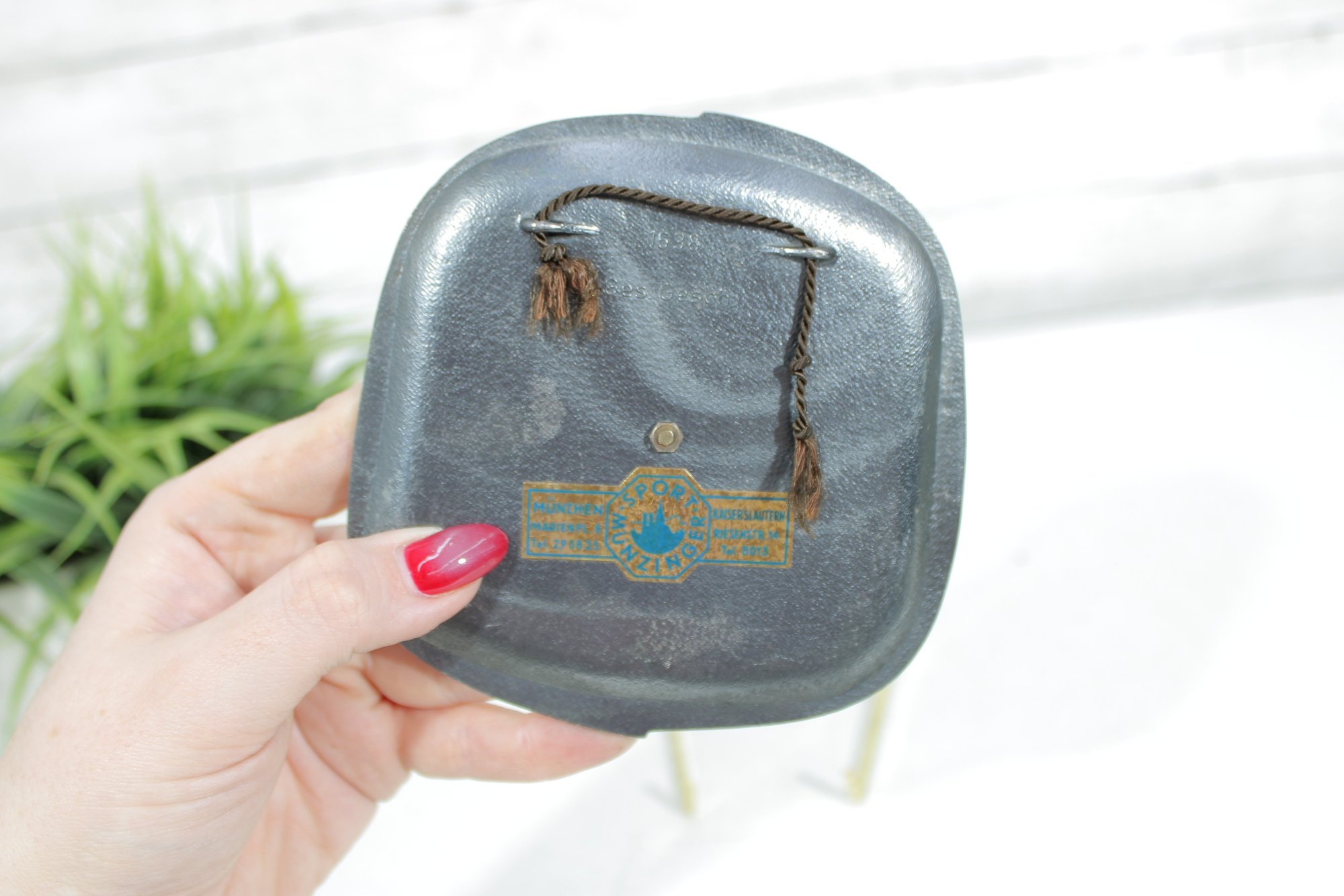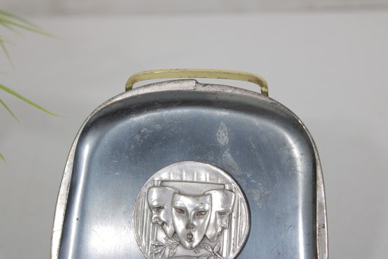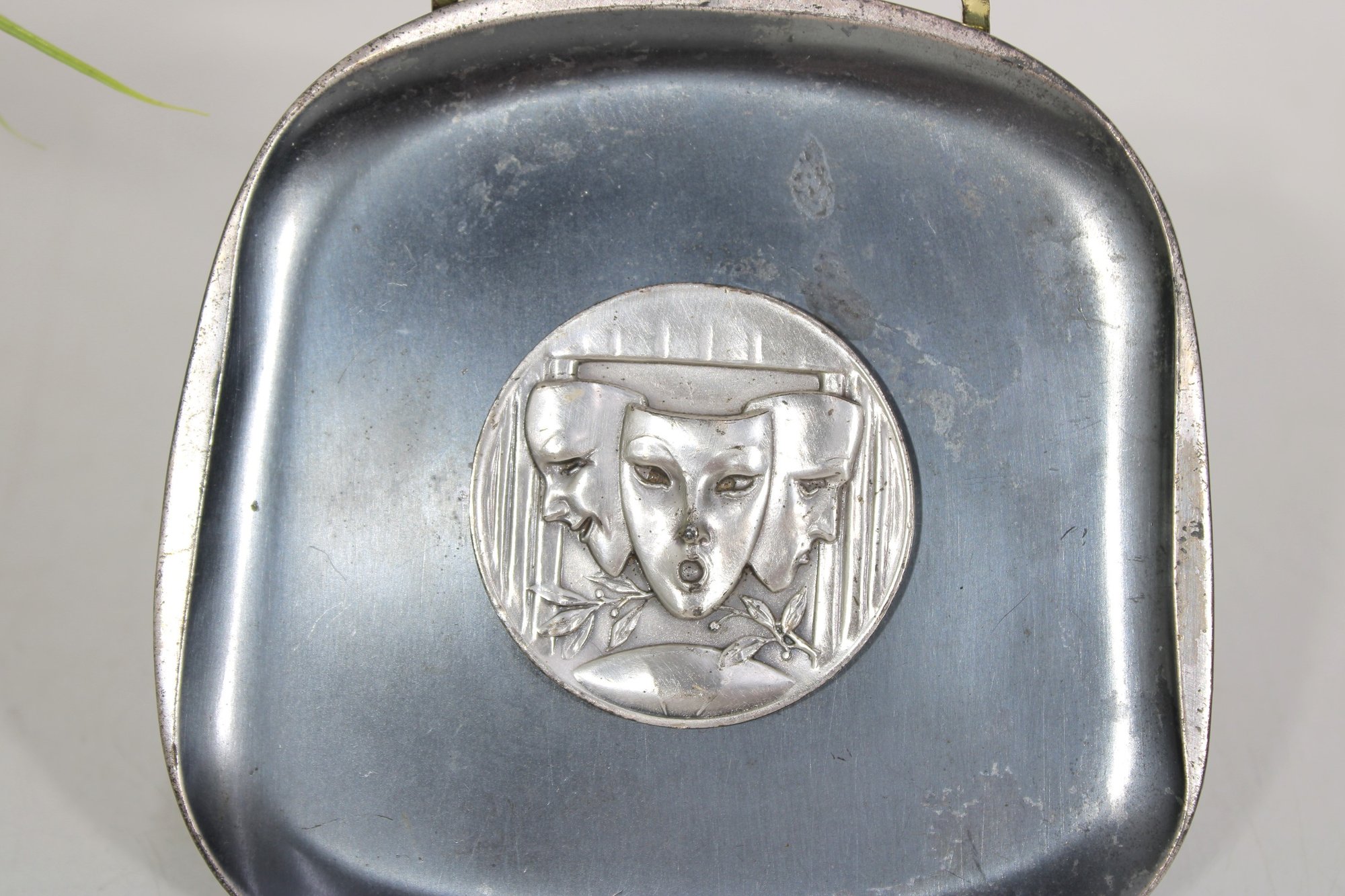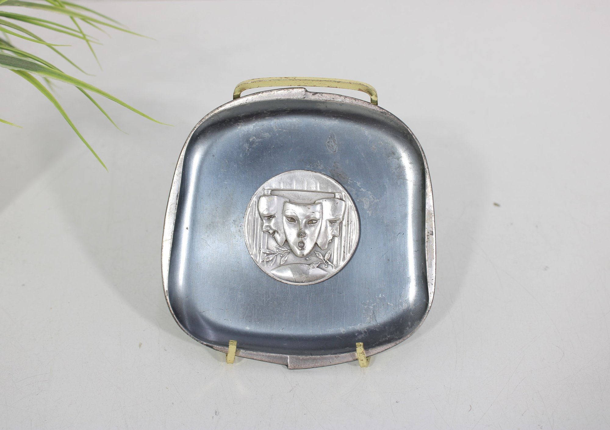 Unique vintage Sport Munzinger metal dish, featuring a striking Art Deco style figural relief at the center. The design depicts stylized faces with geometric lines and a theatrical, mask-like appearance, giving the piece a bold and artistic presence.