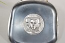 The dish measures approximately 4.5” x 4.5” with softly rounded corners and a slightly concave form. The surface has a brushed metallic finish, enhancing the dimensional relief centerpiece.