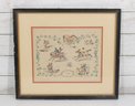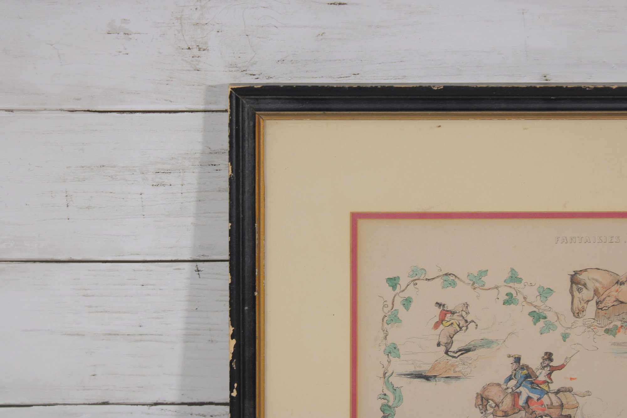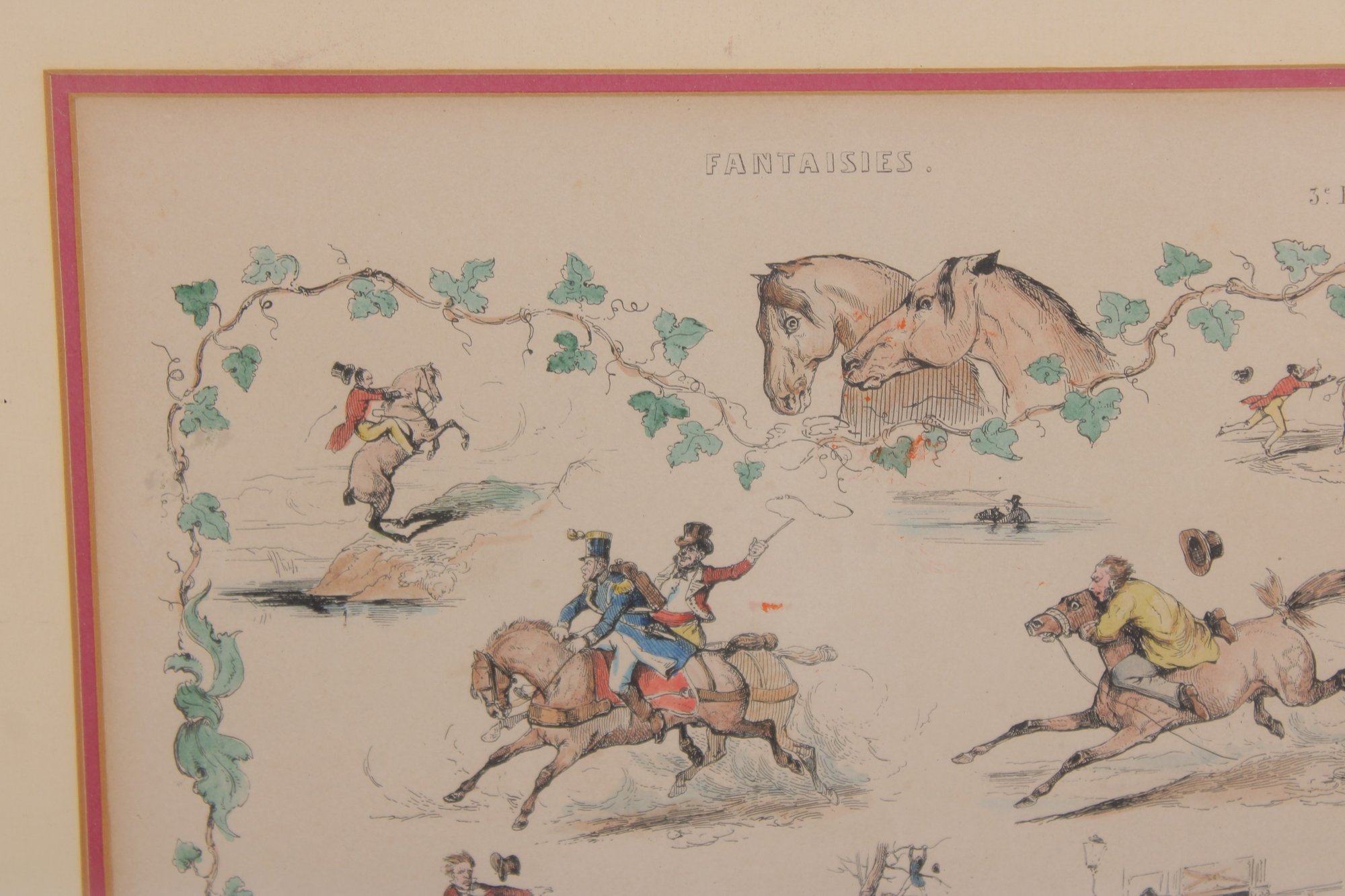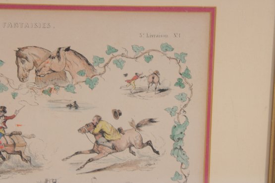vintage equestrian sporting print titled “Fantaisies” after the work of V. Adam. The illustration features several lively horse and rider scenes arranged in a decorative composition surrounded by a vine-style border.