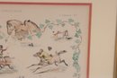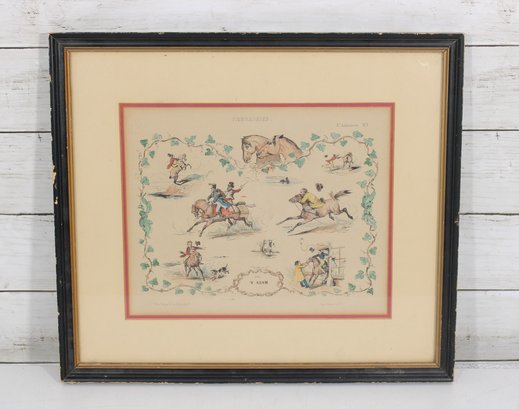 The print includes multiple small vignettes of riders in motion, humorous equestrian moments, and horse studies, all rendered in a delicate, hand-colored style typical of 19th-century European sporting illustrations.