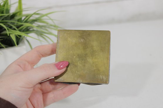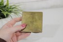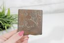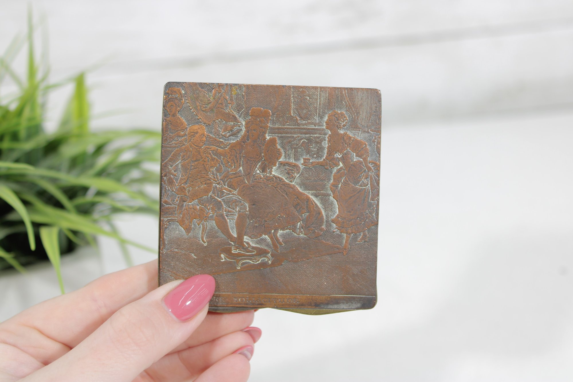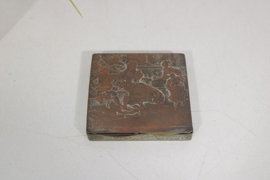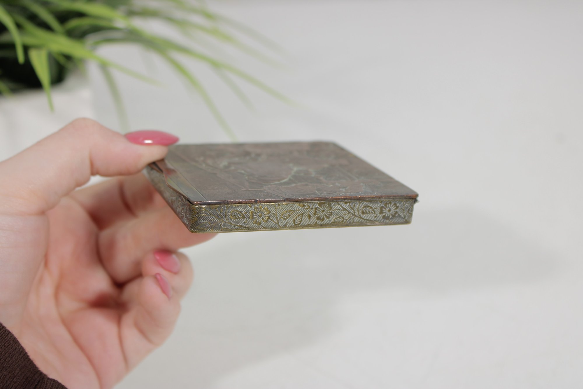 Beautiful vintage square powder compact featuring an engraved figural scene on the lid. The design appears to depict classical or pastoral figures in motion, giving the compact an elegant antique-inspired decorative look.