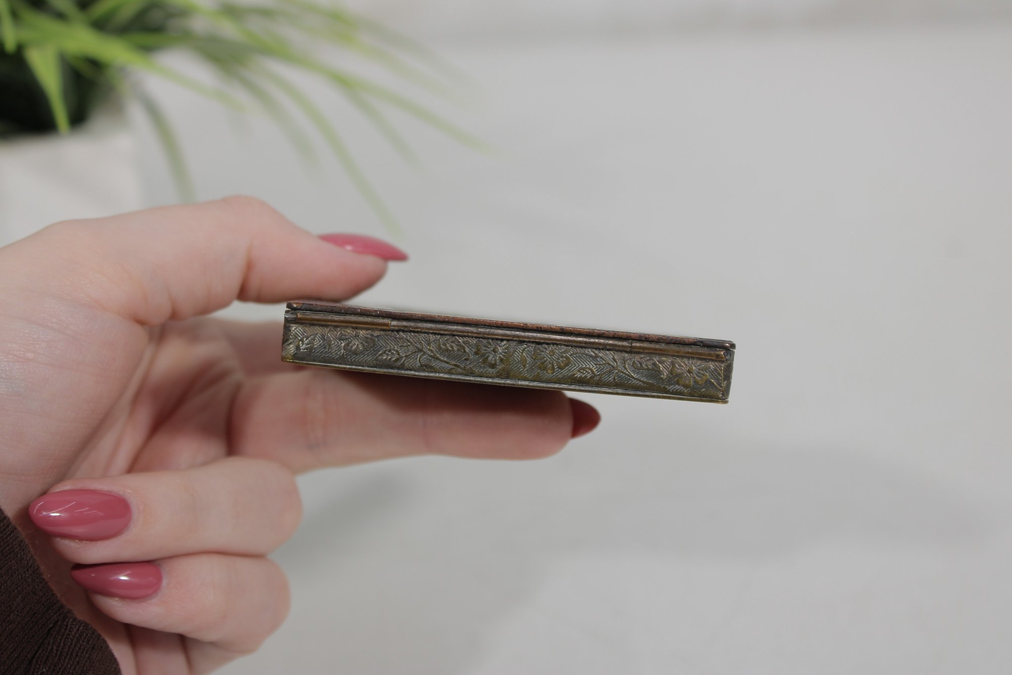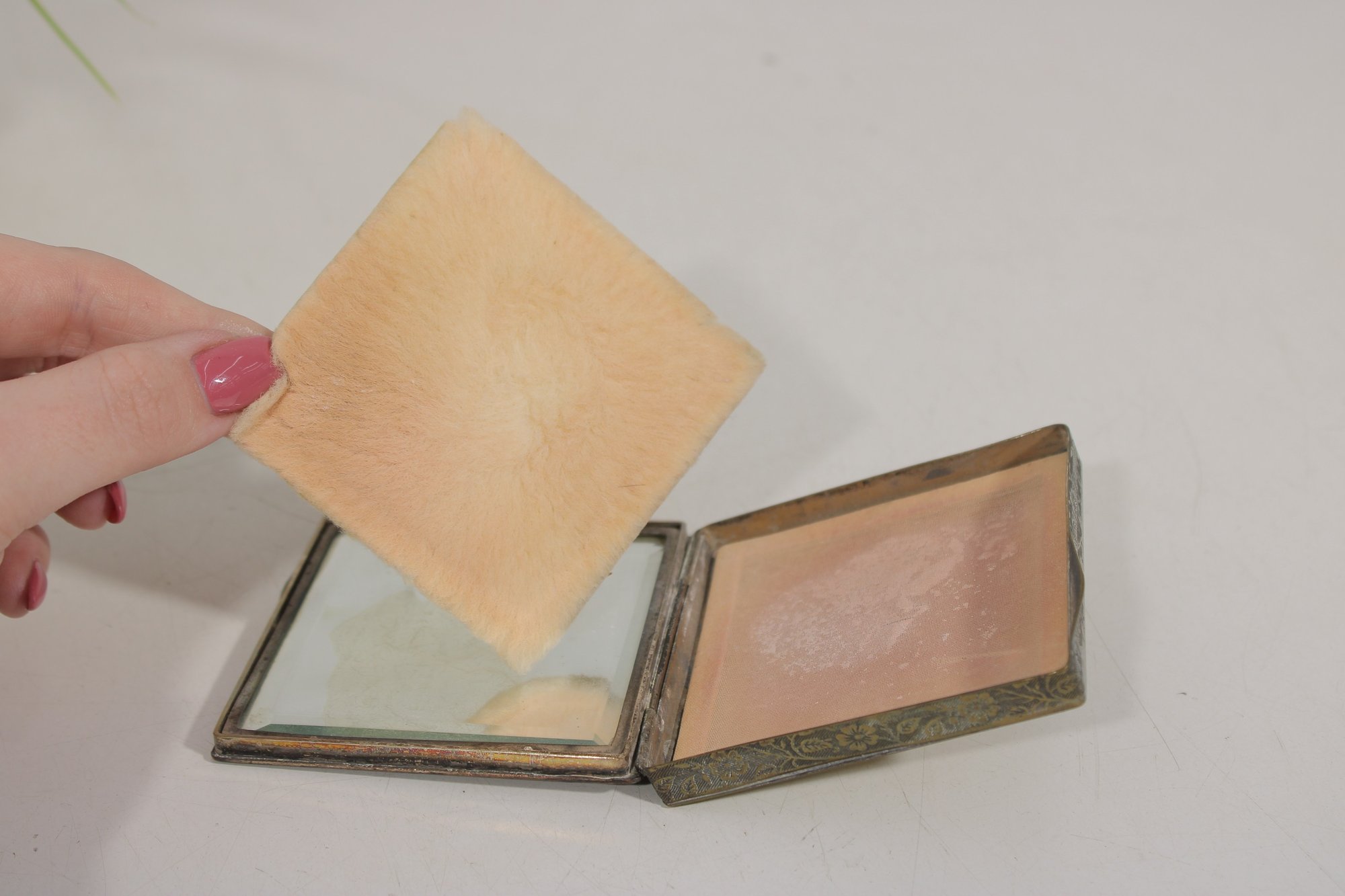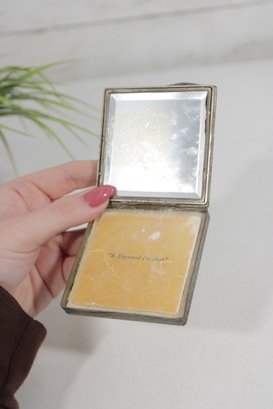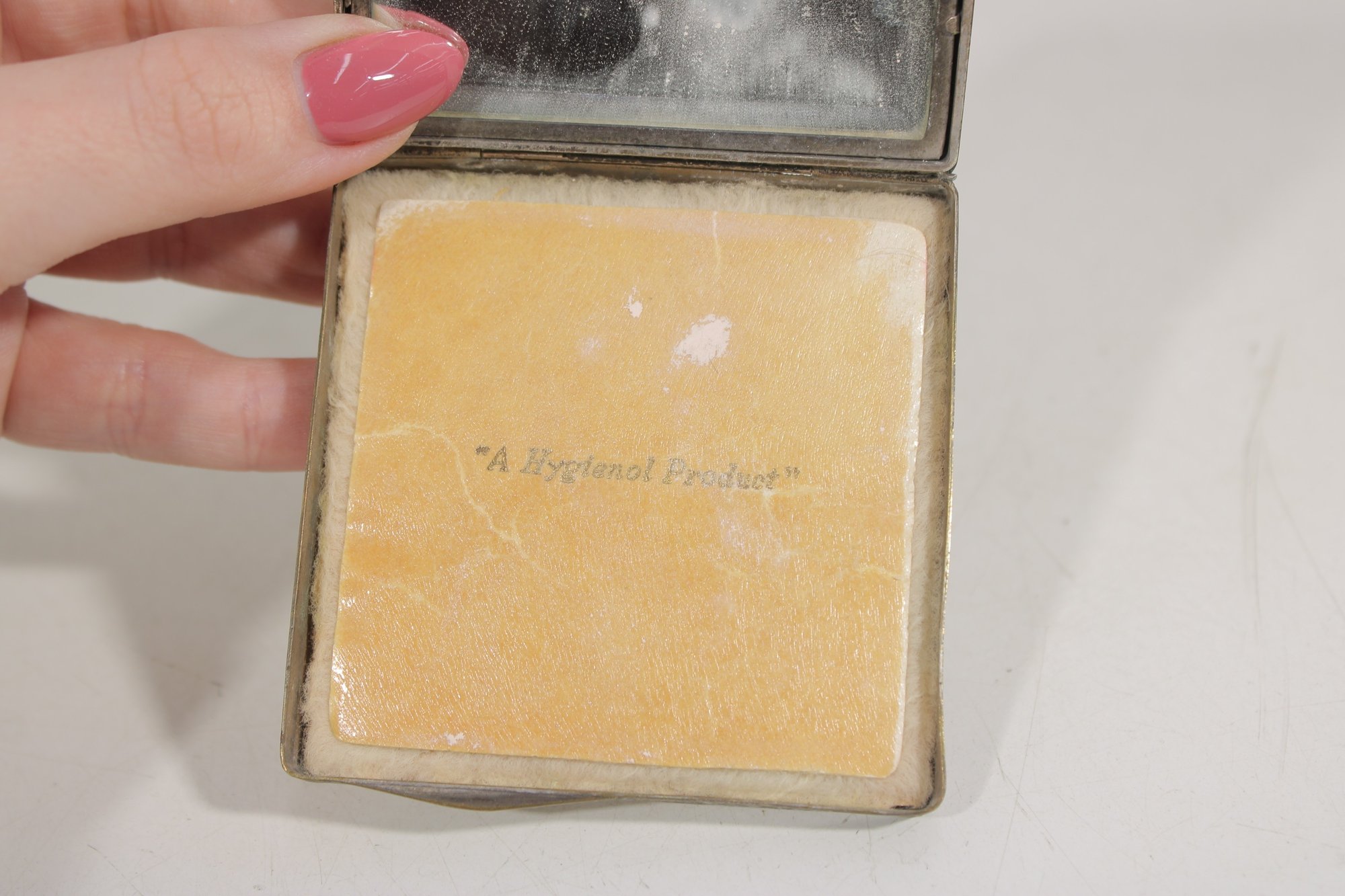 The compact opens to reveal an interior mirror and the original powder compartment with puff. The inside puff is marked “A Hygienol Product ,” referencing the well-known historic French perfume house, making this an interesting collectible vanity piece.