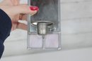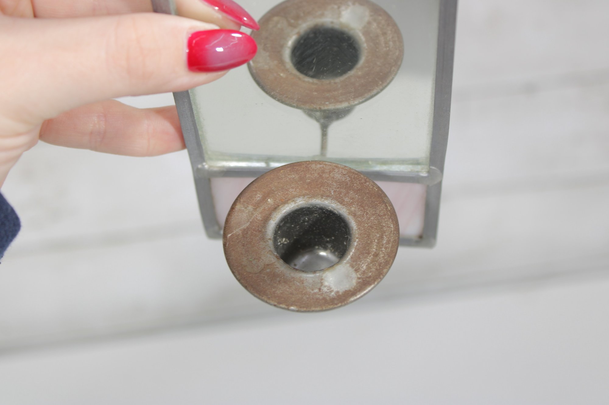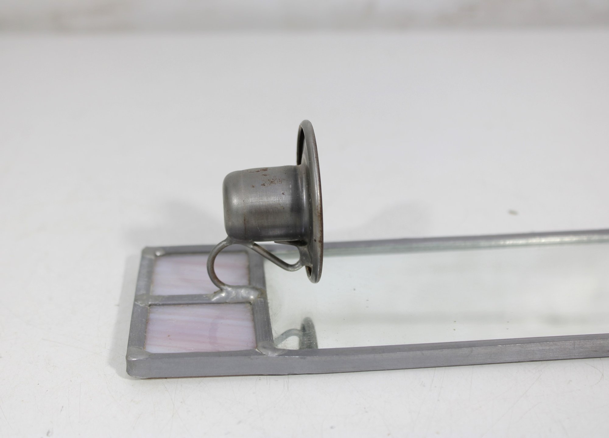 The metal candle holder is positioned near the base and is suitable for a small taper or votive-style candle (liner recommended depending on use).