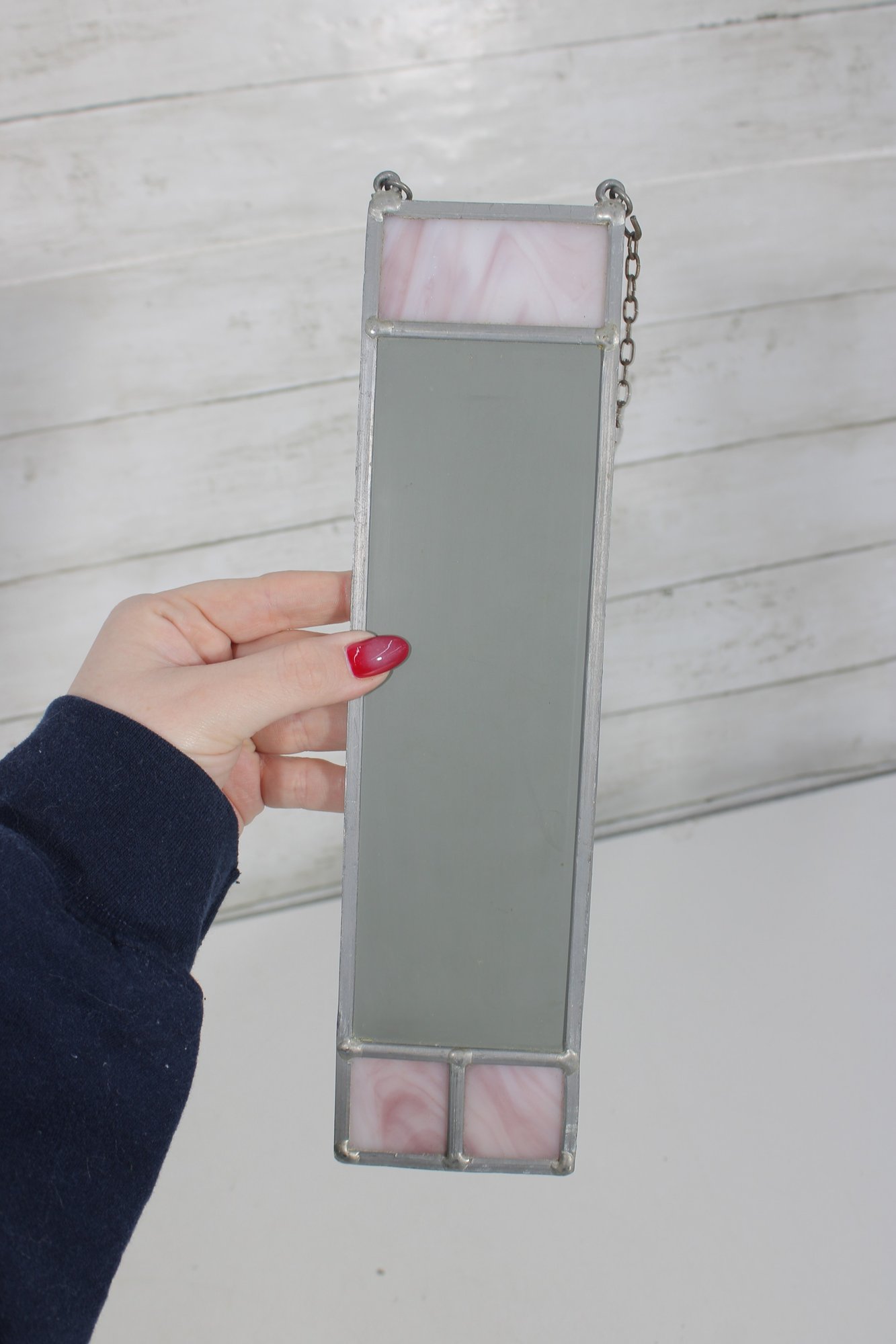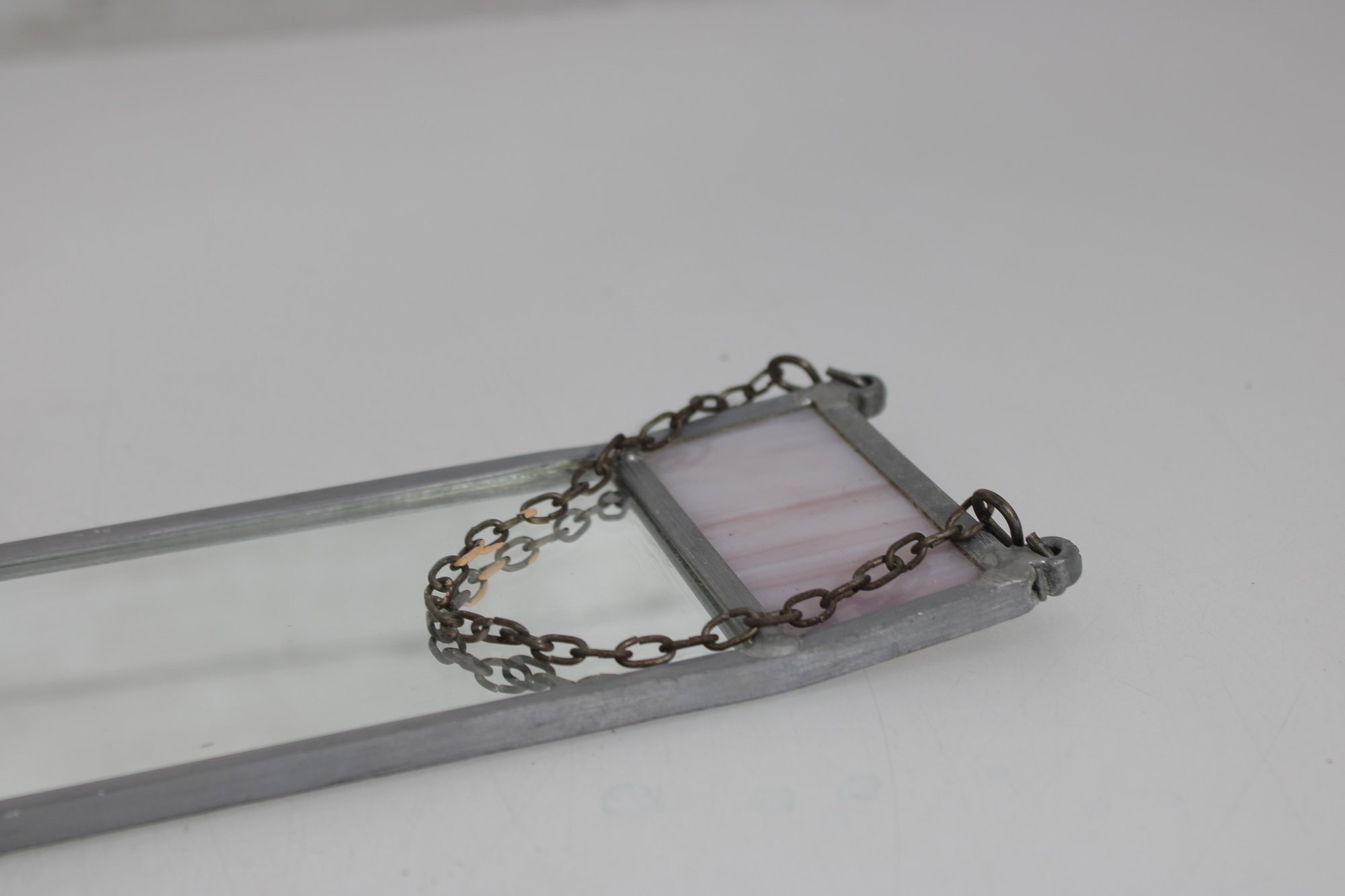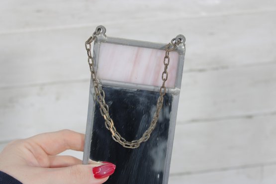 The design showcases a central blue-toned glass panel framed by pale pink accents at the top and bottom, all bordered by metal leading. The attached chain drapes across the front, adding a subtle decorative element and vintage character.