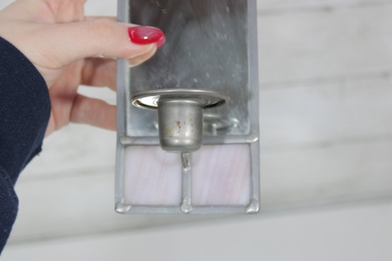 vintage stained glass wall sconce featuring a narrow vertical design with soft pink and deep blue glass panels. This decorative piece includes a metal candle cup and a hanging chain, allowing for easy wall display while adding a warm, ambient touch to any space.