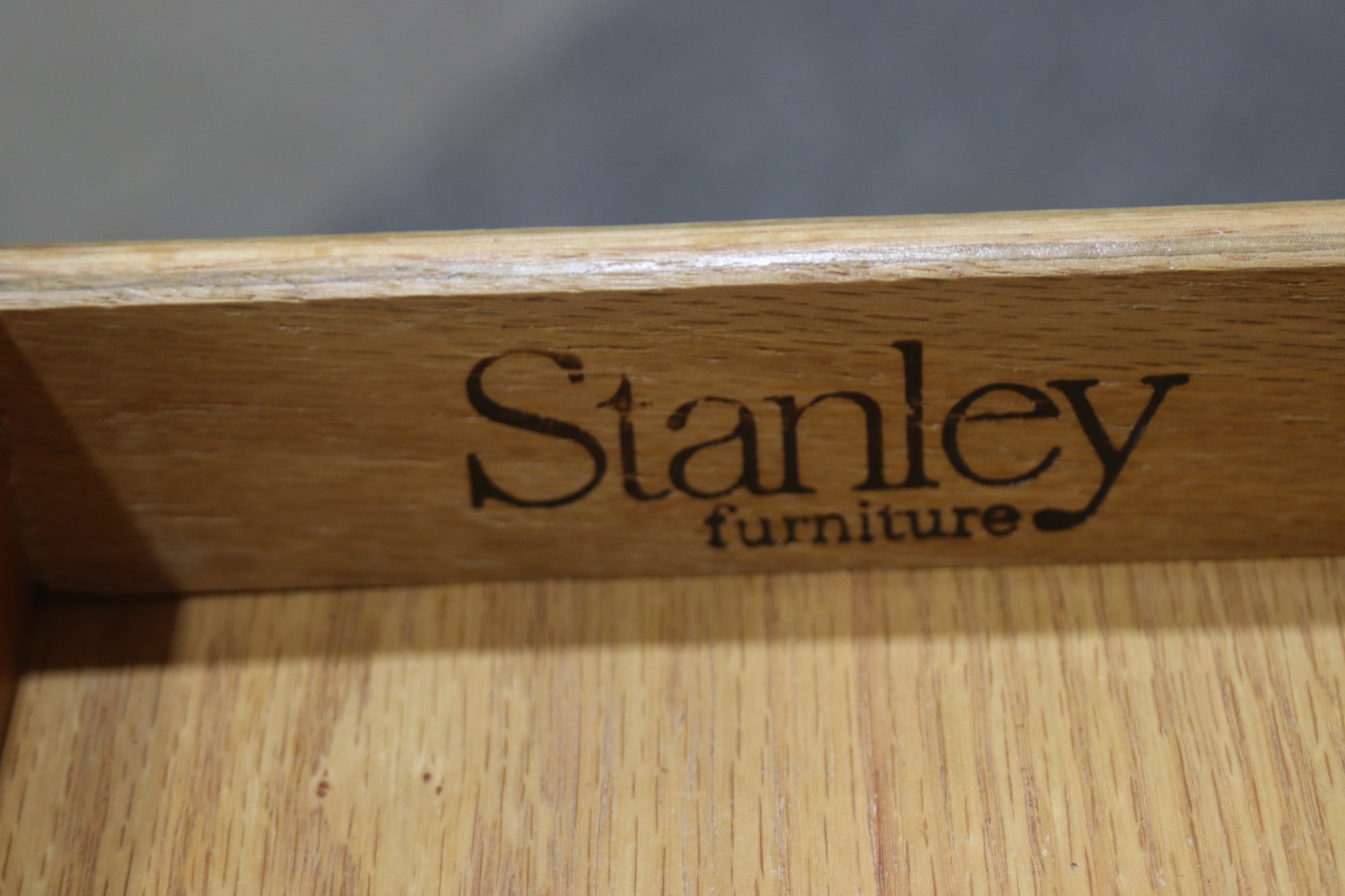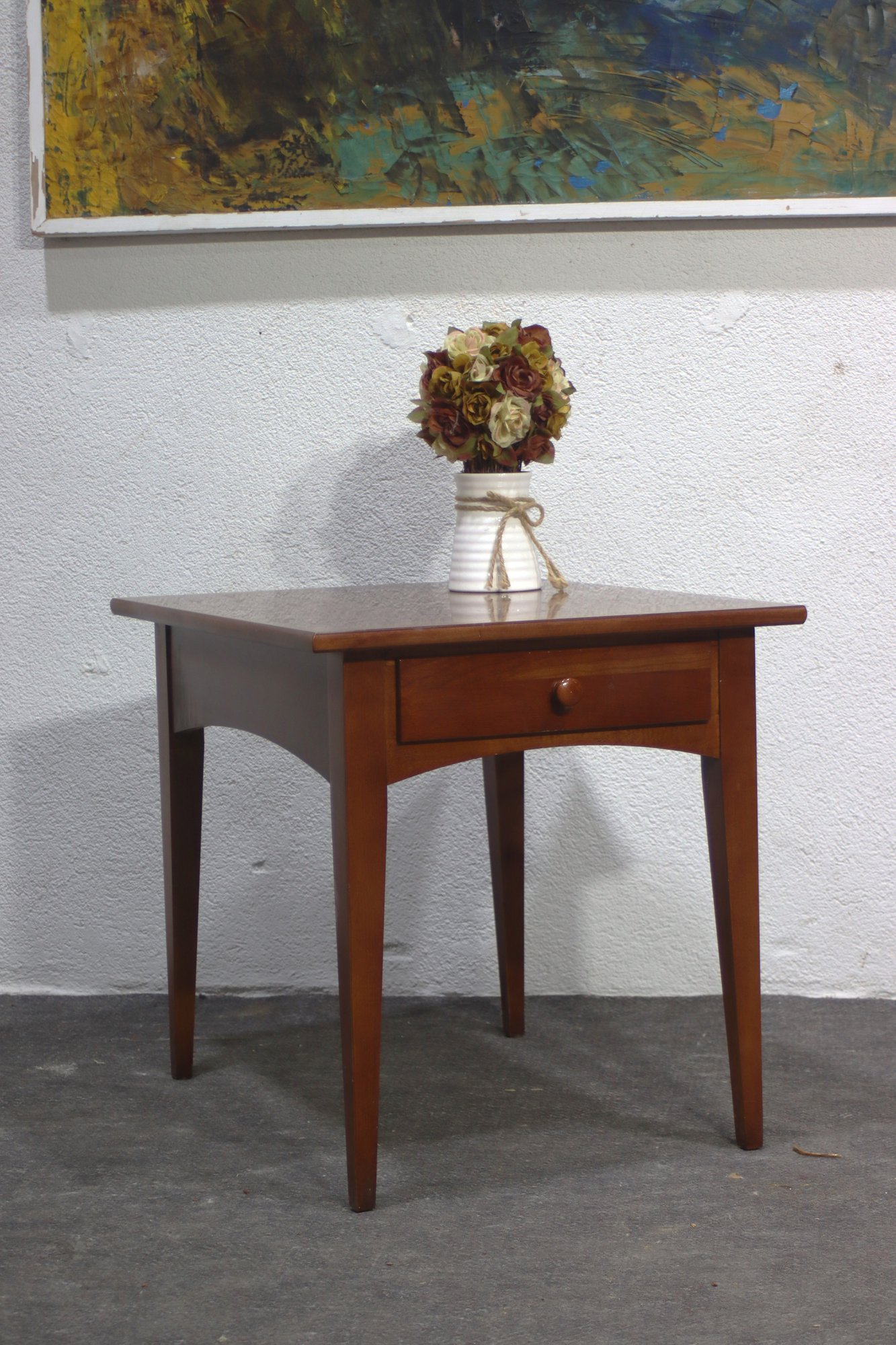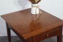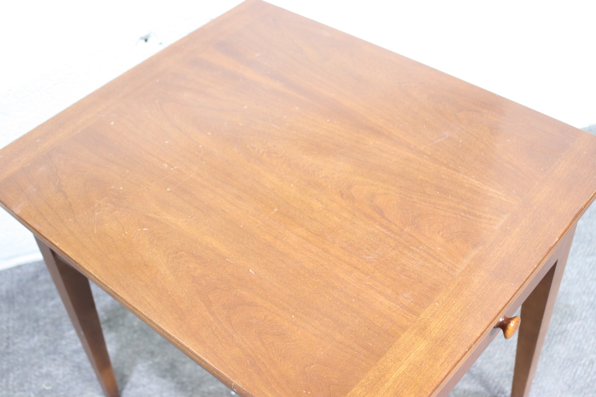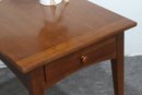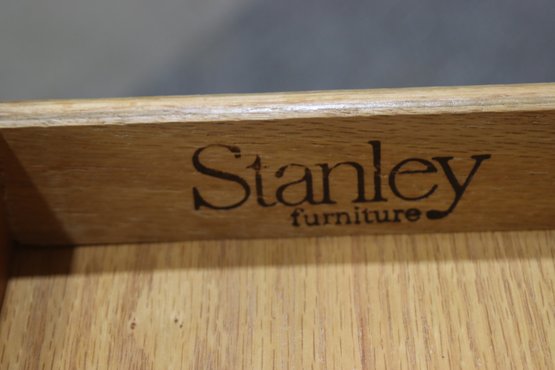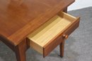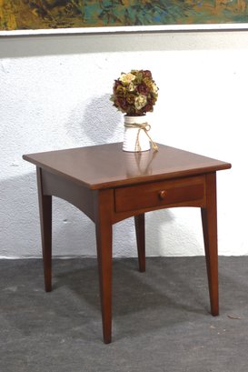 vintage Stanley Furniture side table is a beautifully crafted piece featuring a warm wood finish, tapered legs, and a single storage drawer. Its mid-century modern-inspired design makes it a timeless addition to any living space, offering both function and style.