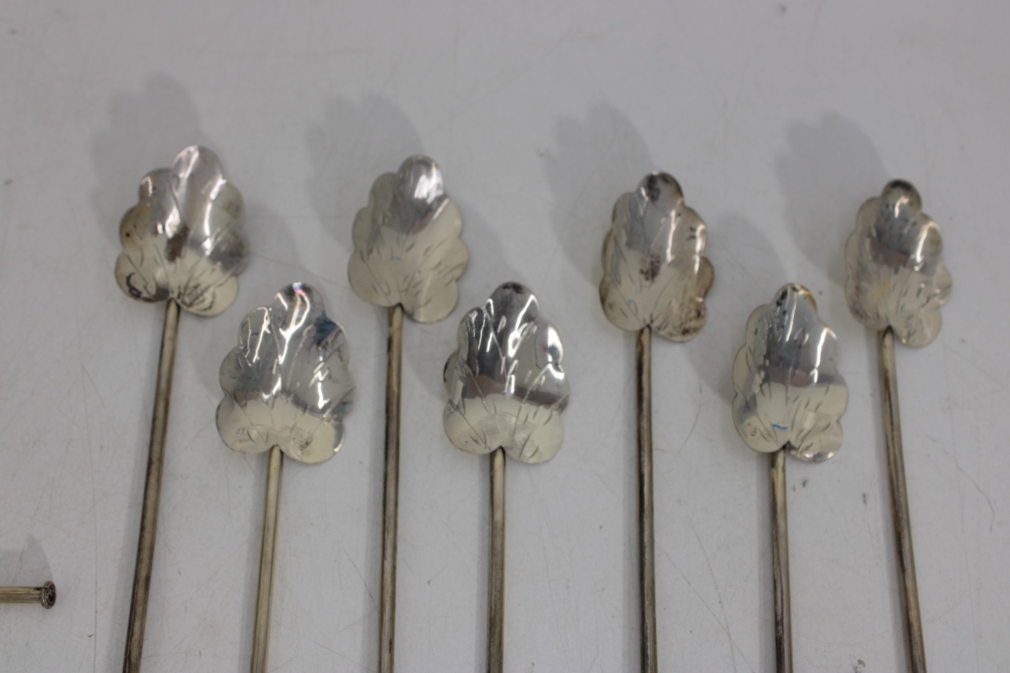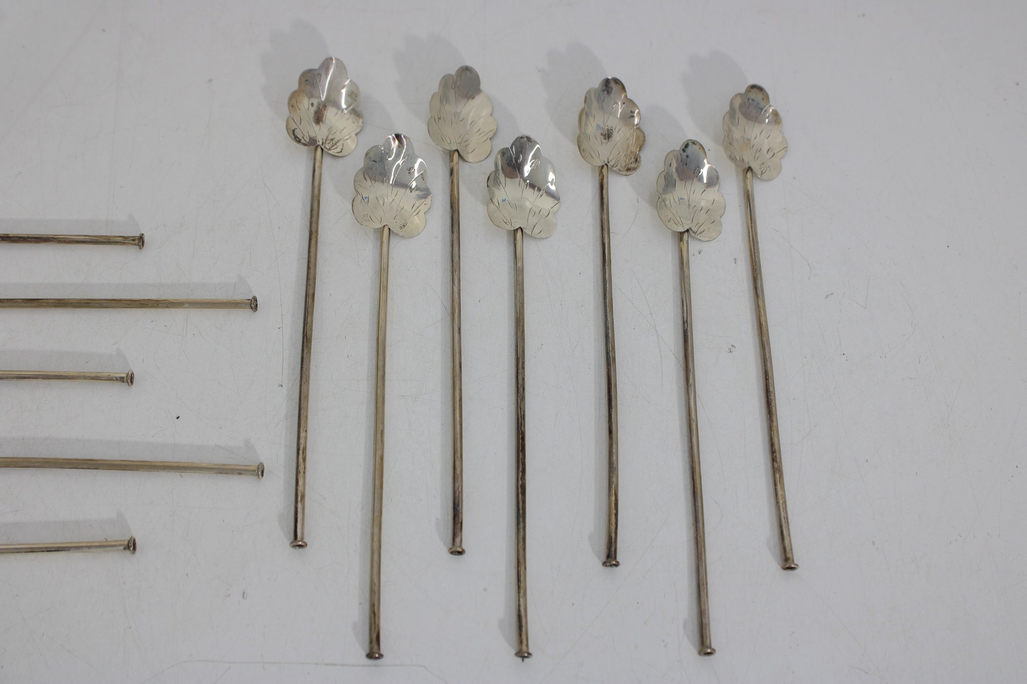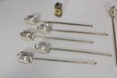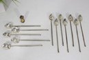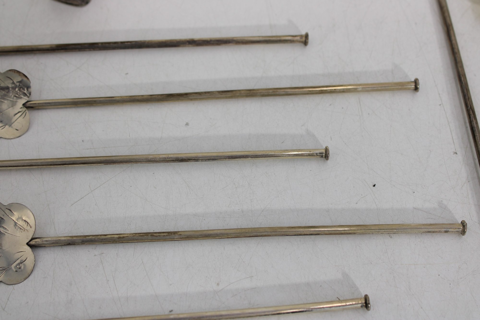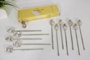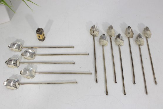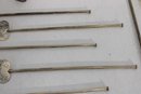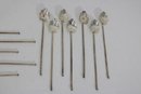 Set of 10 vintage silver cocktail picks / stir sticks, presented in original box. Each pick features a decorative clover or stylized leaf top with long slender shaft, ideal for cocktails, olives, or appetizer presentation.