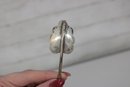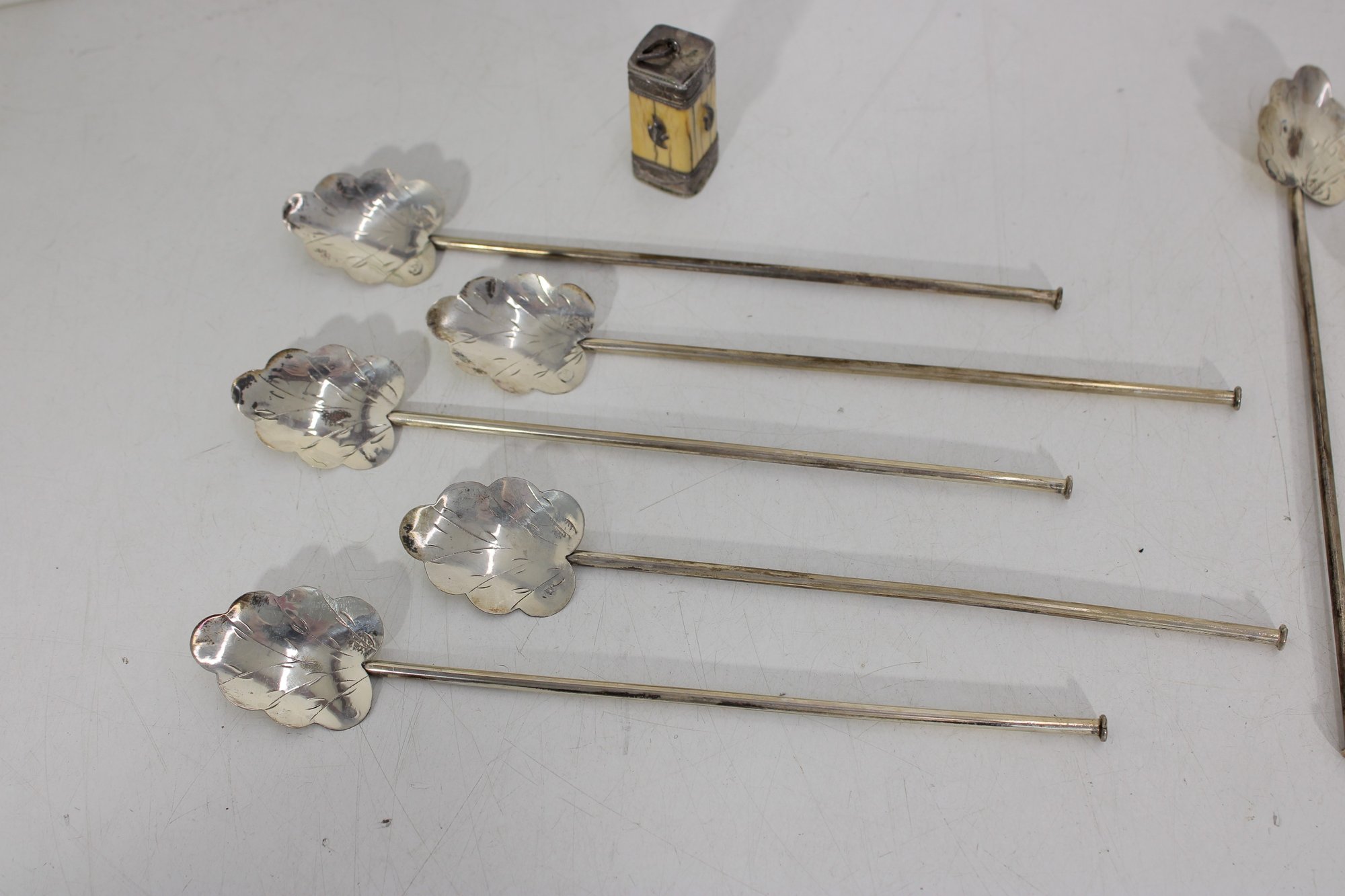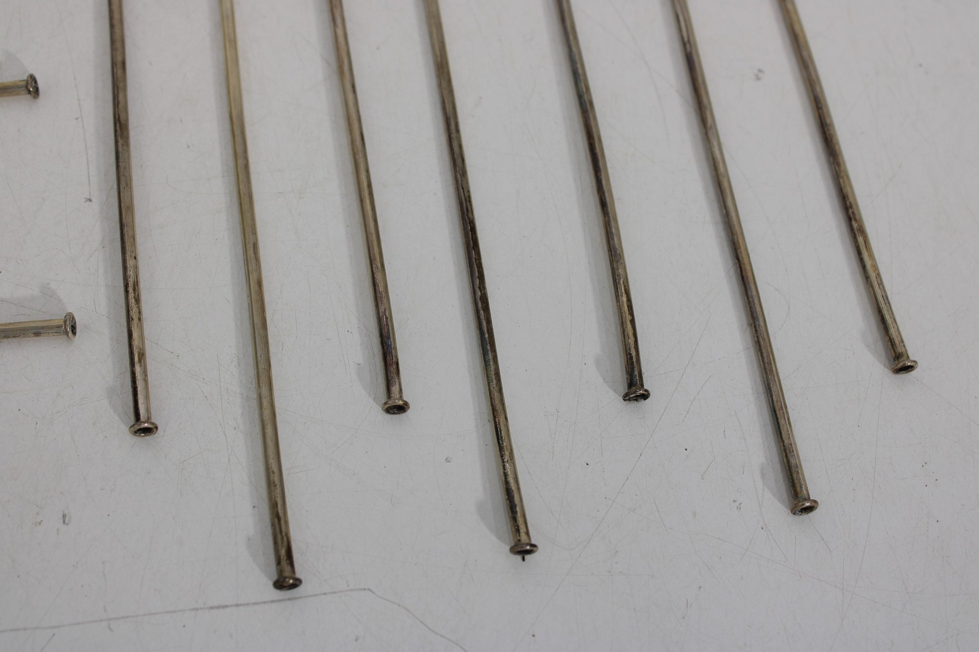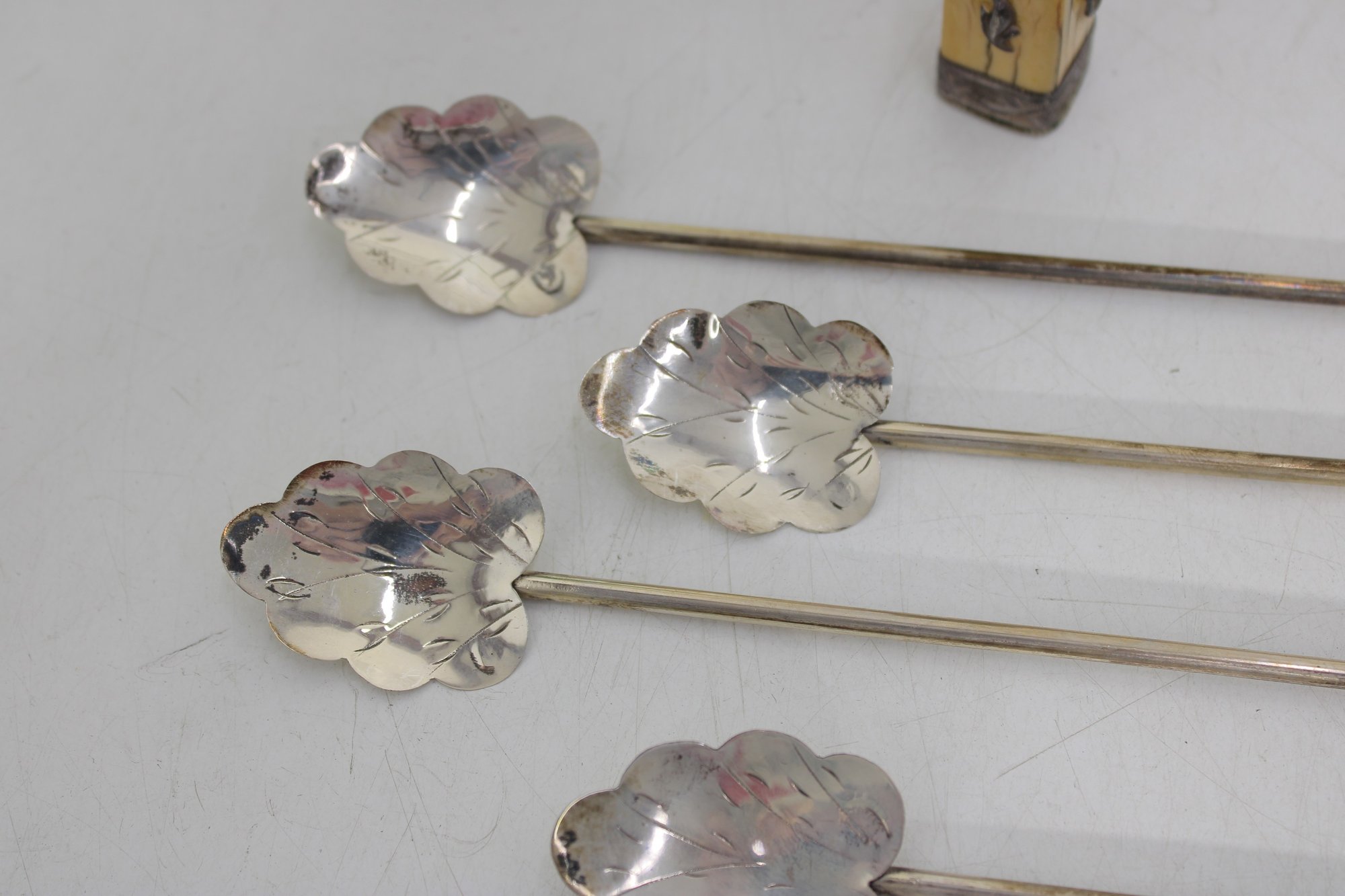 Set of 10 vintage silver cocktail picks / stir sticks, presented in original box. Each pick features a decorative clover or stylized leaf top with long slender shaft, ideal for cocktails, olives, or appetizer presentation.
