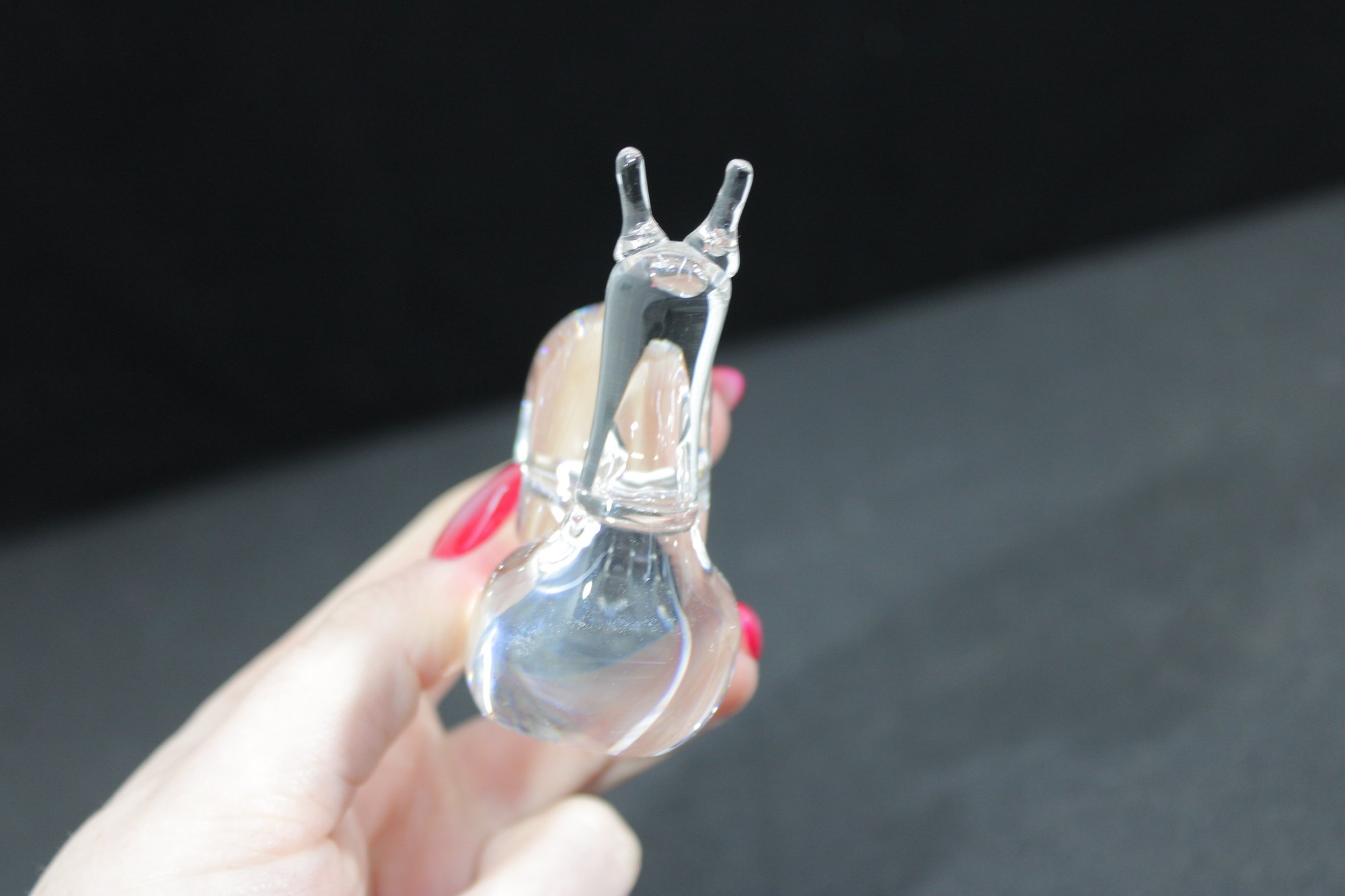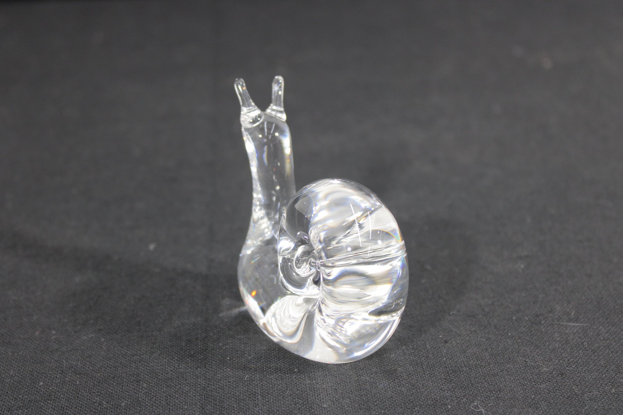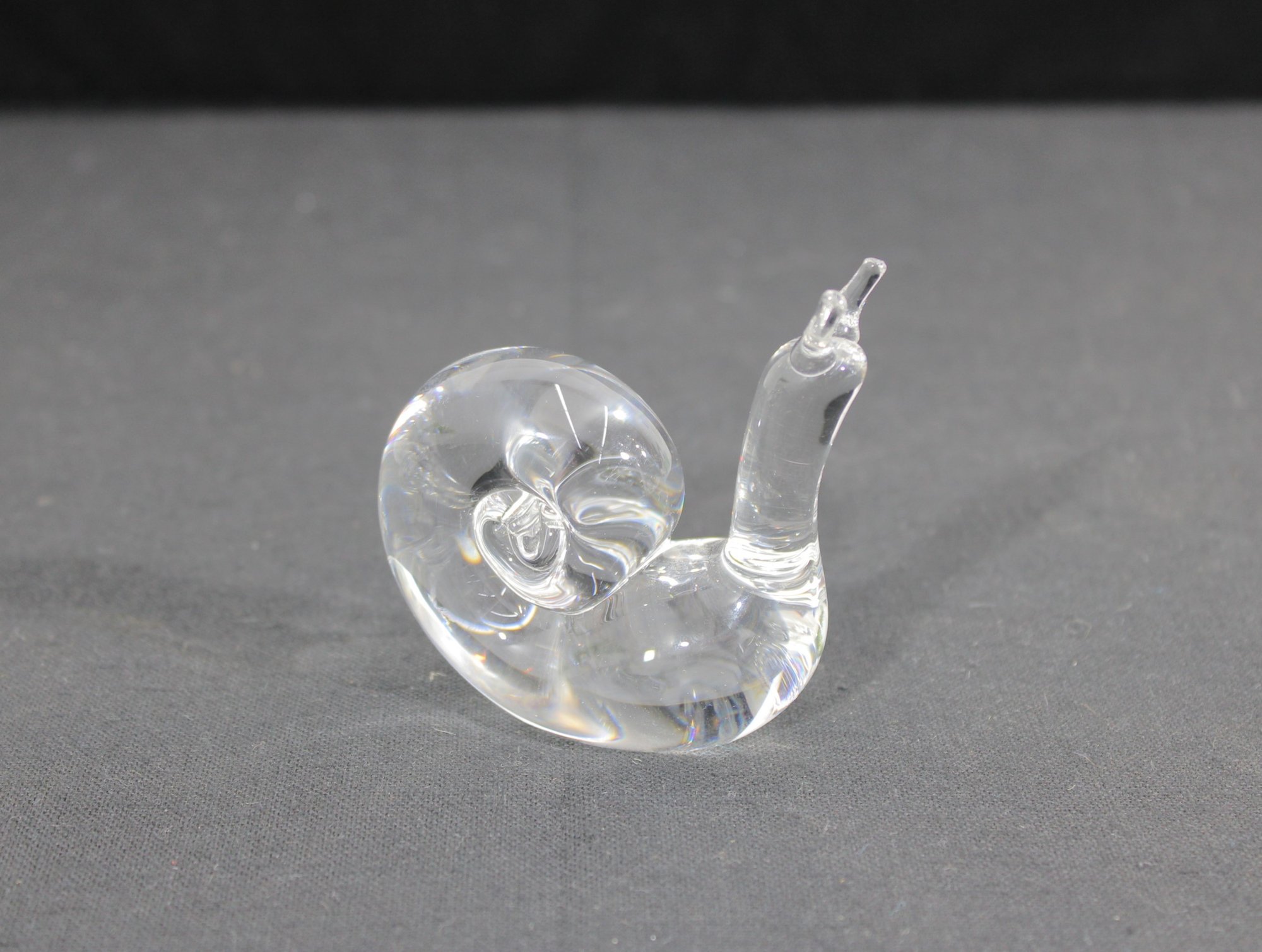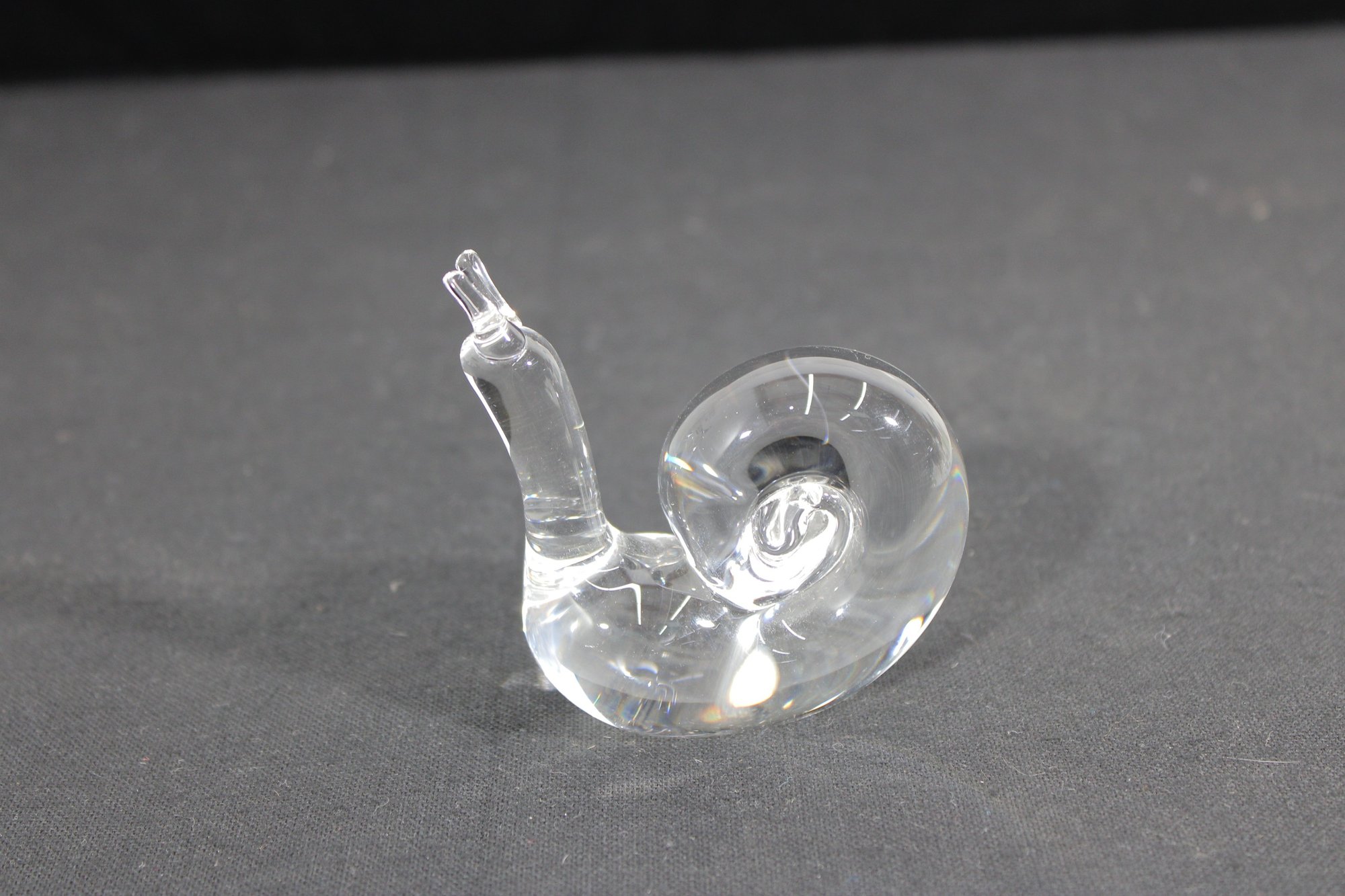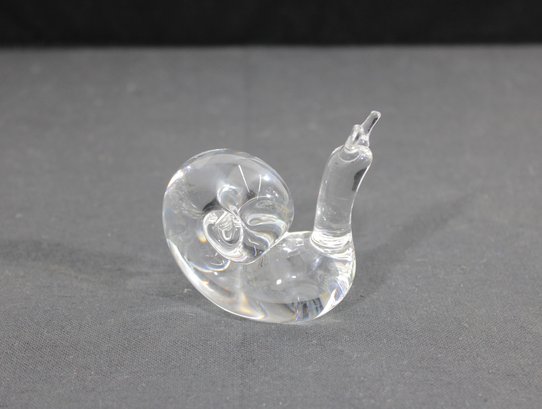 vintage clear crystal snail figurine, beautifully crafted with smooth, fluid lines and a modern sculptural form. The piece features a gracefully curved body and a detailed spiral shell, capturing the simplicity and refinement typical of fine art glass.