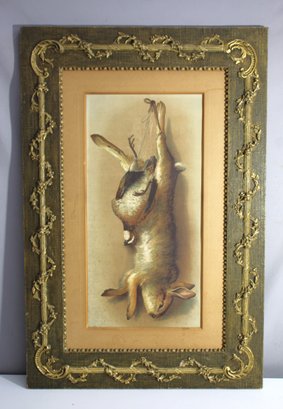 A striking vintage still-life print featuring a meticulously detailed depiction of a hanging rabbit and game bird. The image, rich in texture and lifelike realism, brings the hunting tradition to life with its soft colors and masterful shading. This print is mounted in a beautifully ornate, gold-toned frame that complements the natural subject. There is visible patina, and light signs of wear consistent with age, adding to its authentic vintage appeal. Signed in the lower corner. The frame’s wood backing shows signs of age and handling. Ready for display in any collection of wildlife art or rustic décor.
