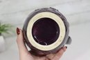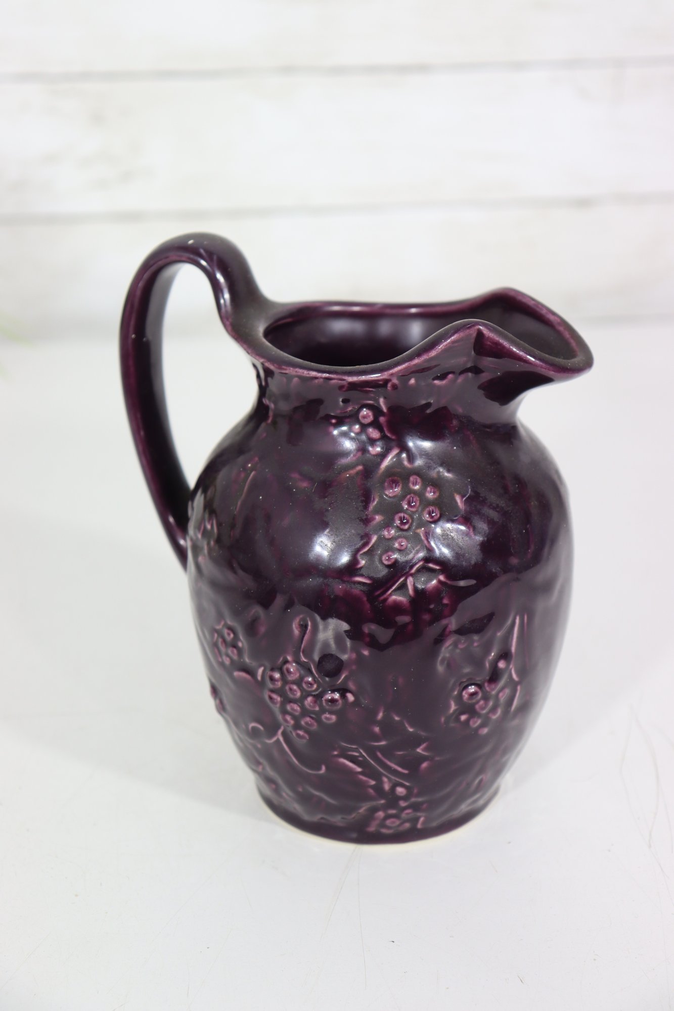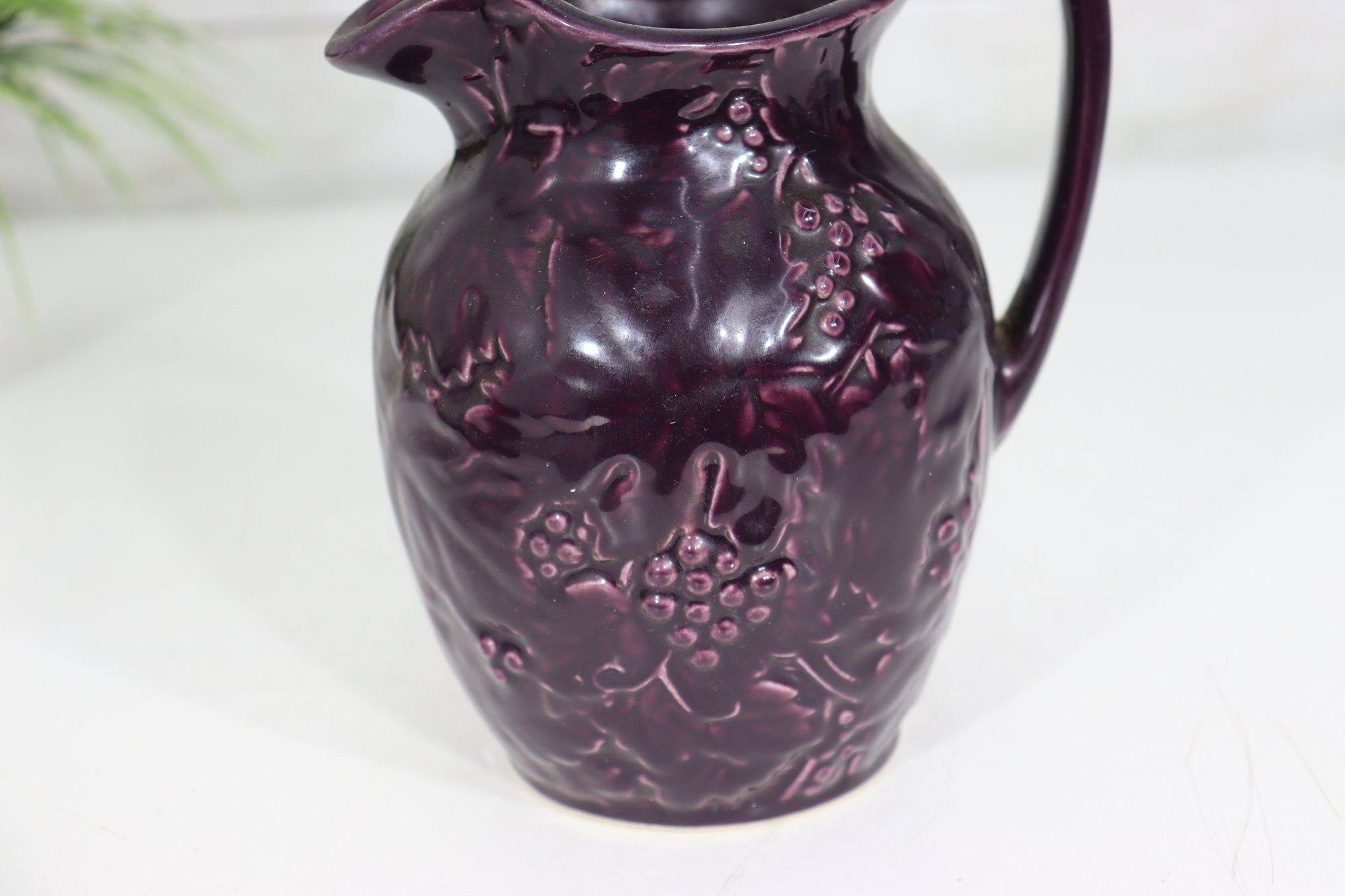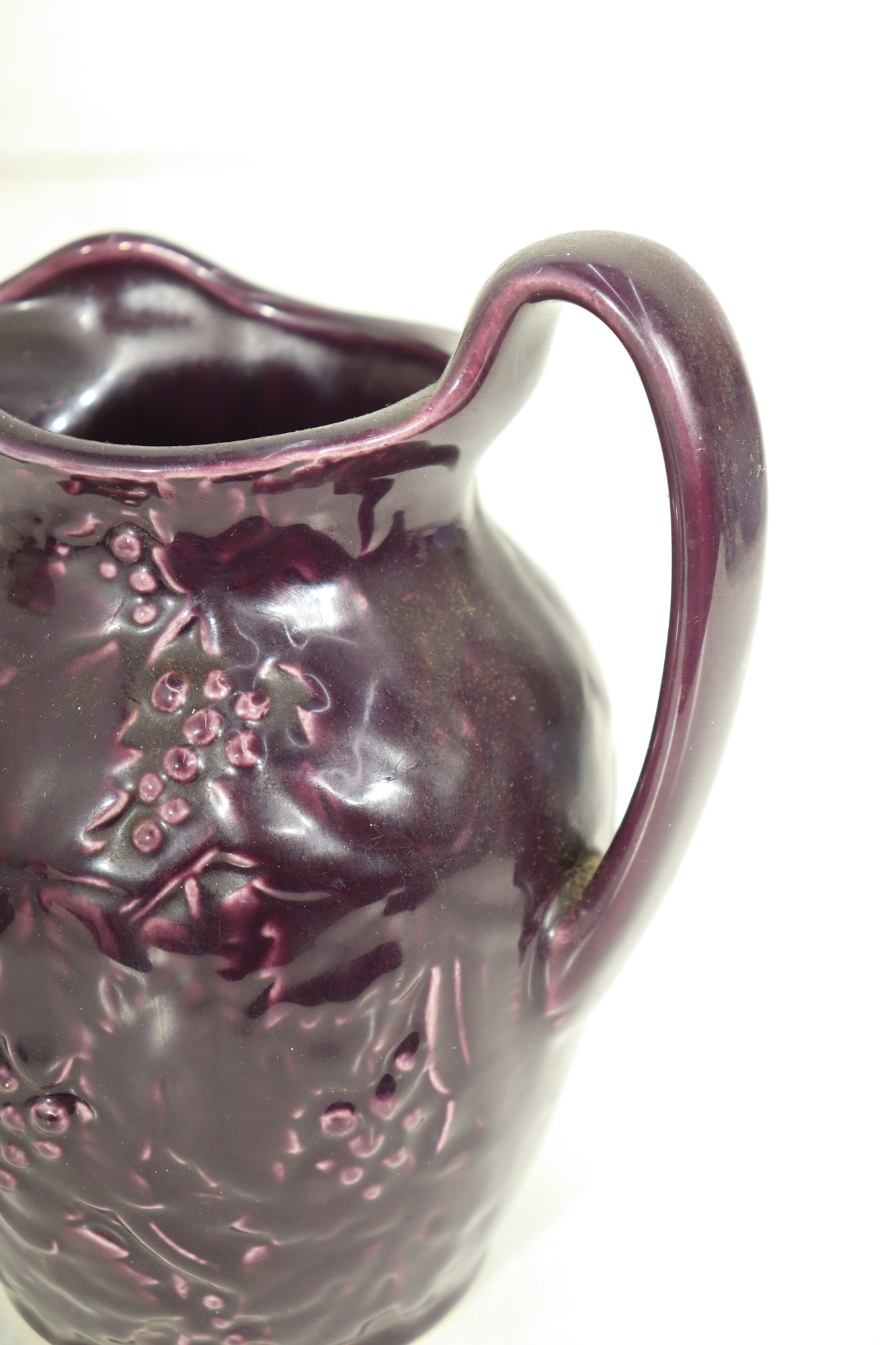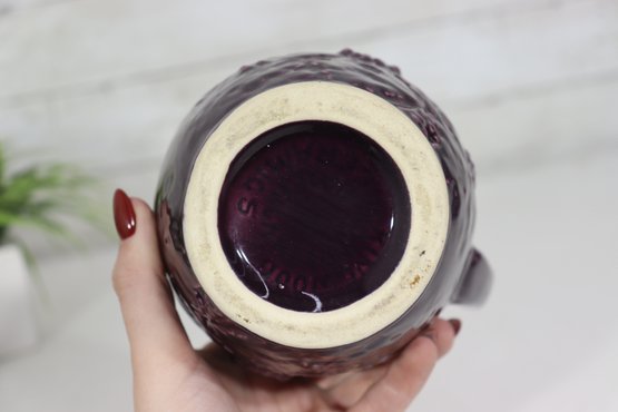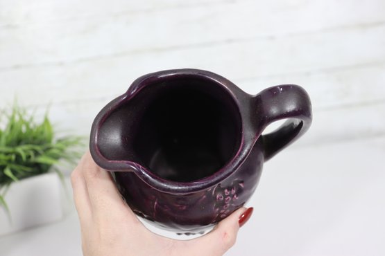 Beautiful vintage stoneware pitcher featuring raised embossed grape & vine relief design, finished in a rich deep plum / amethyst colored glaze. Stamped on bottom (mark shown). Classic traditional country kitchen / farmhouse style accent piece.