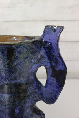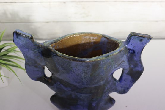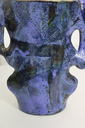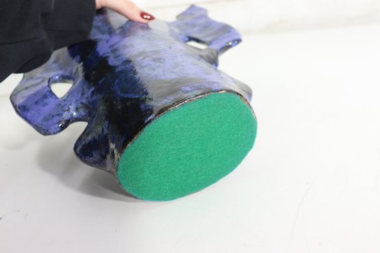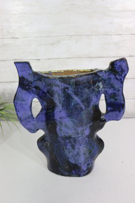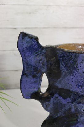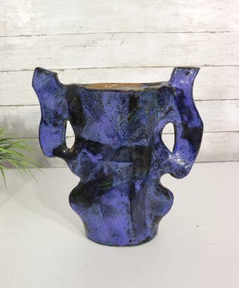 Unique vintage studio art pottery sculptural vase featuring an abstract / modernist form with dual side cutout handles and bold artistic shaping. This piece is hand formed with an expressive organic silhouette and finished in a rich mottled purple/blue glaze with deep darker undertones. Very striking presence and display impact.