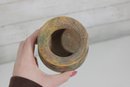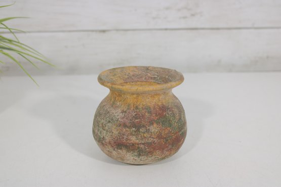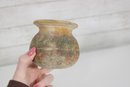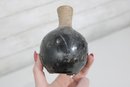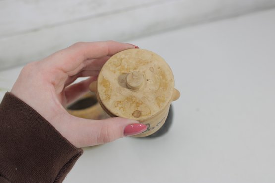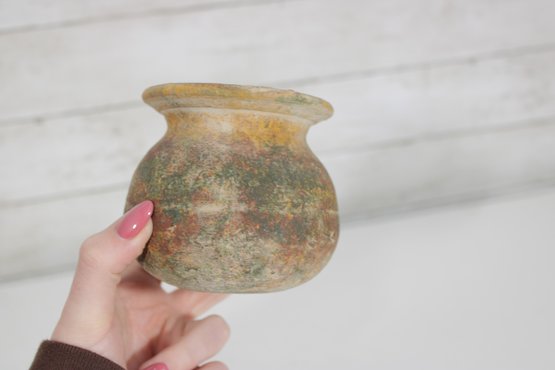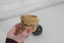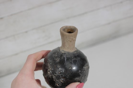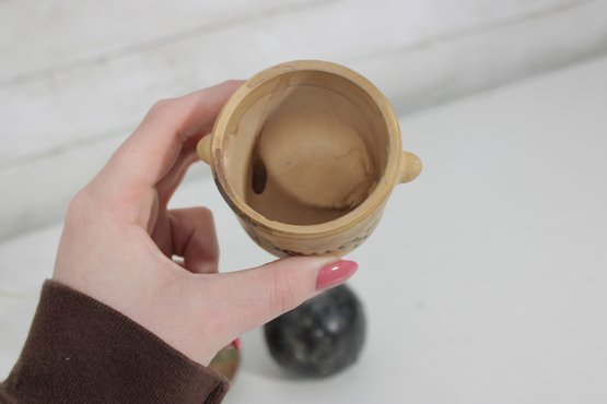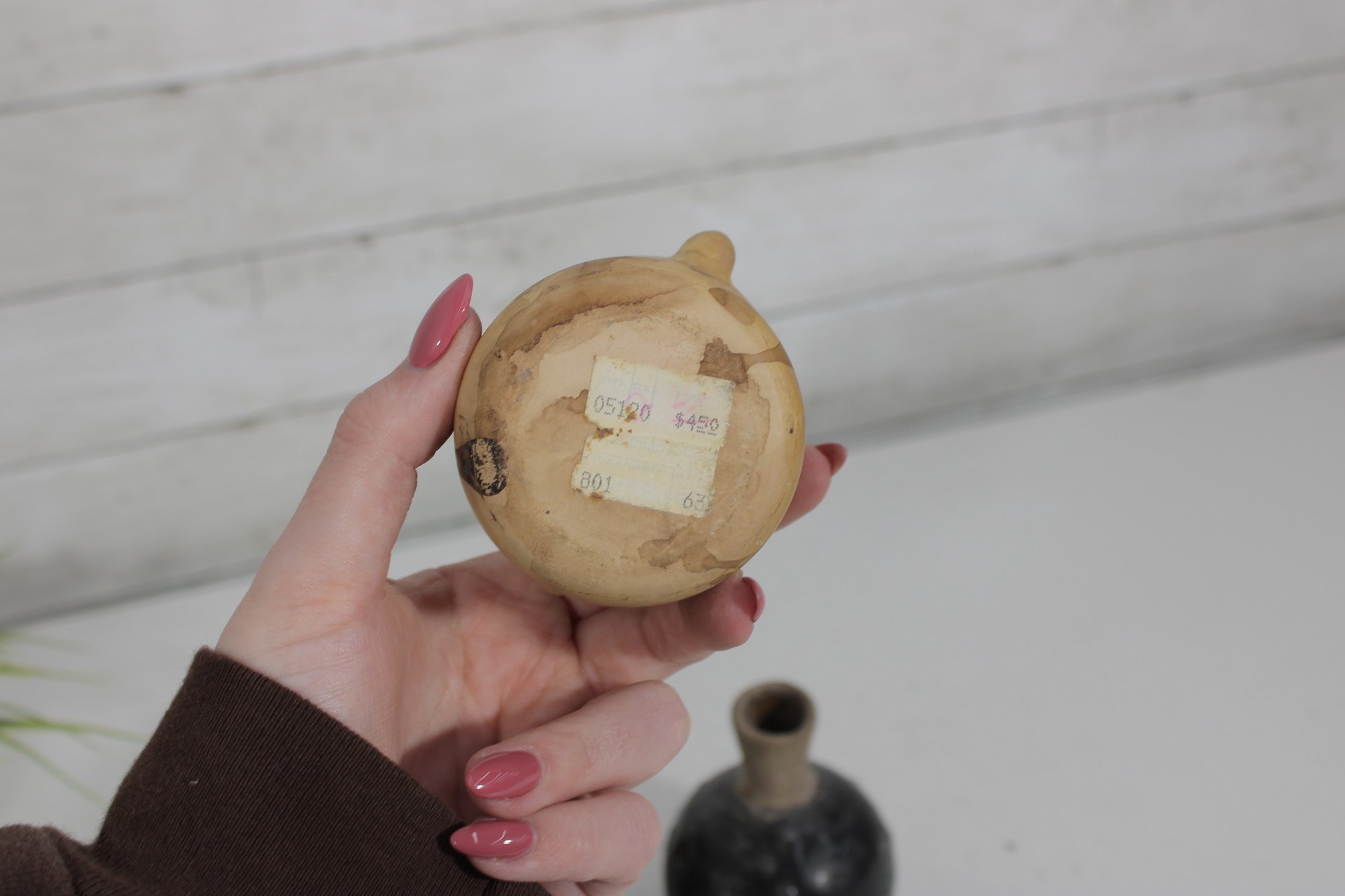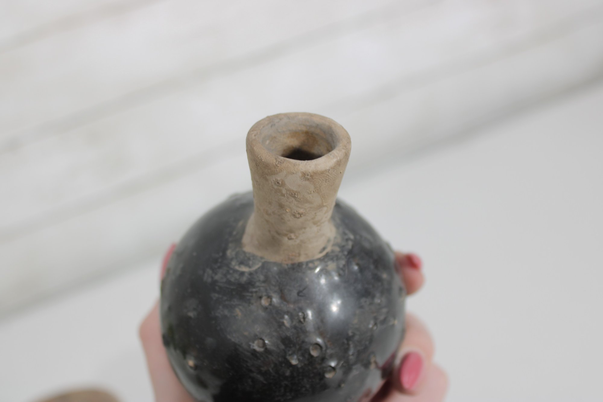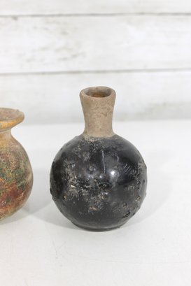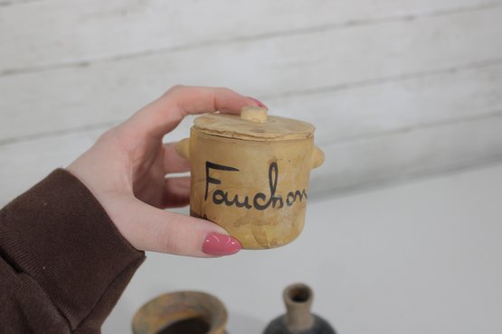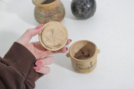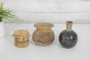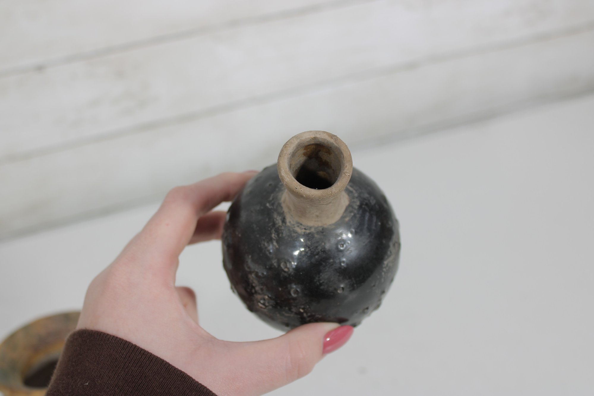 lot of three vintage pottery pieces, each with unique character and rustic studio pottery style. This grouping includes a French herb jar, a decorative art pottery vase, and a small bottle-style vessel, making a charming collection for pottery enthusiasts or decorative display.
