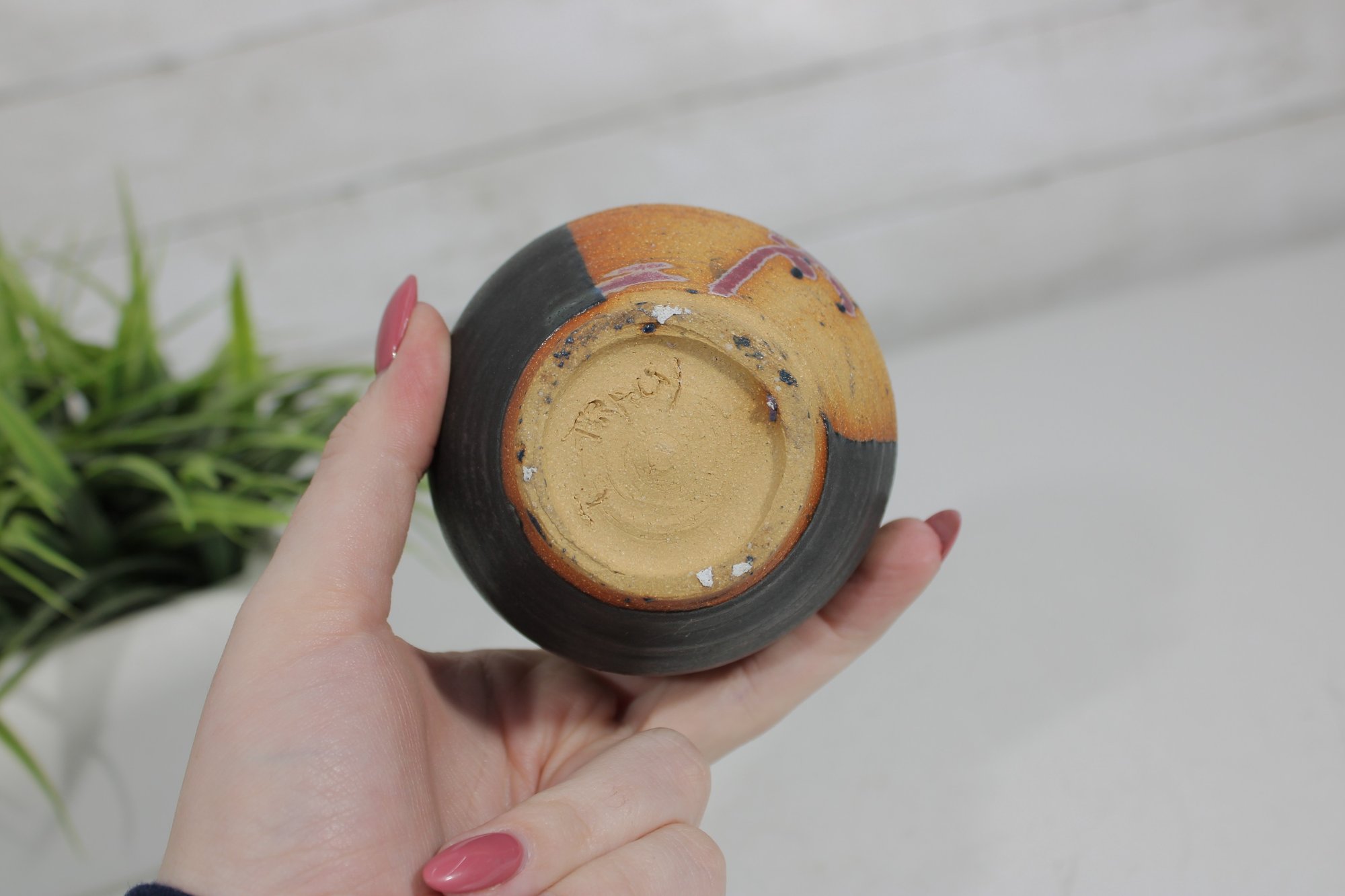 The organic form and tactile surface highlight its hand-thrown construction, while the unique glazing and decoration give it a one-of-a-kind artistic appeal. The underside appears to be signed or marked by the artist, adding to its collectible value.