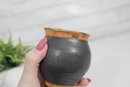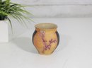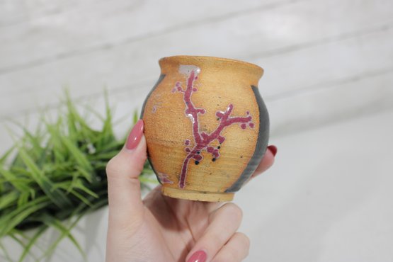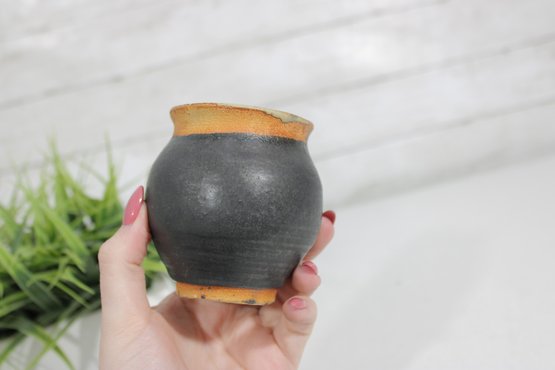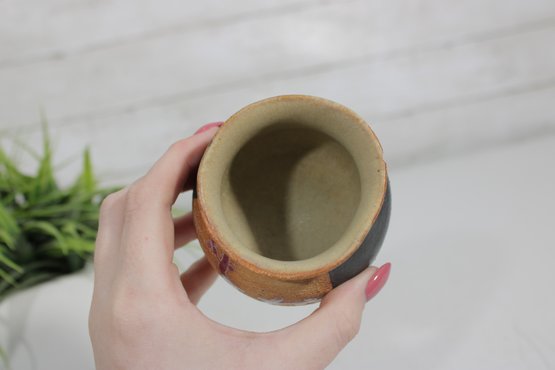 Charming vintage studio art pottery vase featuring a warm, earthy color palette and hand-crafted design. This small vase stands approximately 3.5 inches tall and showcases a beautiful combination of matte black and textured ochre glaze, accented with a raised purple branch or vine motif.