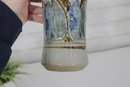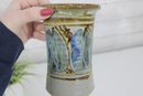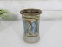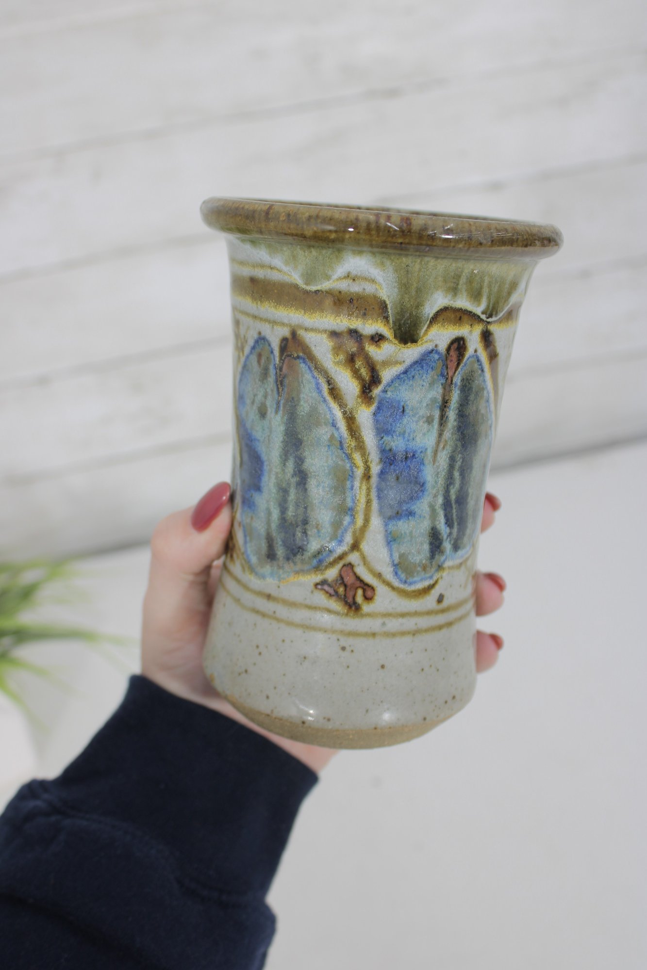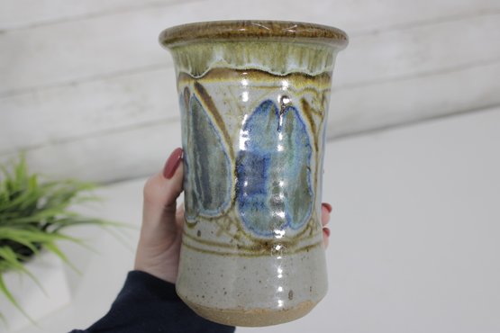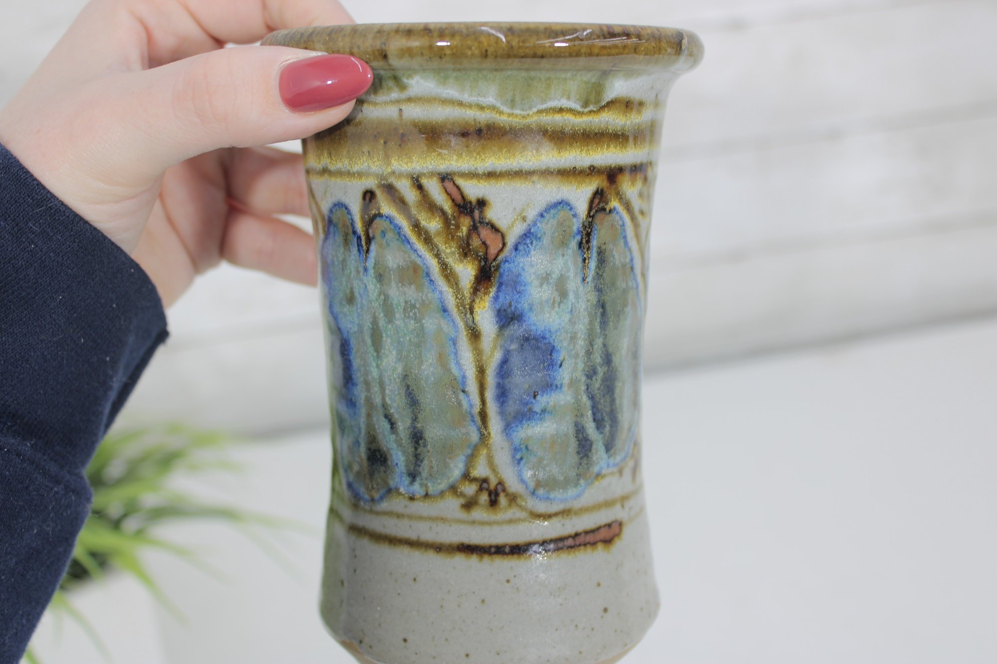 Beautiful vintage studio art pottery vase featuring an organic cylindrical form with rich earth-tone glazing accented by soft blue decorative panels. The handcrafted nature of this piece gives it a unique, artistic presence, with natural glaze variations and subtle texture throughout.