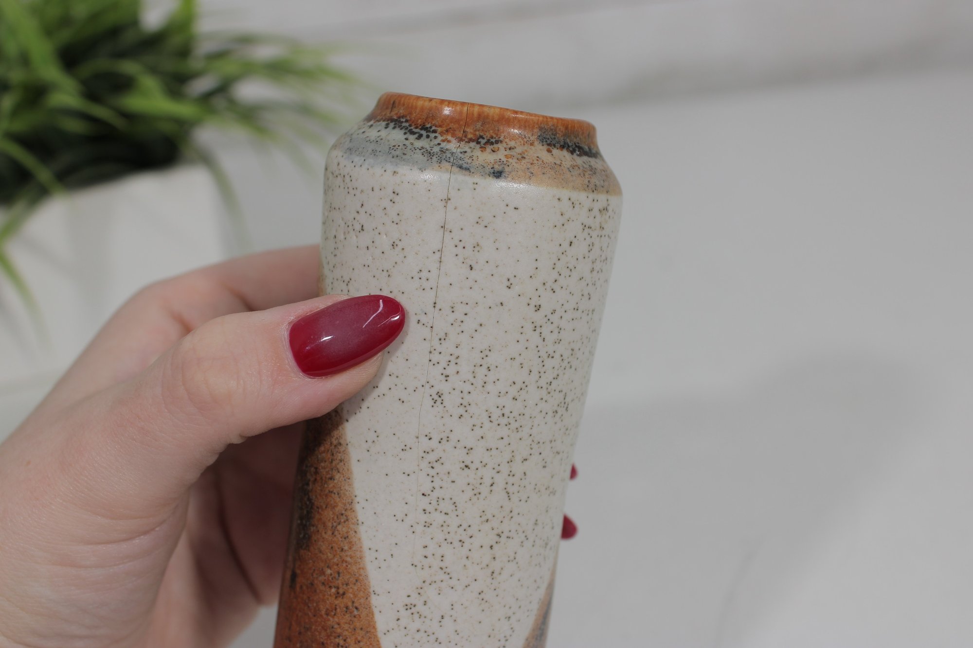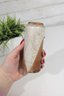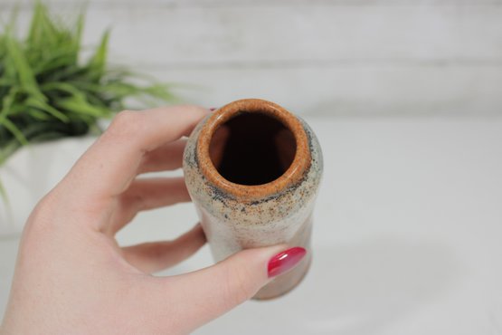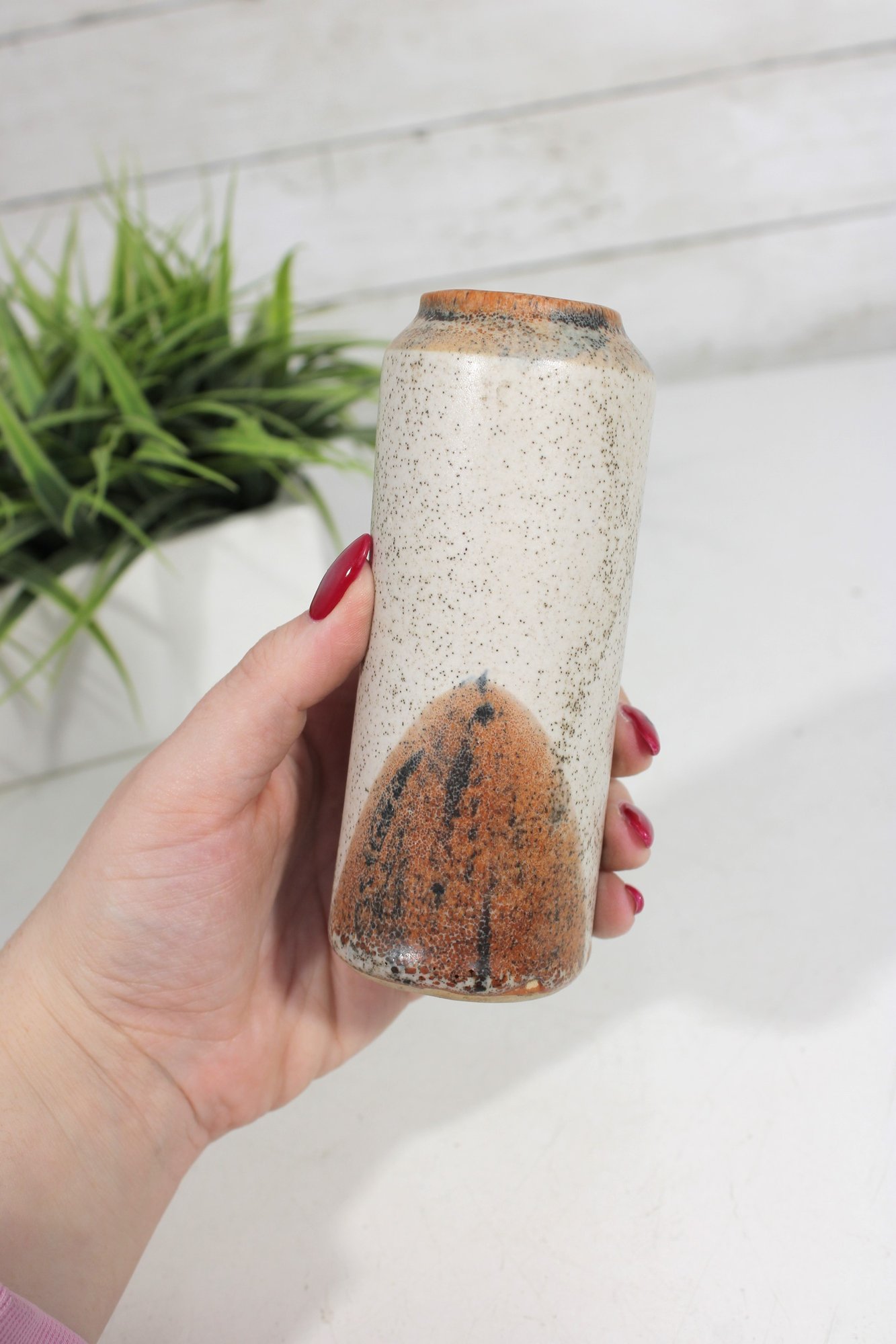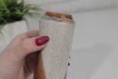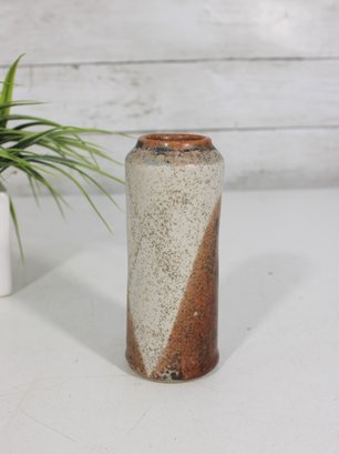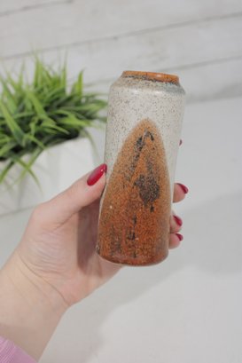 studio pottery vase featuring a classic mid-century modern aesthetic with natural earth-tone glazes. The piece has a tall, slightly tapered form with a beautiful combination of speckled beige and warm brown tones, creating an organic, rustic look.