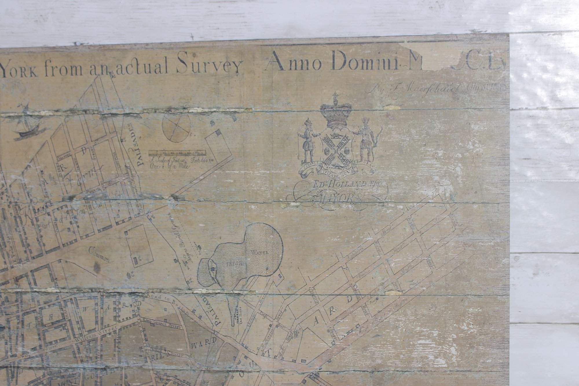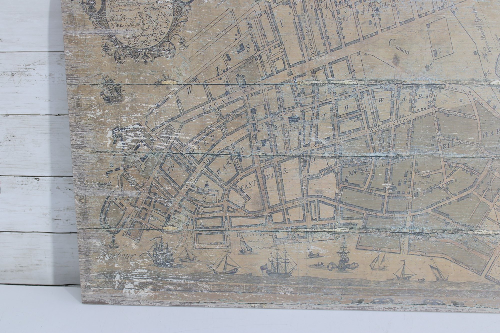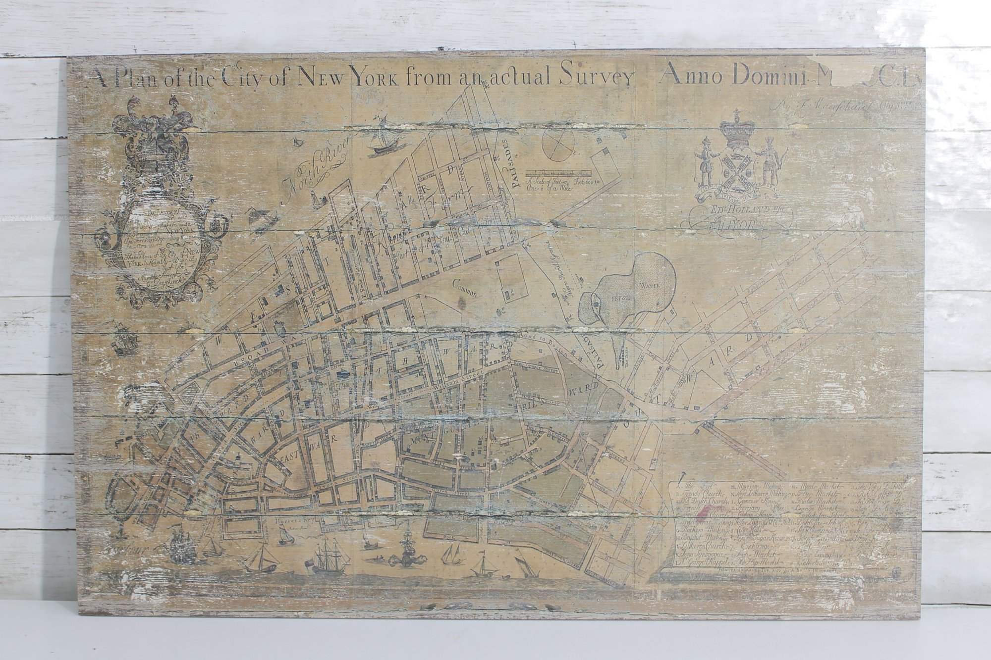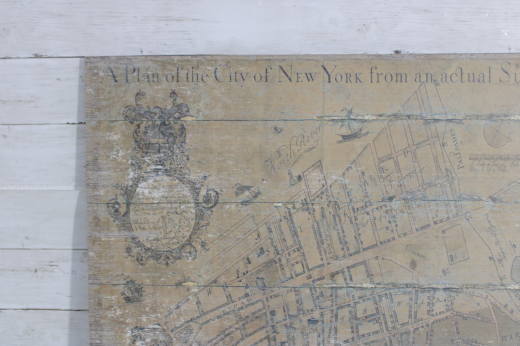 a decorative vintage-style map print of New York City mounted on a wood panel. The artwork reproduces an early historic map titled “A Plan of the City of New York from an Actual Survey”, featuring detailed street layouts, waterways, and early city planning elements.