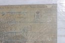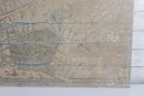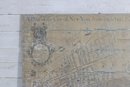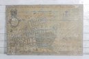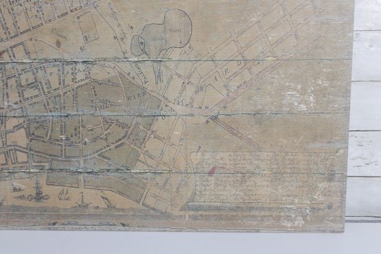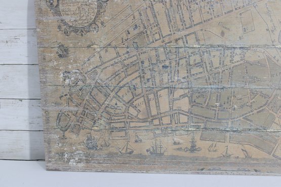 The piece is printed with an antique parchment-style background and decorative elements including crests and cartographic details that replicate the look of historic maps. The print is applied across a wood plank panel, giving the piece a rustic, distressed appearance that enhances the antique aesthetic.