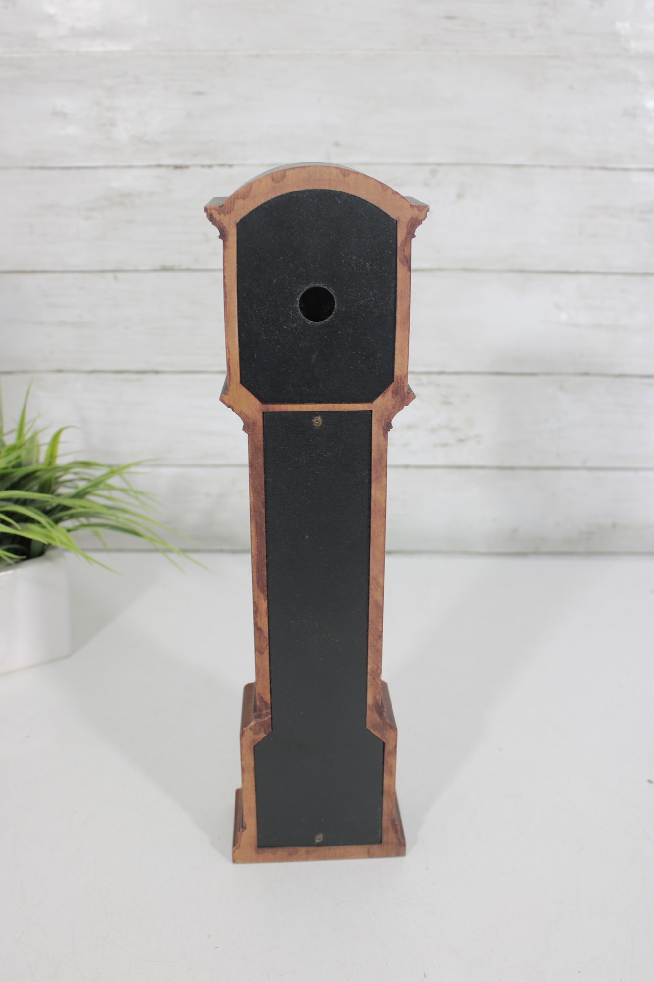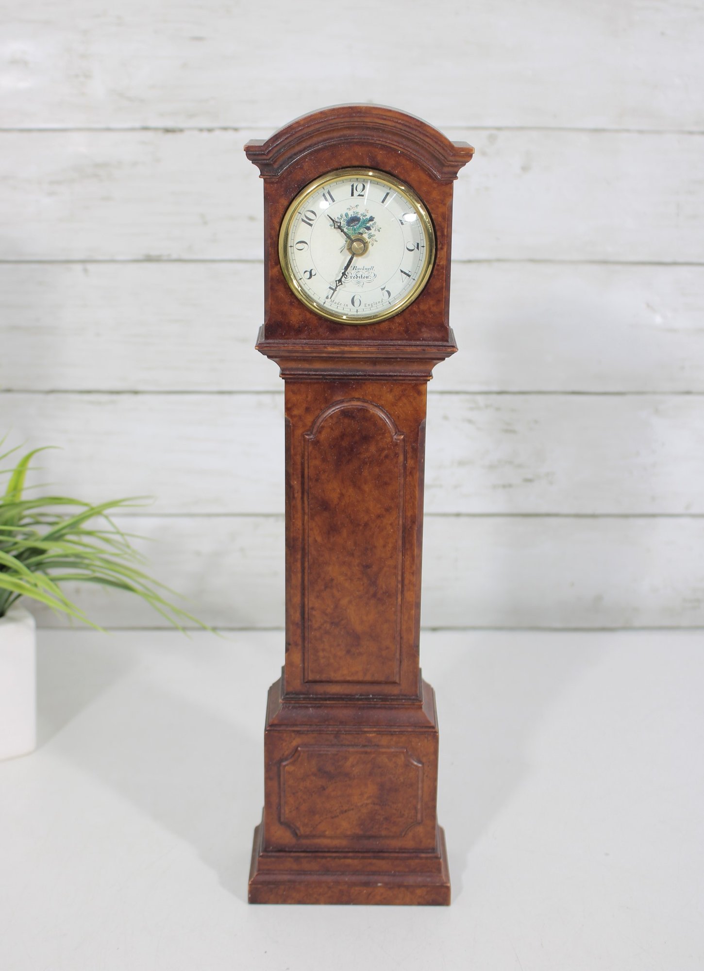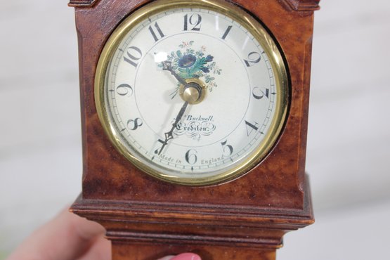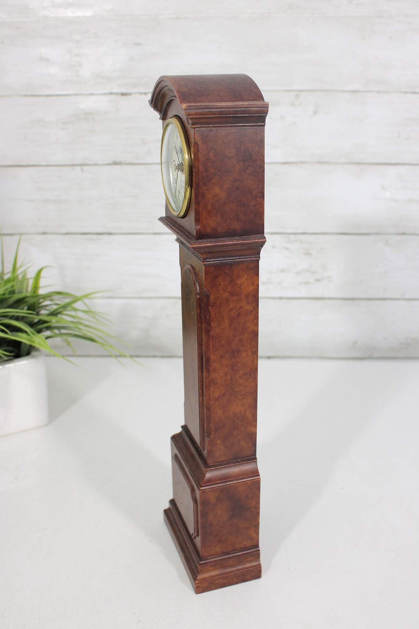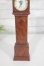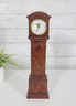 Compact yet stately, this piece brings the appeal of a full-size grandfather clock into a smaller format—perfect for display on a mantel, shelf, or tabletop. The rich wood grain and classic proportions make it a versatile decorative accent for traditional or vintage-inspired interiors.