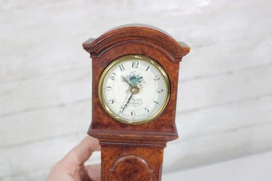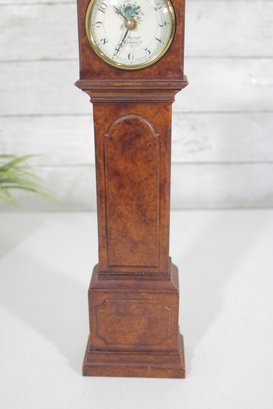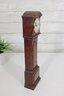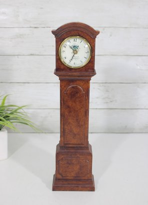 Charming vintage-style miniature grandfather clock featuring a classic tall case design in a warm wood finish. The clock face displays traditional Arabic numerals with elegant hands and a decorative floral motif at the center, giving it a timeless, traditional look.