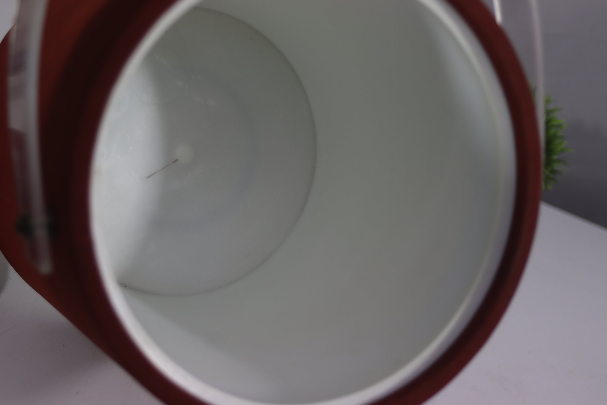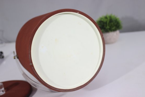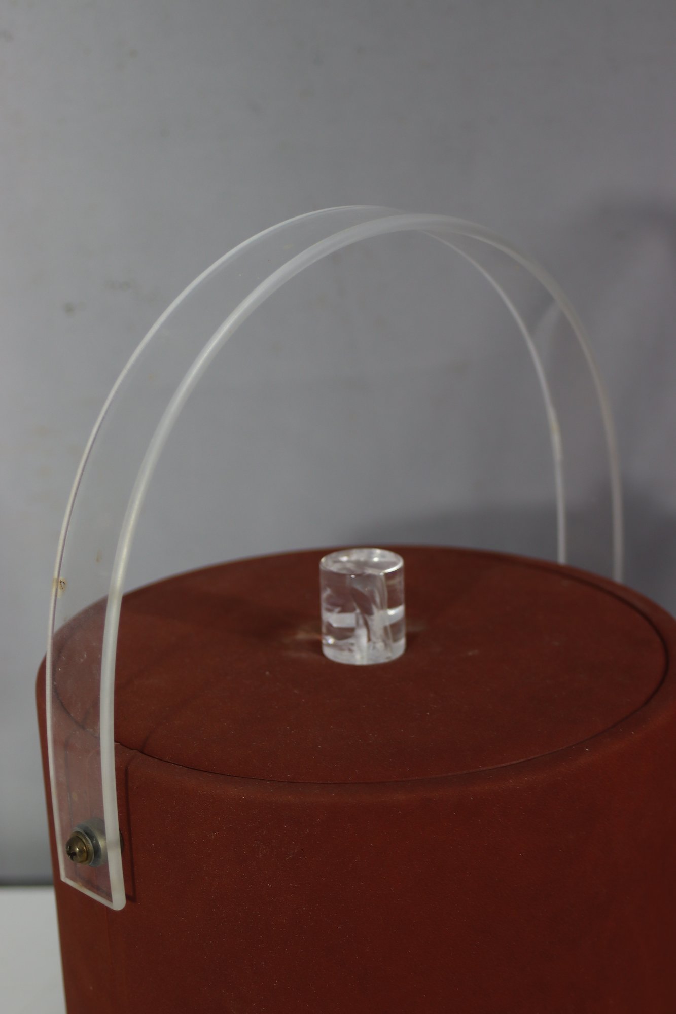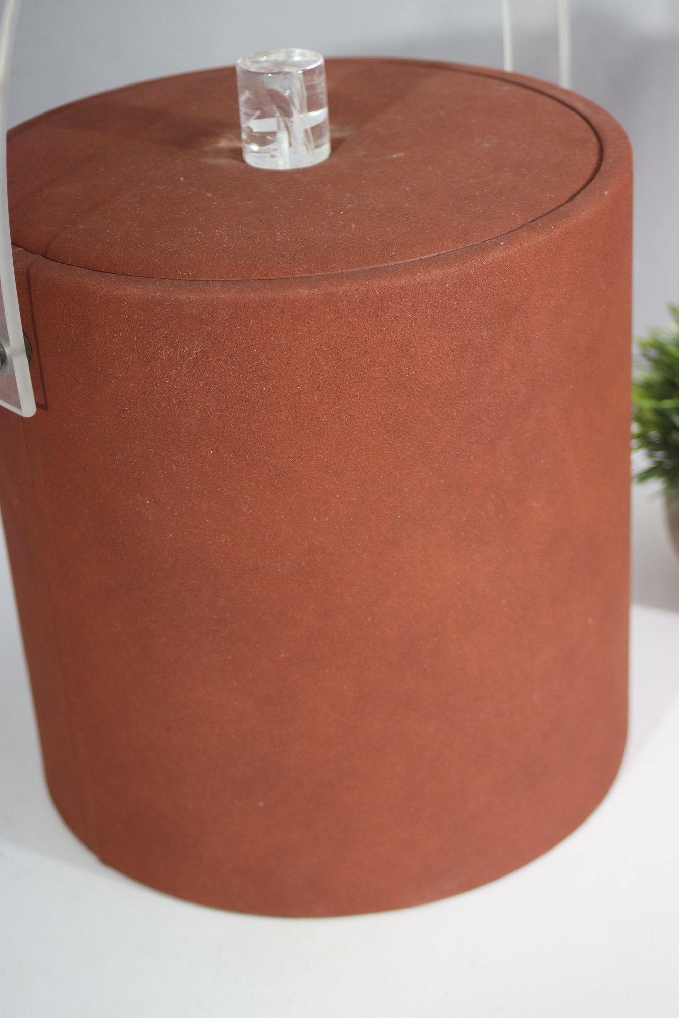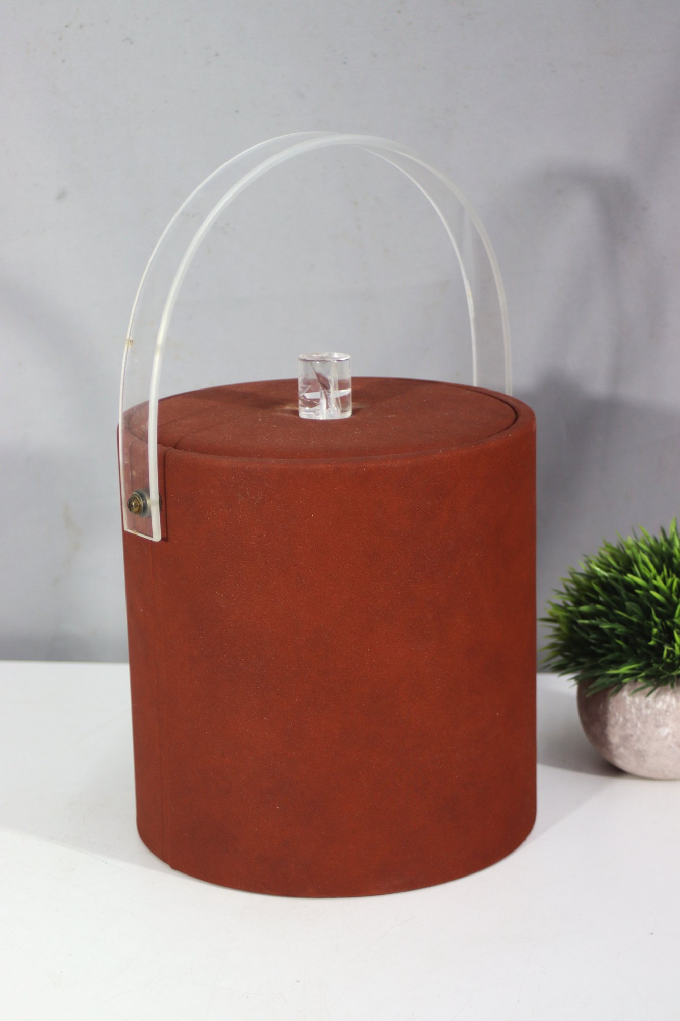 mid-century modern touch to your home bar with this vintage suede-wrapped ice bucket, featuring a clear Lucite handle and lid knob. A stylish and functional statement piece, perfect for entertaining or as a retro decor accent.