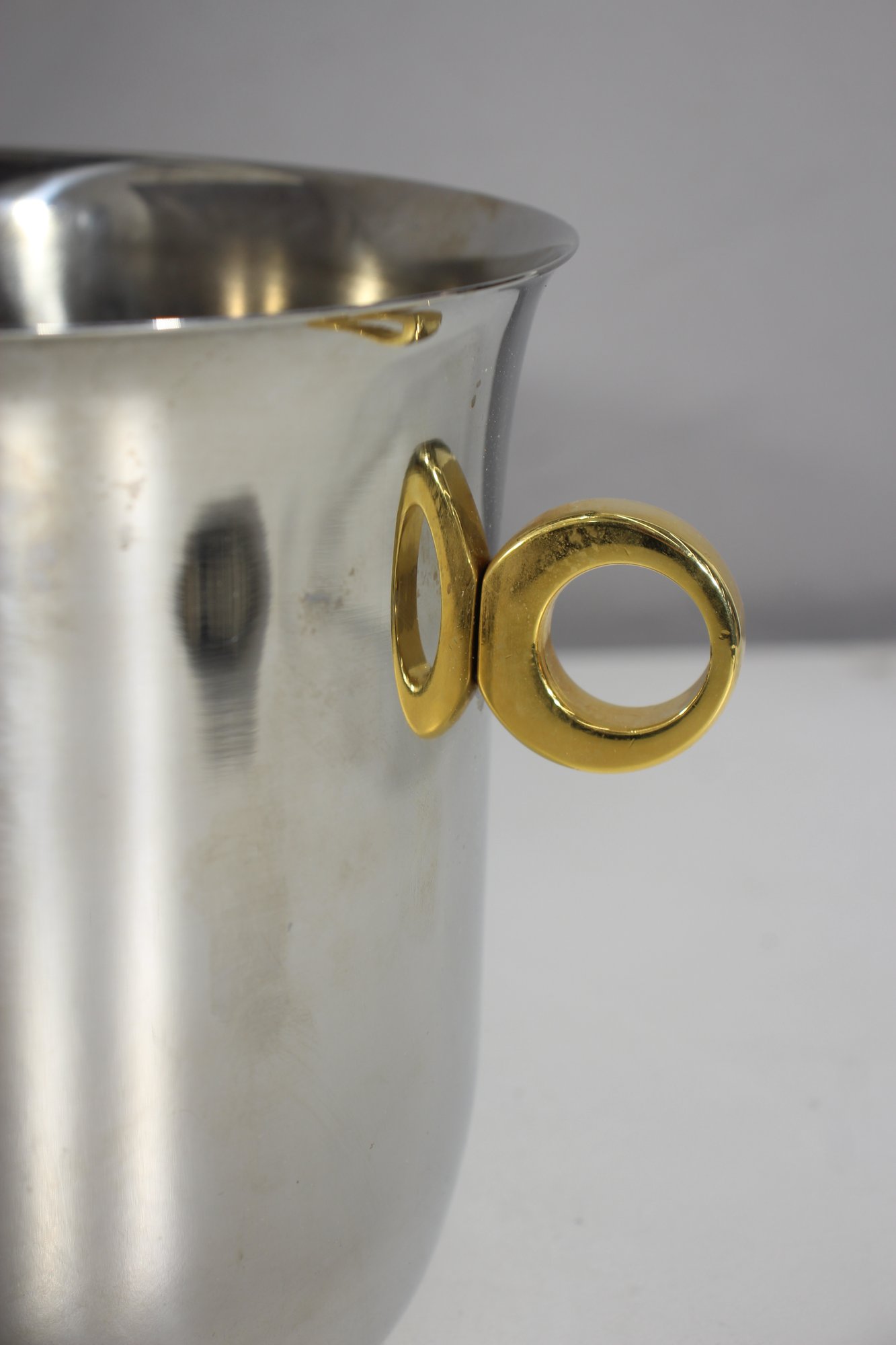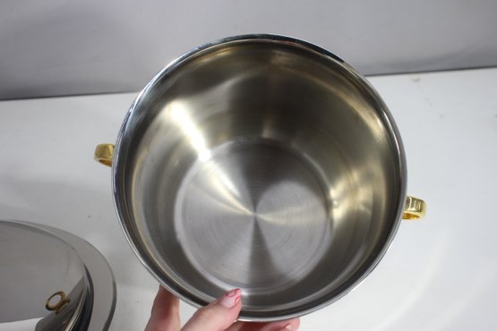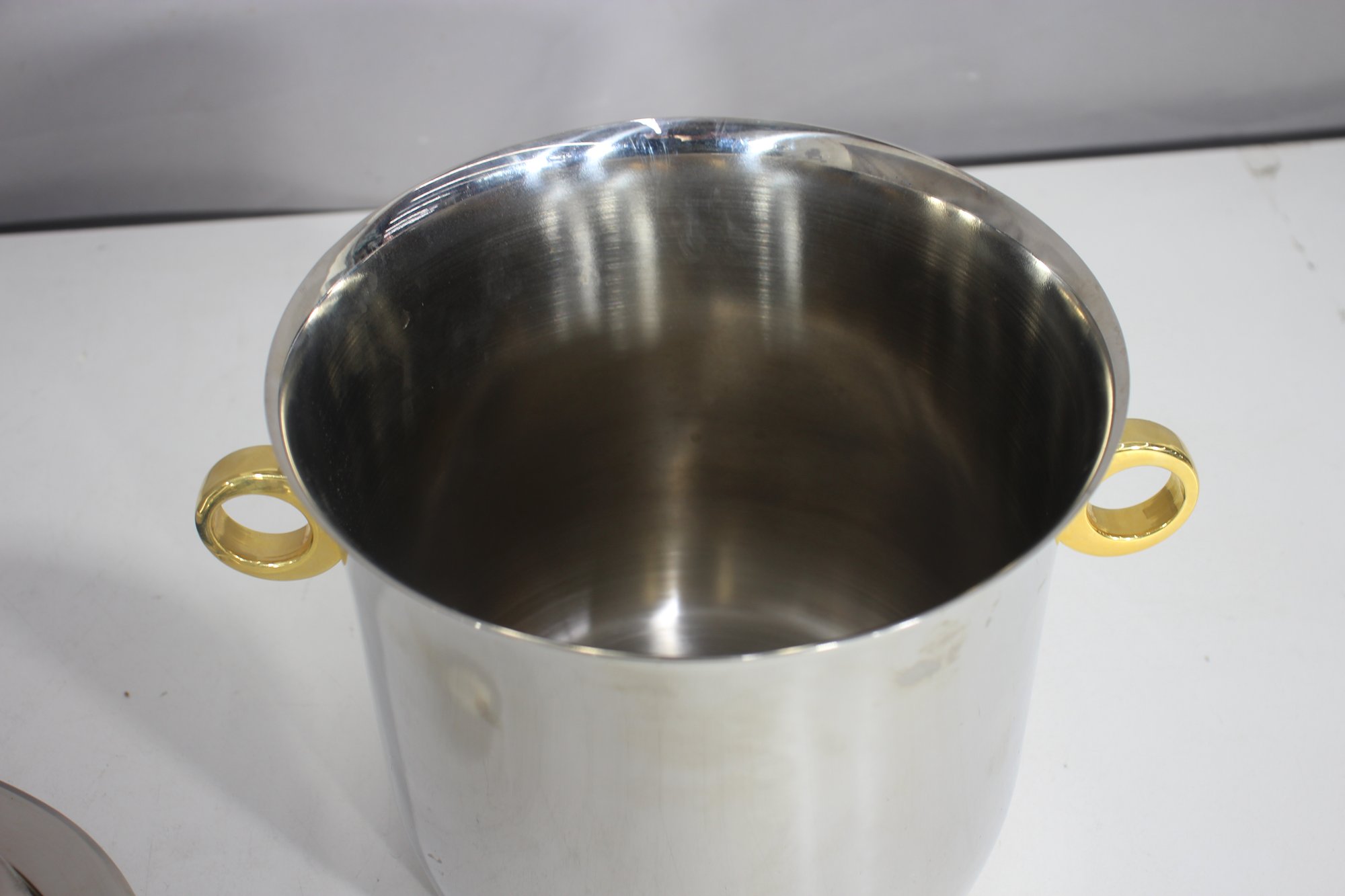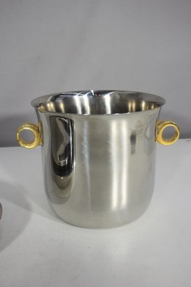 Stainless Steel Ice Bucket (7" H x 8" Round) – Features bold gold-tone ring handles for a sleek, modern look.