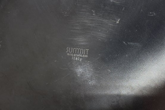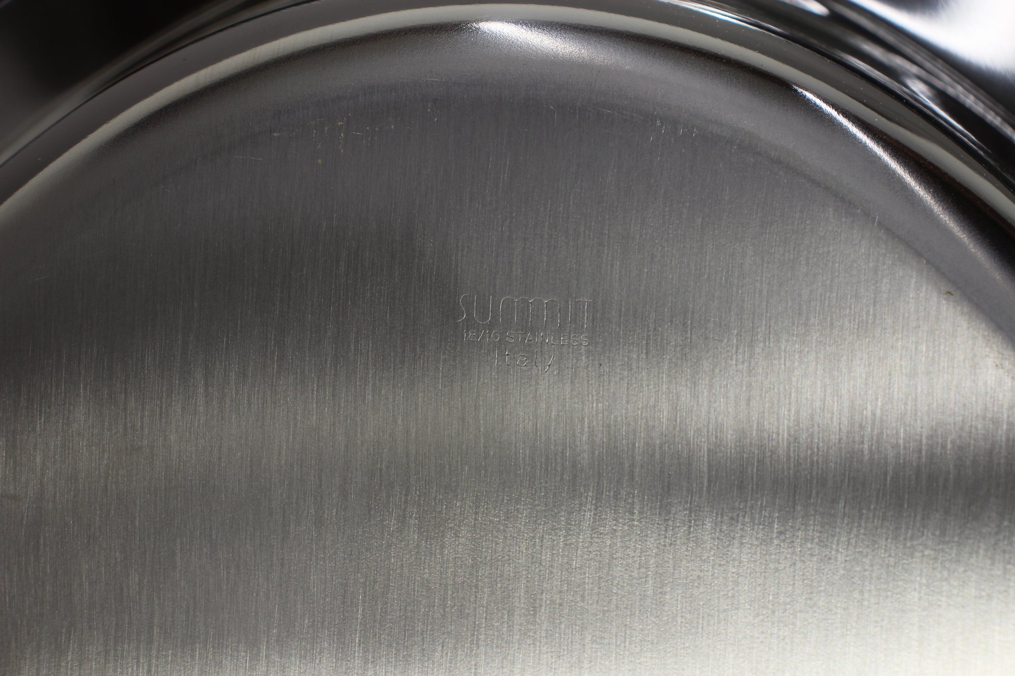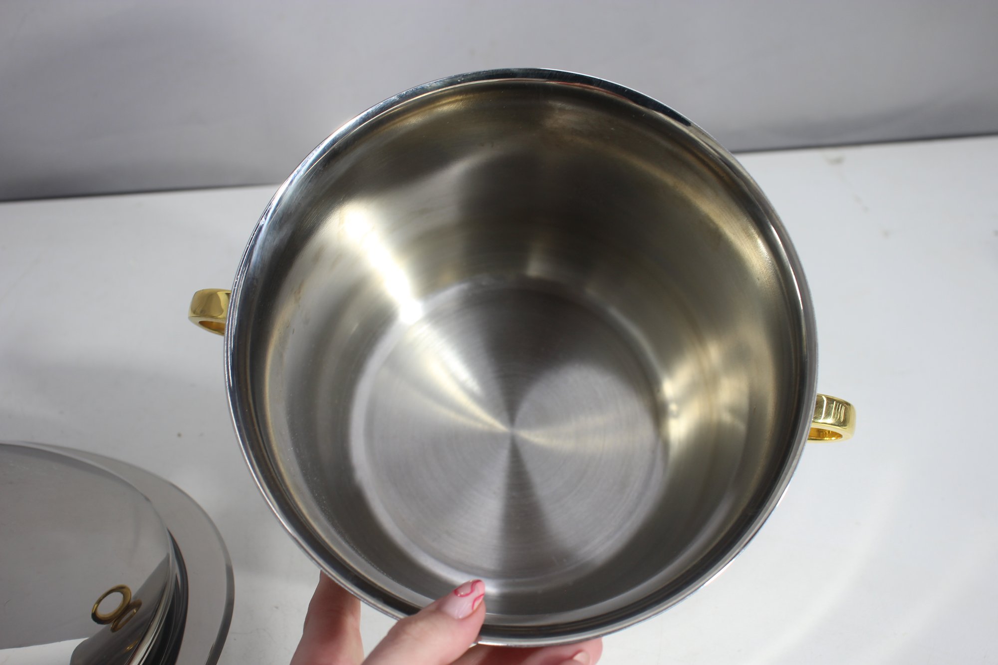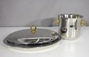 a stunning vintage Summit Italy stainless steel serving set, featuring a polished stainless steel ice bucket and a covered casserole dish with a glass insert. Both pieces boast elegant gold-tone handles and accents, adding a sophisticated touch to any table setting.