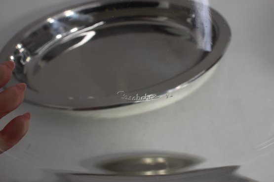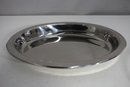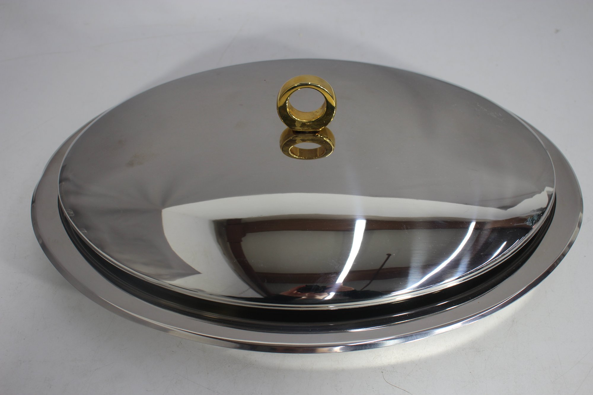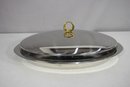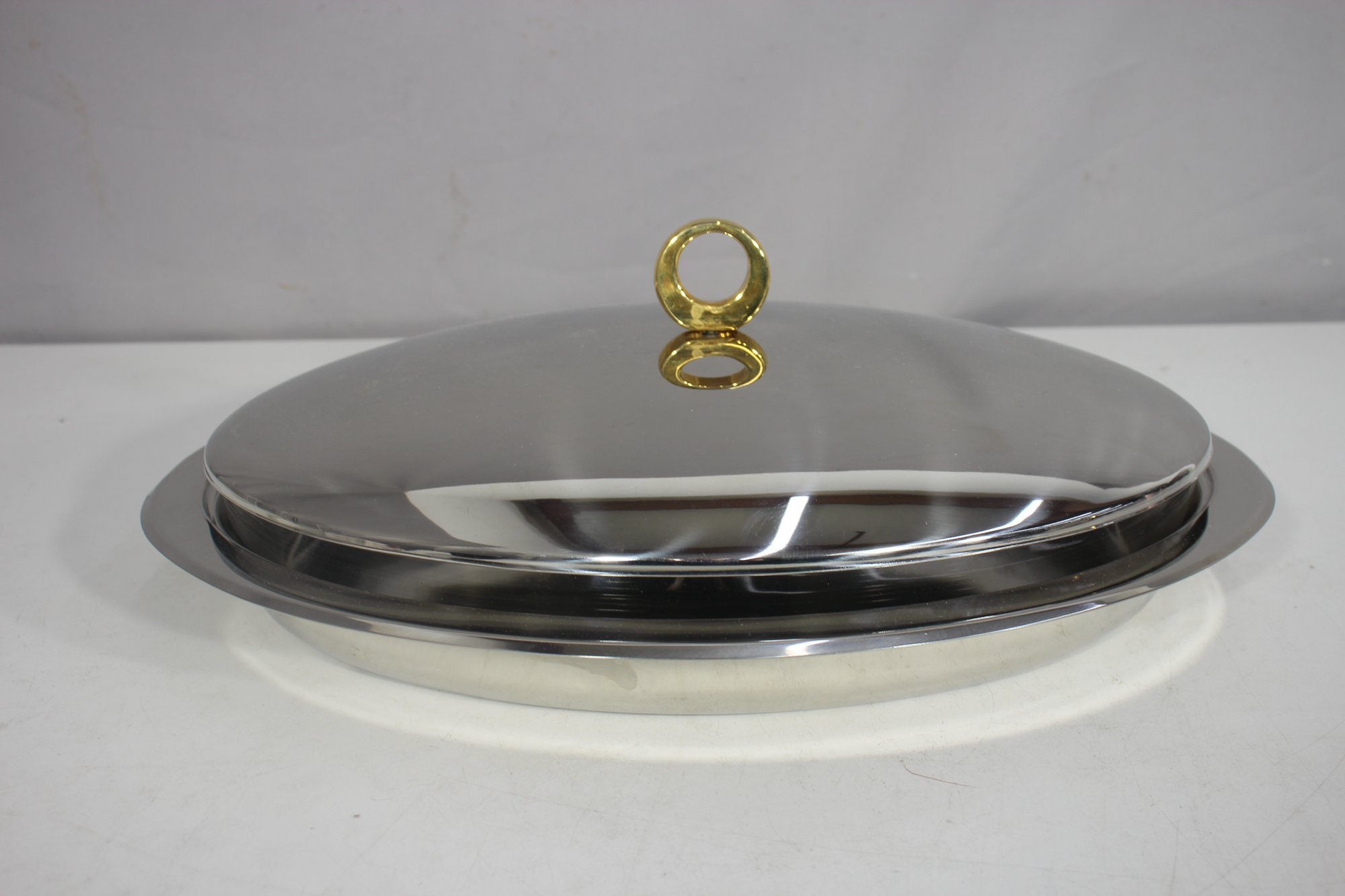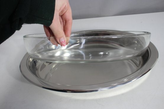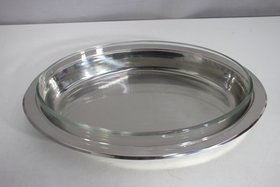 Stainless Steel & Glass Covered Casserole Dish (16" W x 11.5" D) – Includes a removable glass insert and a matching stainless steel domed lid with a gold-tone handle.