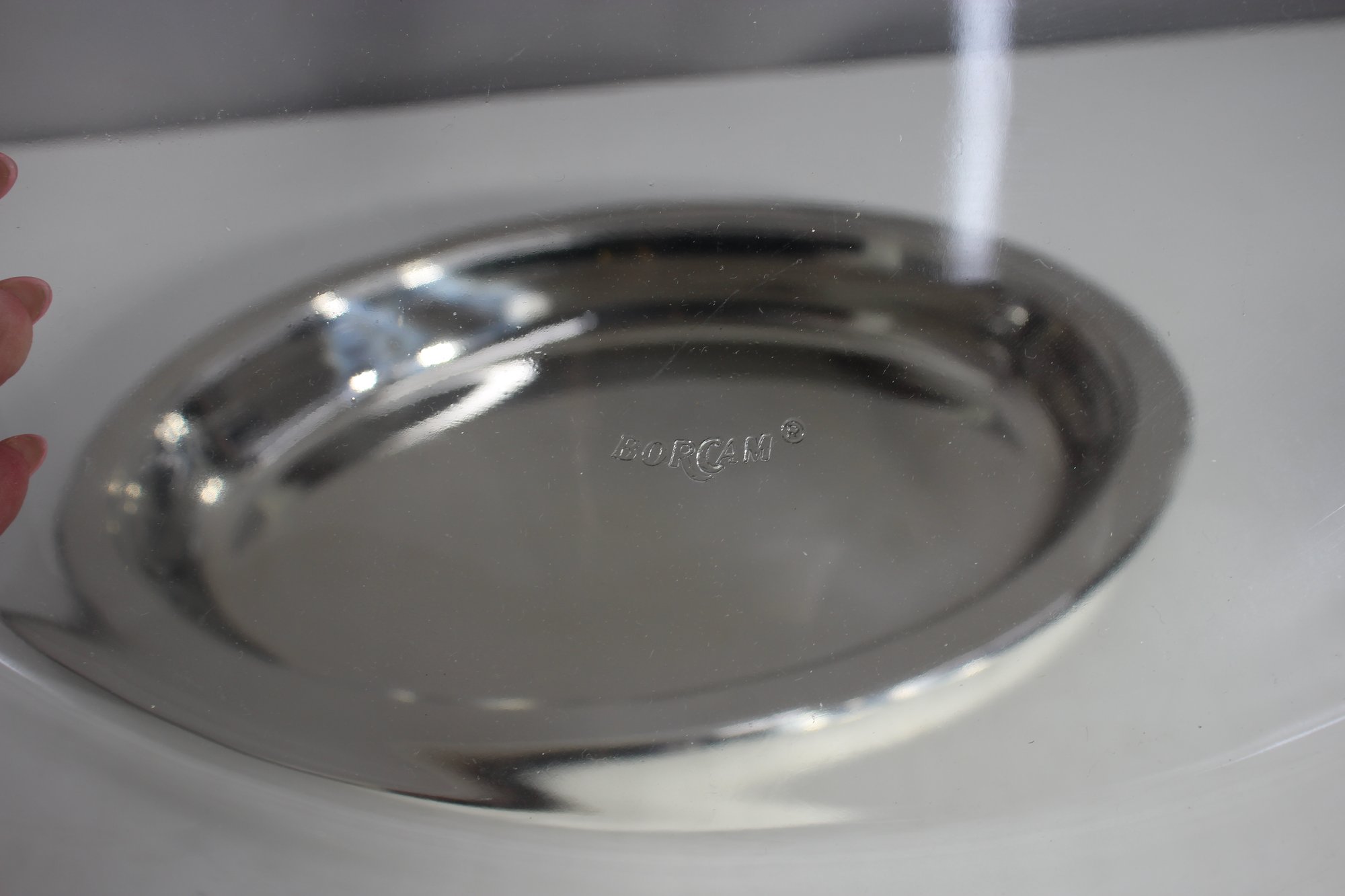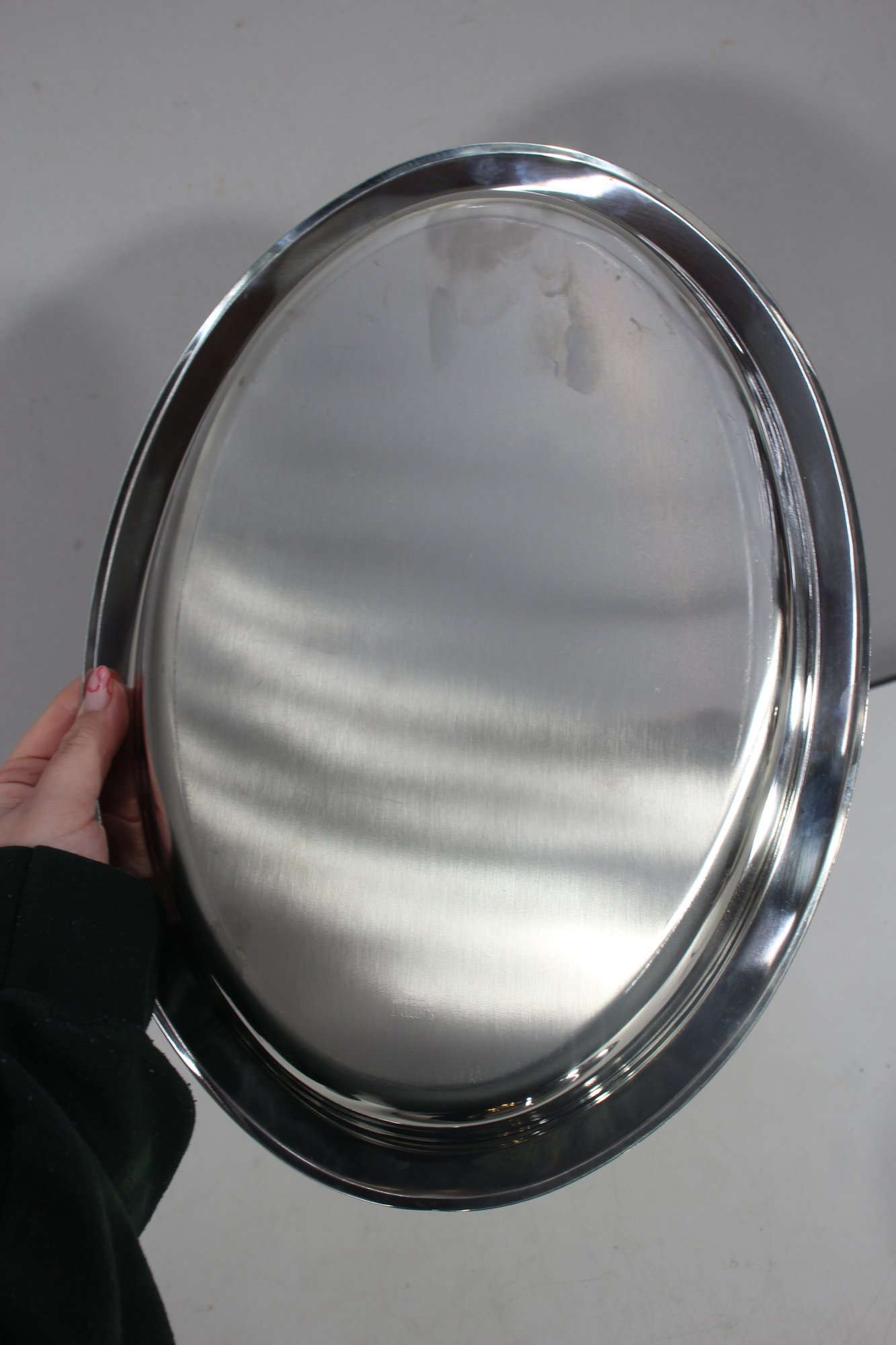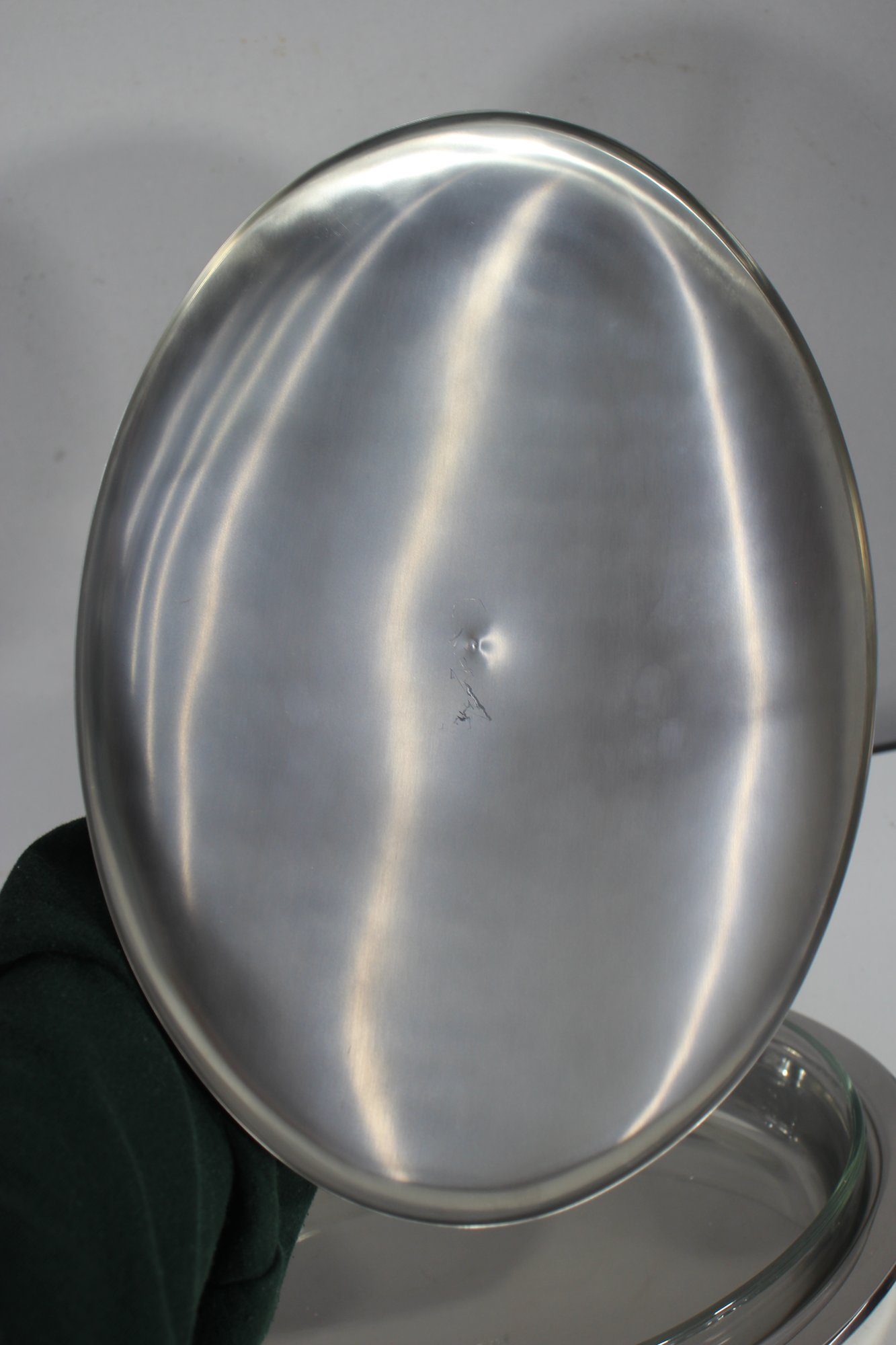 Stainless Steel & Glass Covered Casserole Dish (16" W x 11.5" D) – Includes a removable glass insert and a matching stainless steel domed lid with a gold-tone handle.