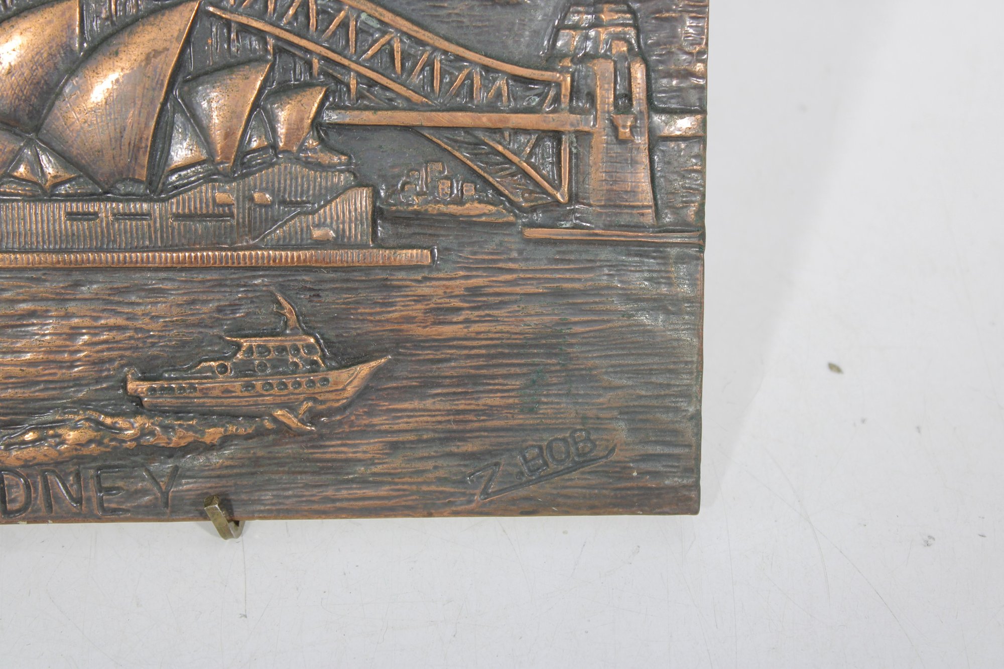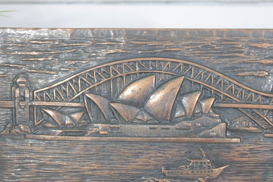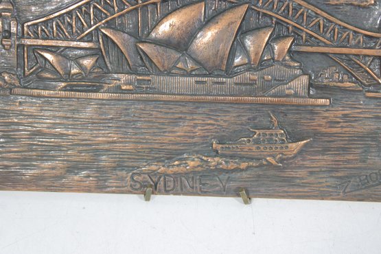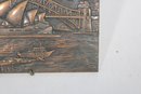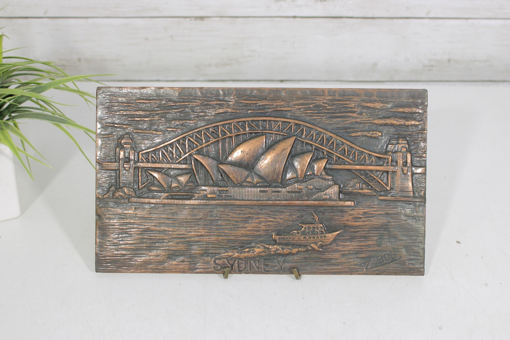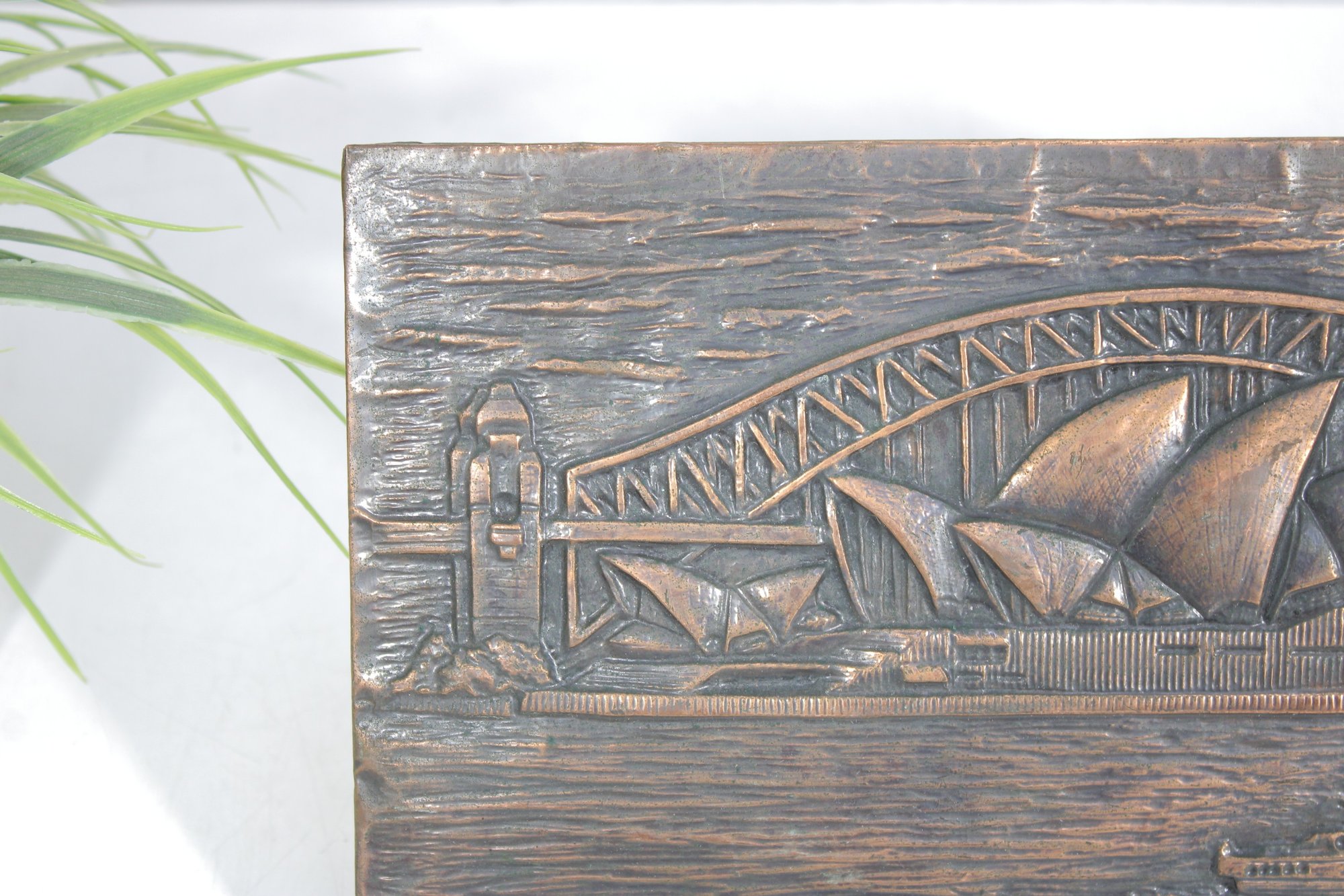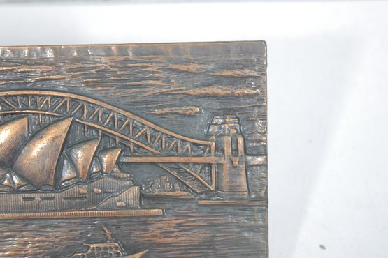 Vintage decorative copper-tone relief plaque depicting the iconic Sydney Harbour scene, featuring the Sydney Harbour Bridge and the Sydney Opera House. This finely detailed piece captures the architectural beauty of one of Australia’s most recognizable landmarks.