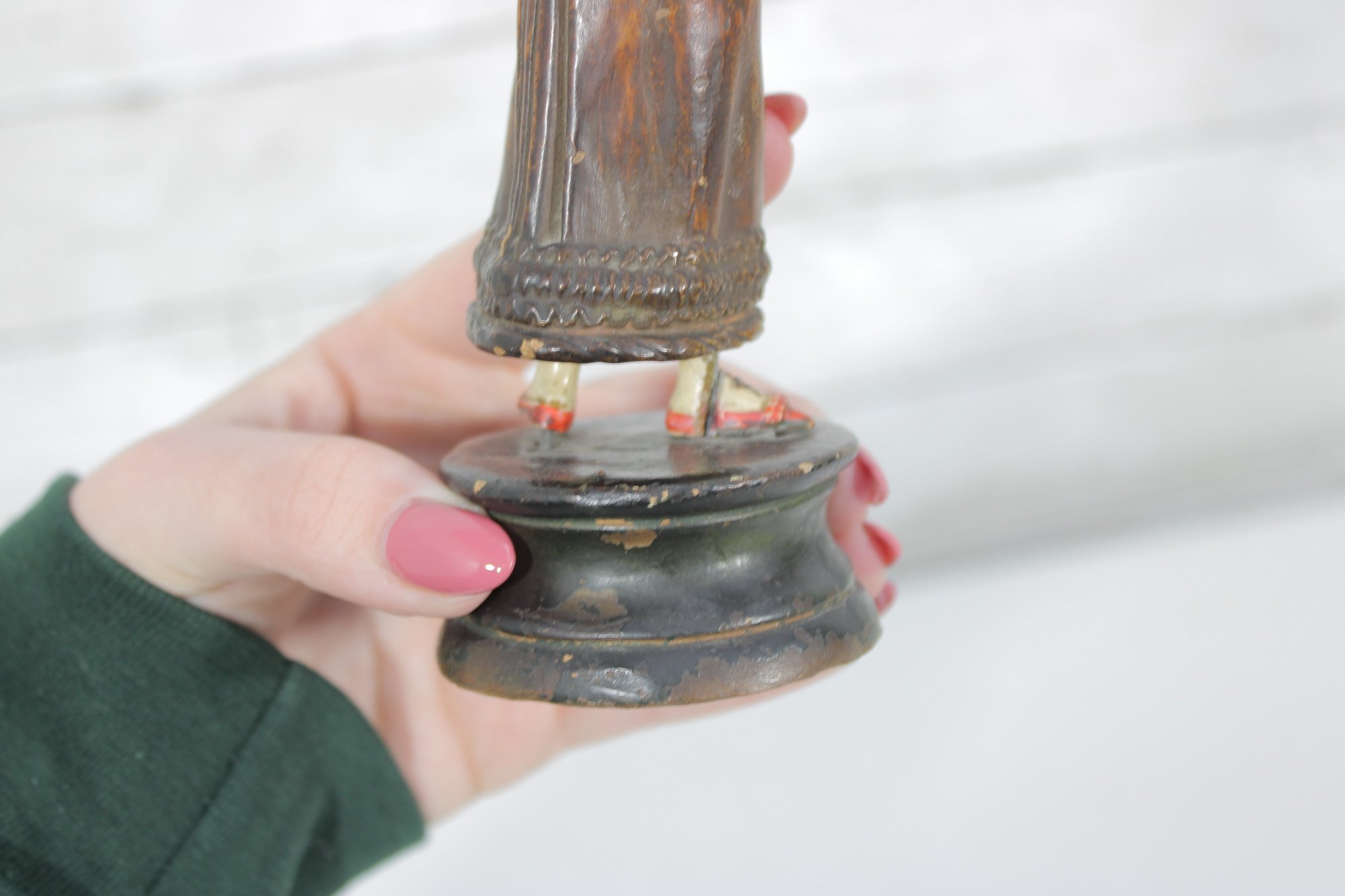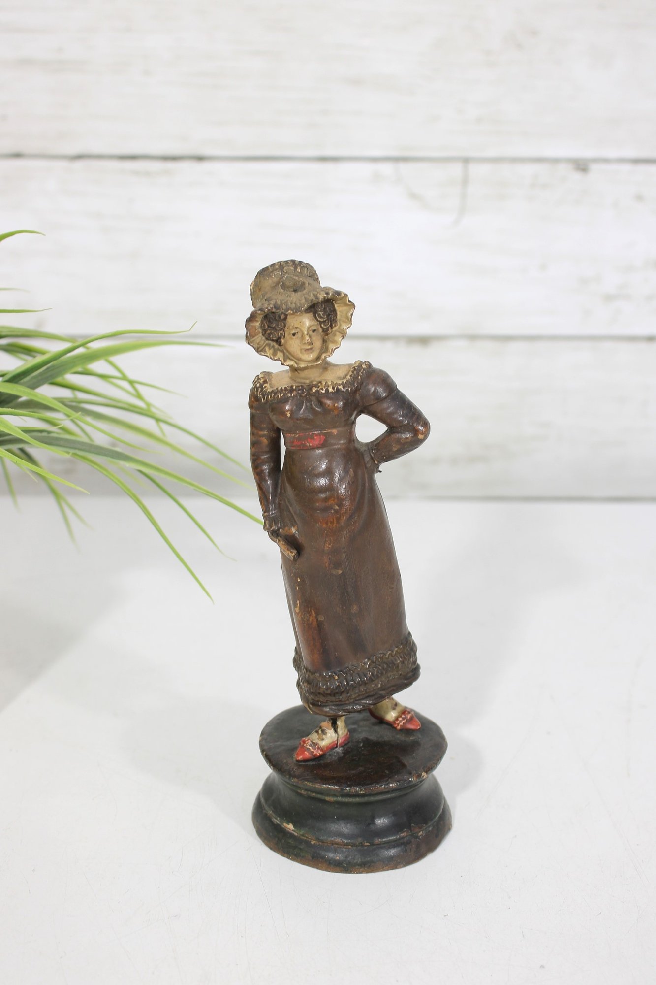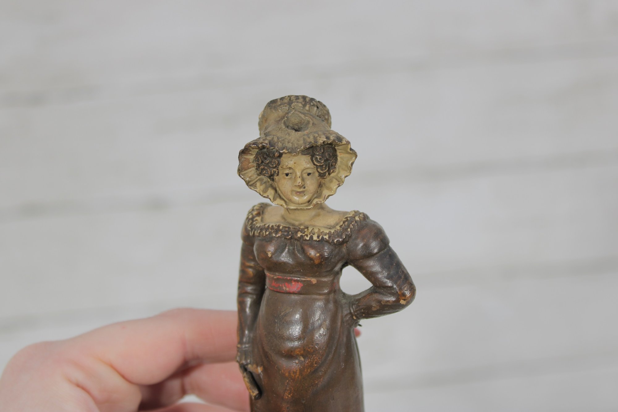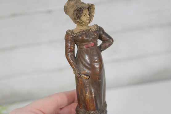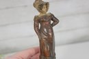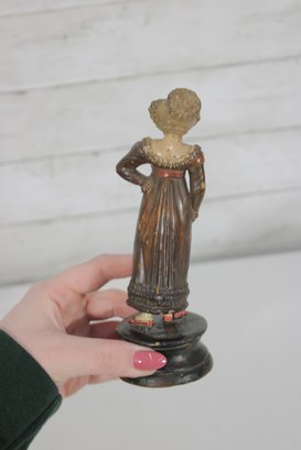 vintage figural lady statue standing approximately 7 inches high. The figure depicts a woman in a long flowing dress and decorative hat, posed gracefully with one hand on her hip and the other holding a small object.