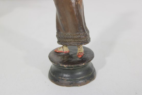 The figure retains nice detail in the facial features, clothing folds, and hat decoration, giving it a classic antique decorative look.