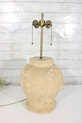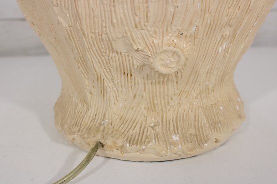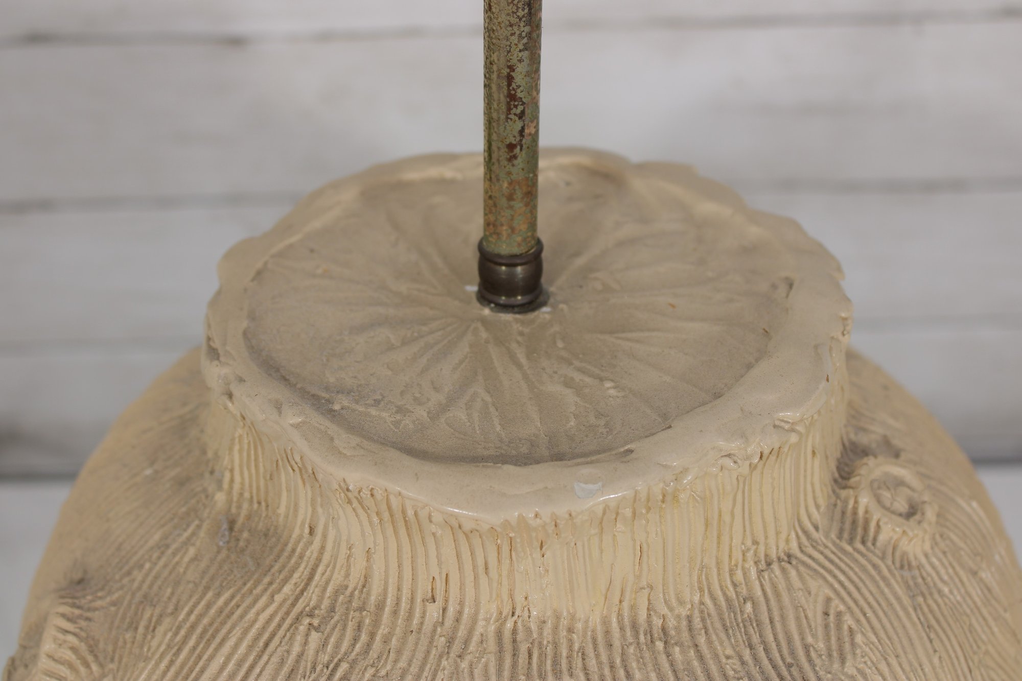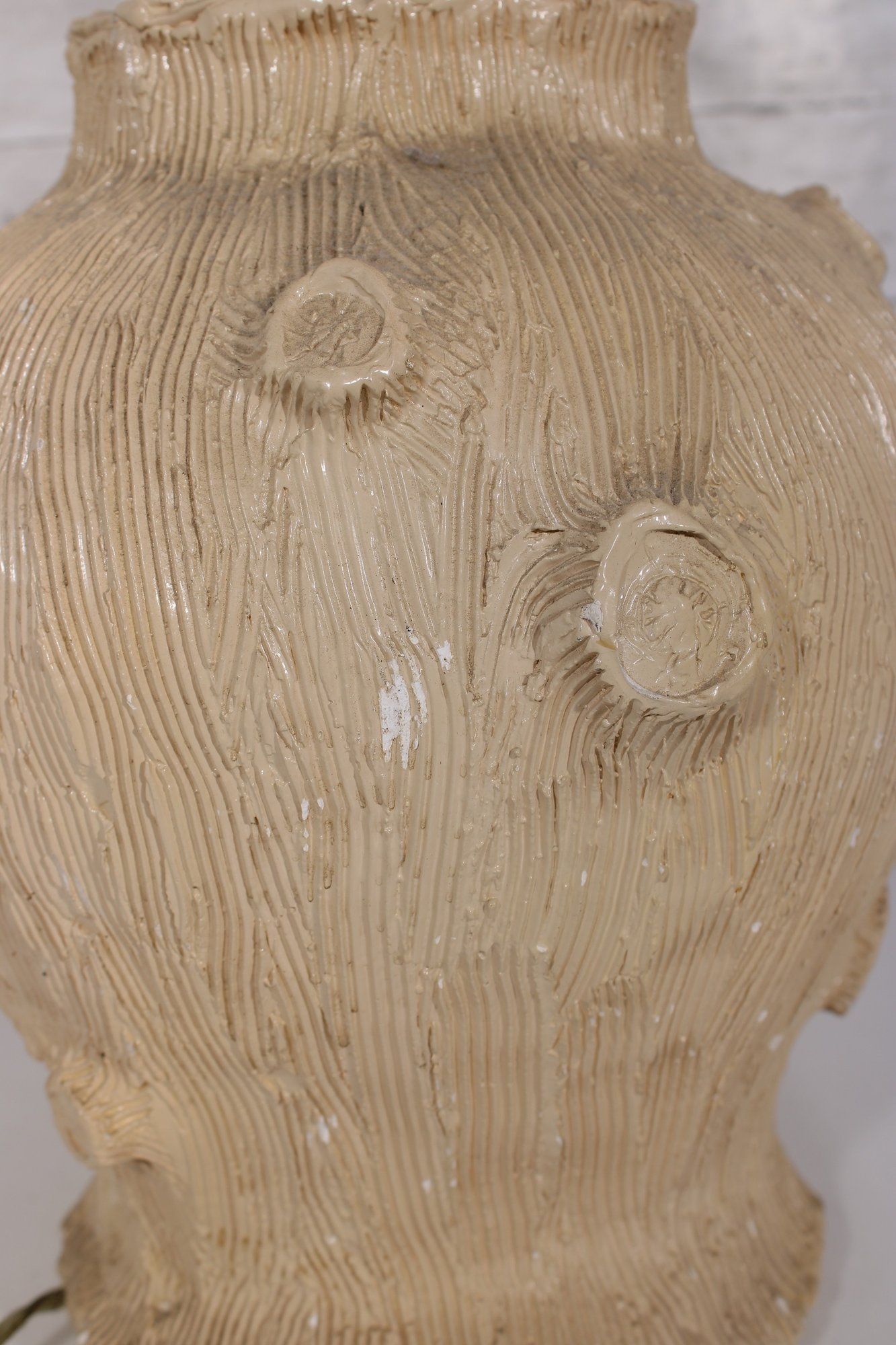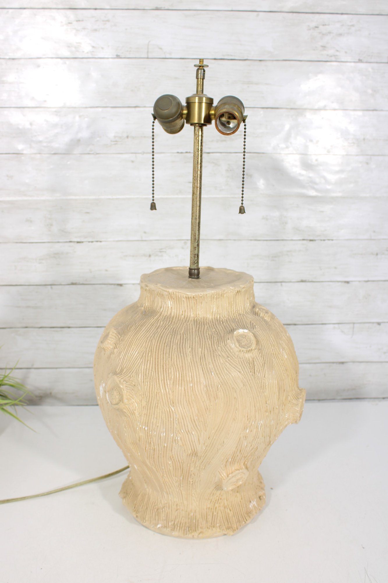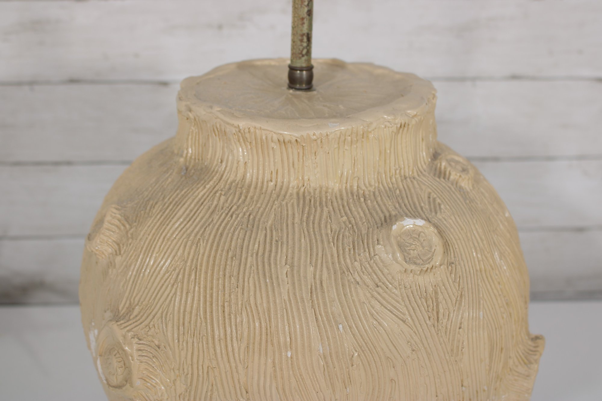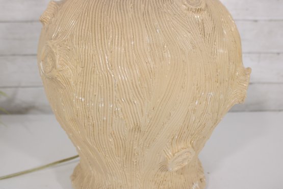 vintage table lamp featuring a sculptural ceramic base with an organic, hand-textured surface and natural cream glaze. The design showcases raised knot-like details and vertical striations, giving it a unique, almost driftwood-inspired appearance.