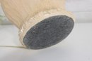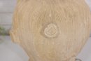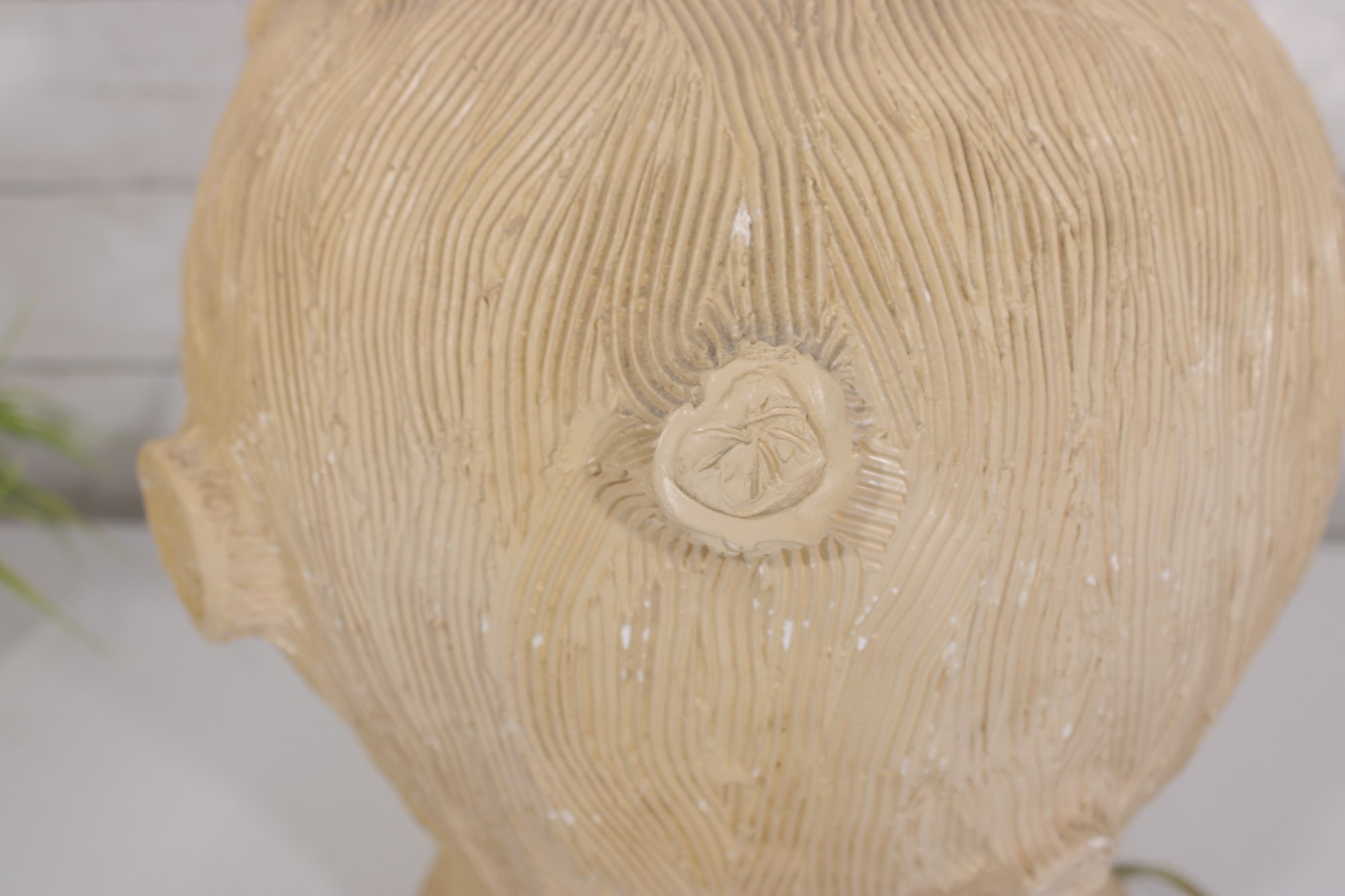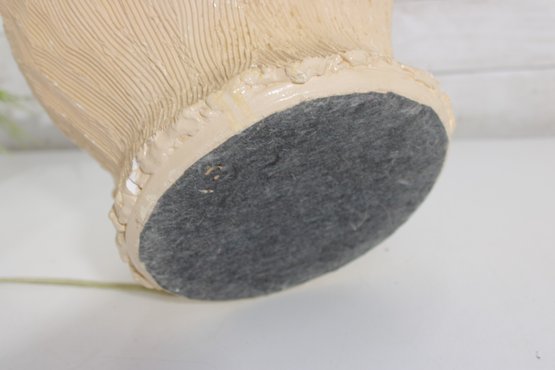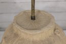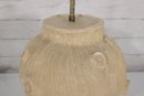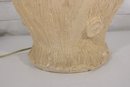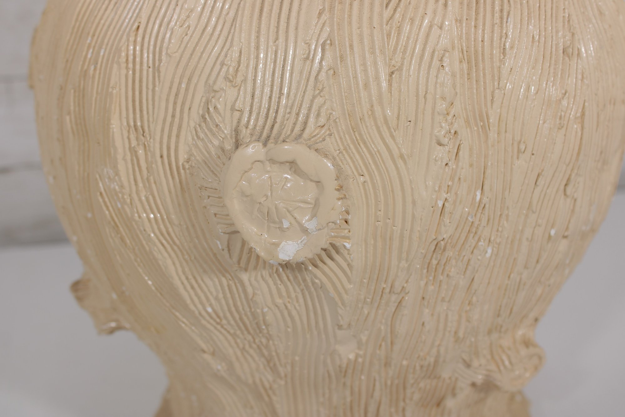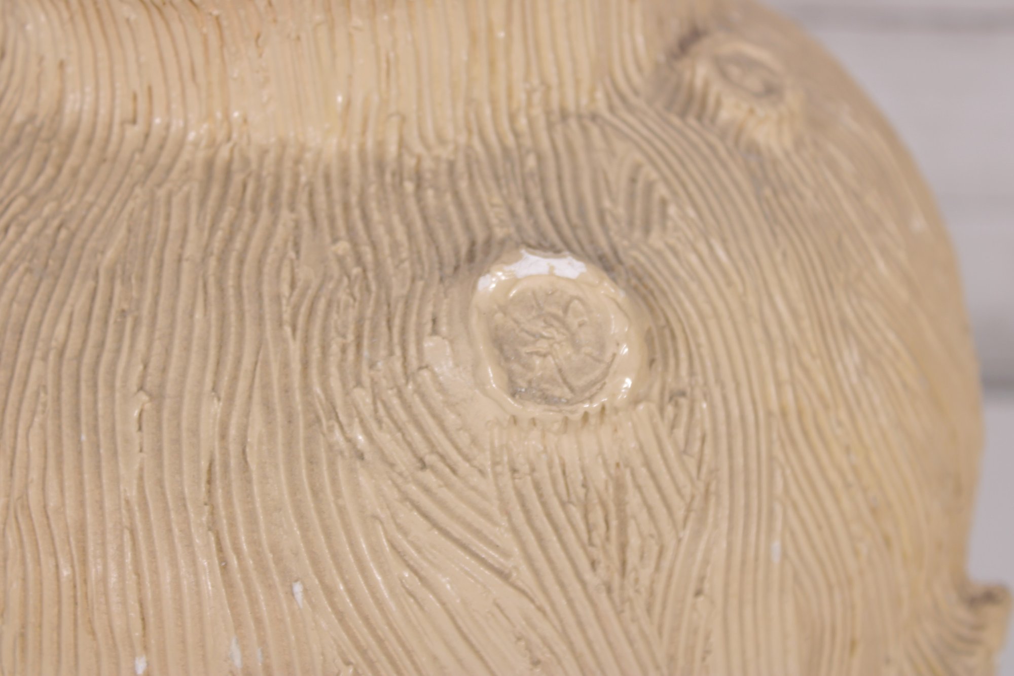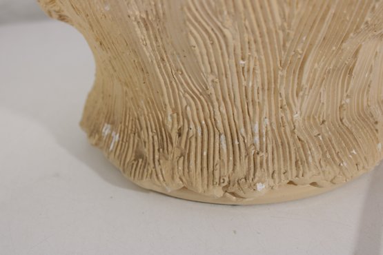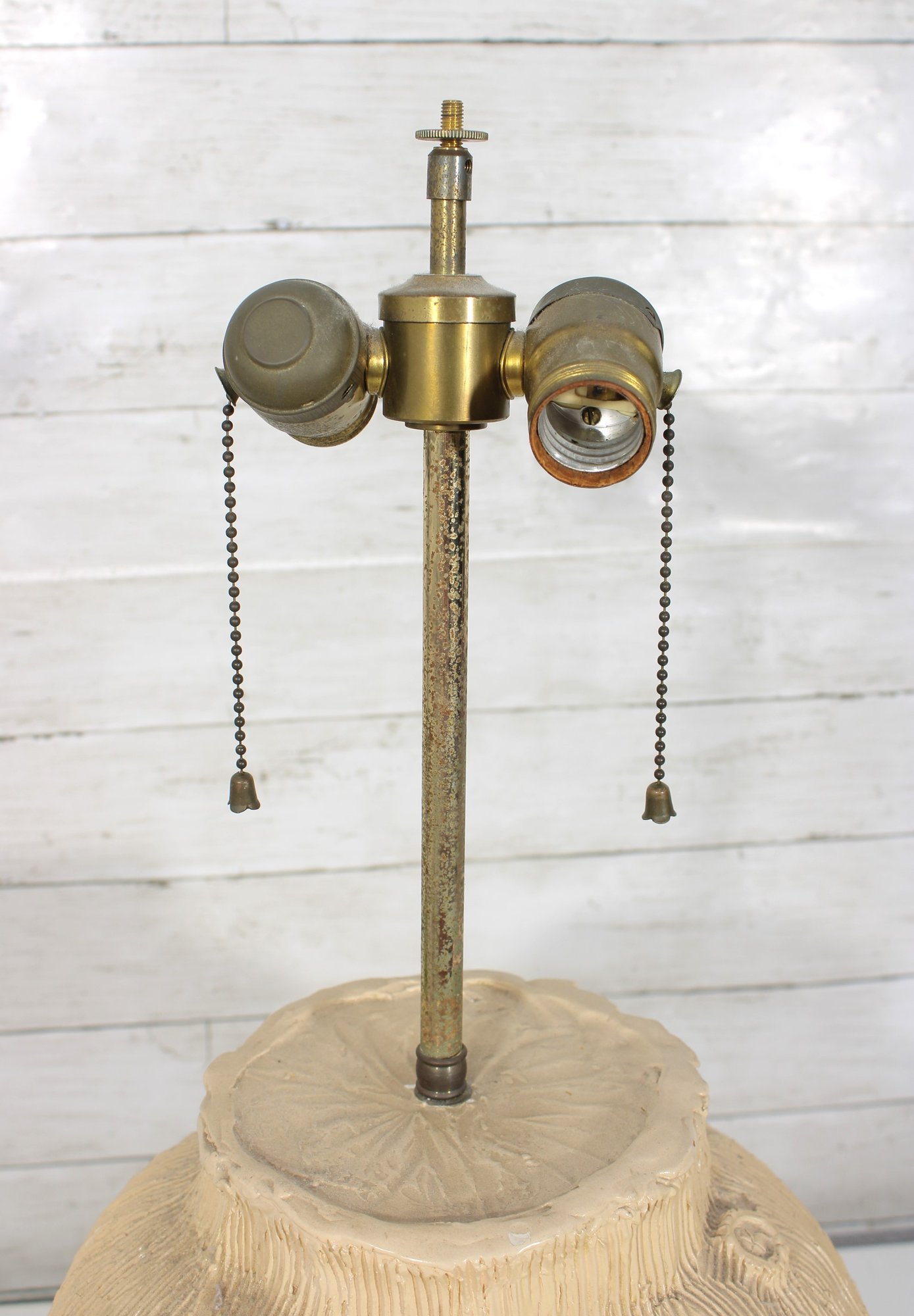 vintage table lamp featuring a sculptural ceramic base with an organic, hand-textured surface and natural cream glaze. The design showcases raised knot-like details and vertical striations, giving it a unique, almost driftwood-inspired appearance.