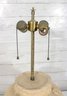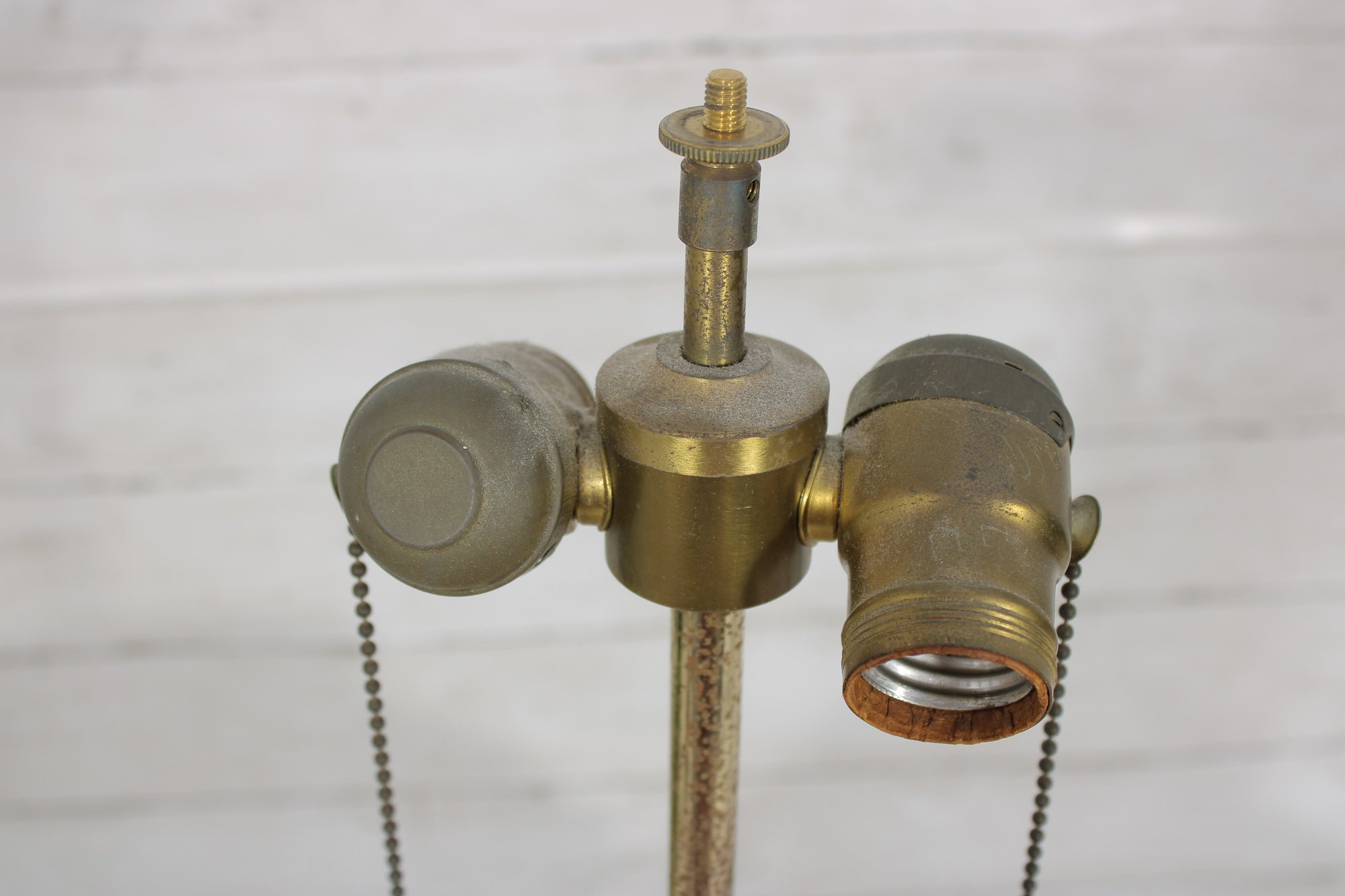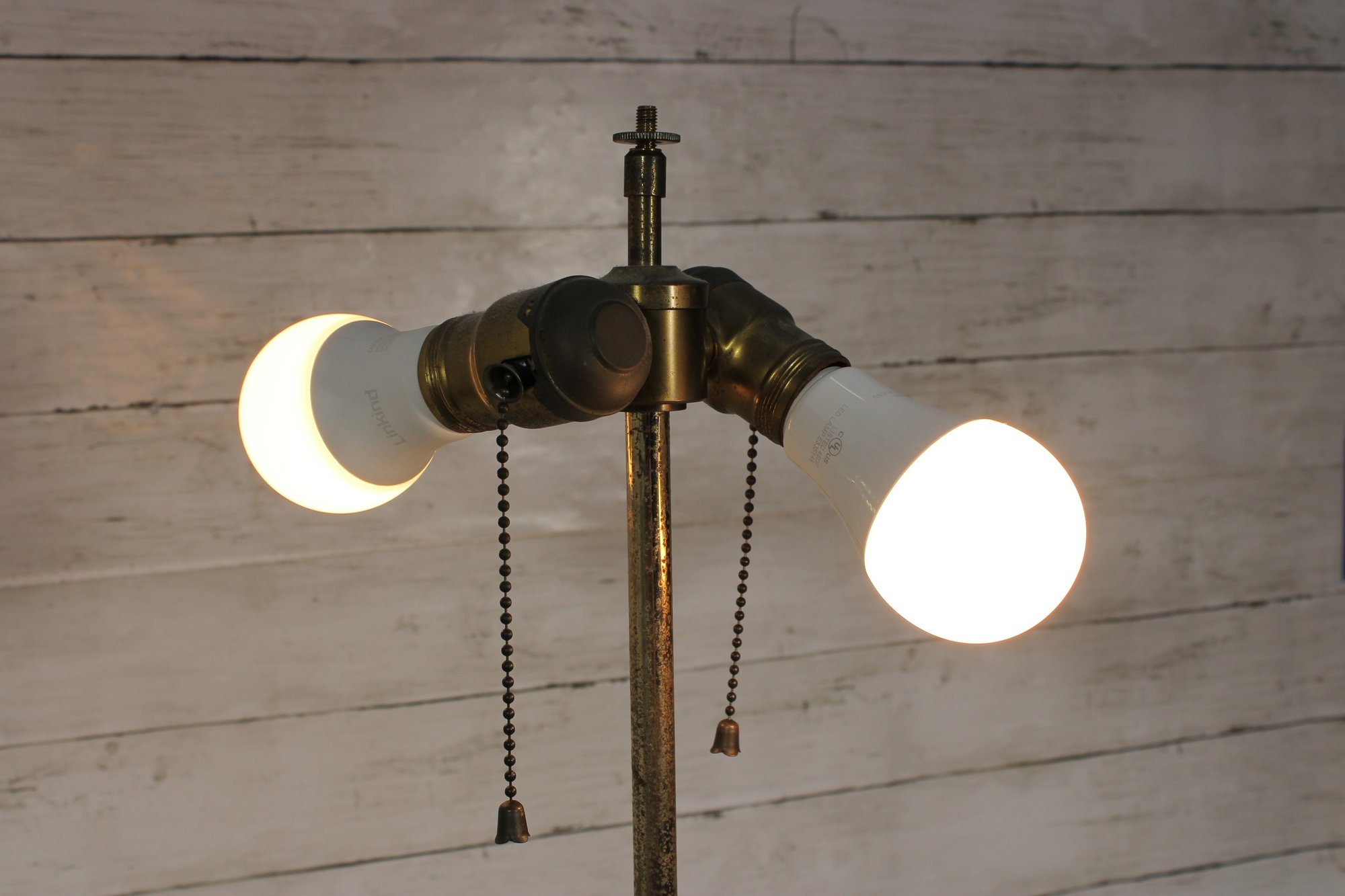 The lamp is fitted with a dual-socket brass-tone fixture, each with its own pull chain for convenient operation. This two-light configuration provides excellent illumination while adding a classic vintage touch.