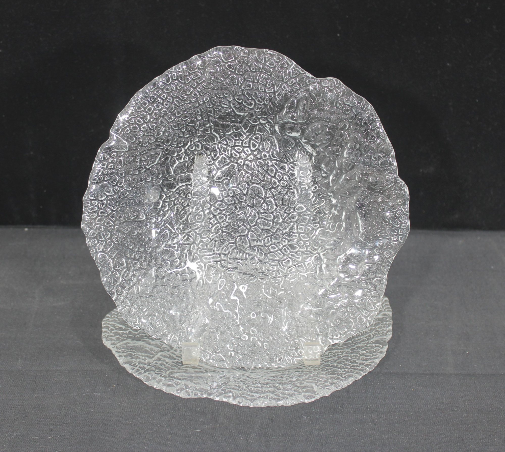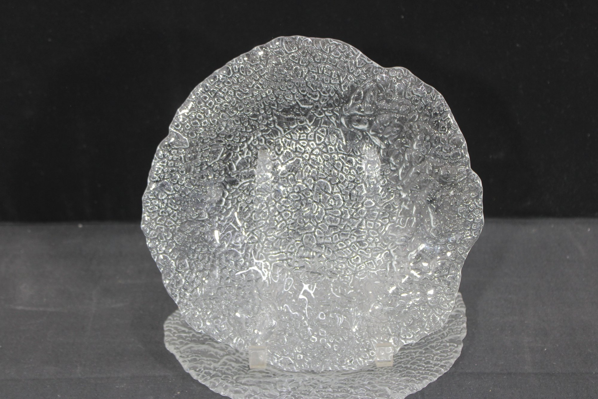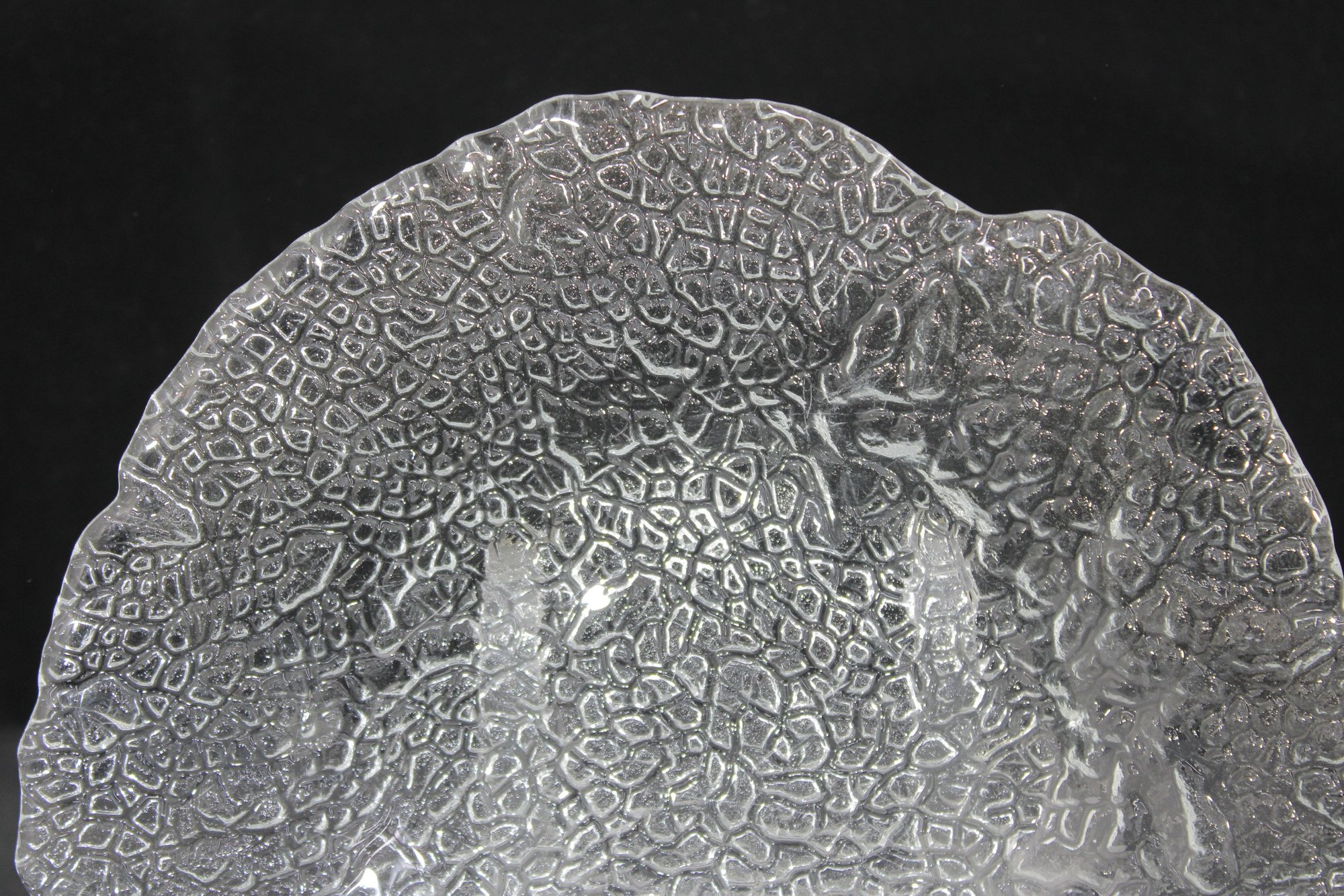 Beautiful vintage clear art glass bowl featuring a richly textured organic pattern throughout. The intricate pebble-like surface creates stunning light reflection and depth, making this piece both decorative and functional.