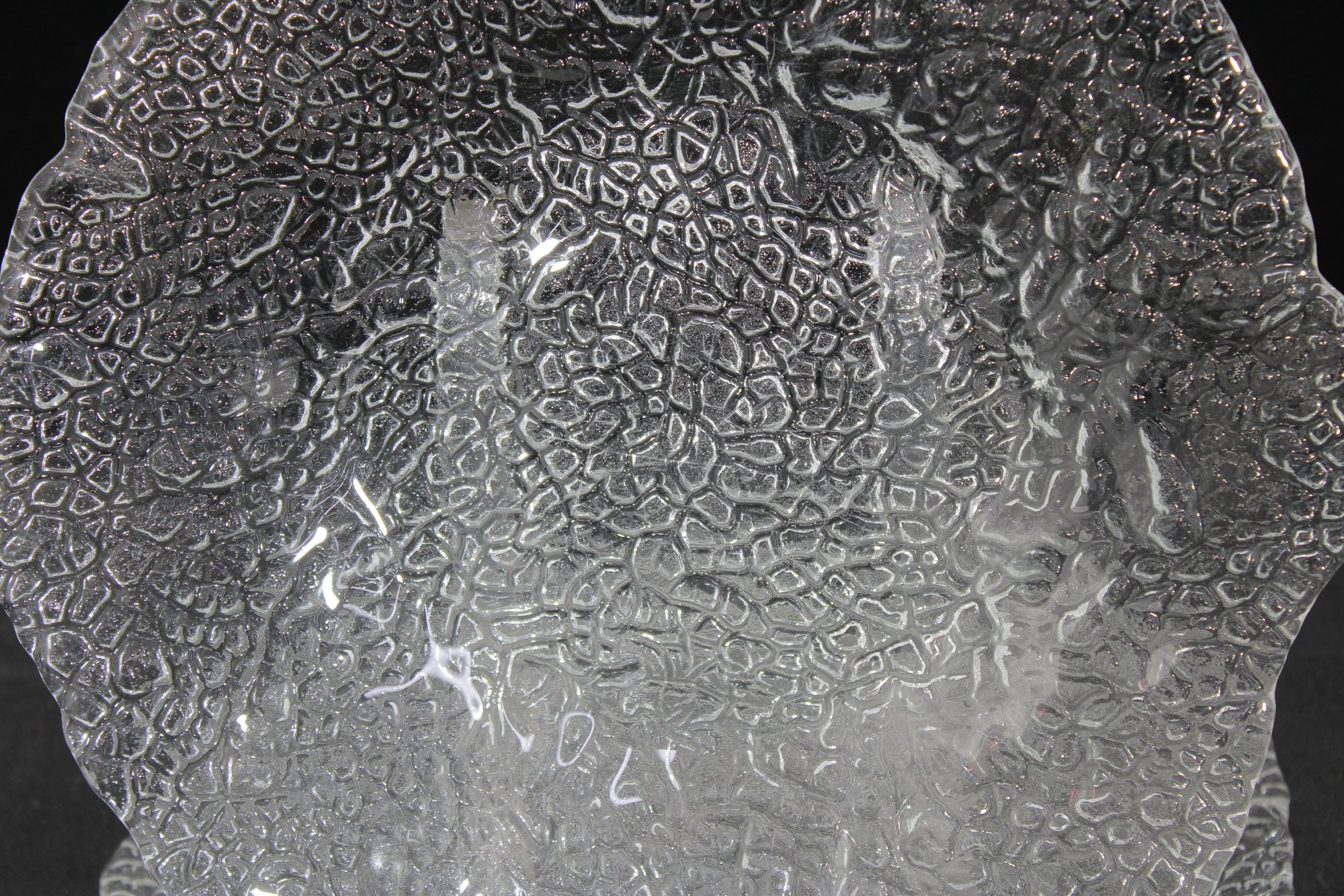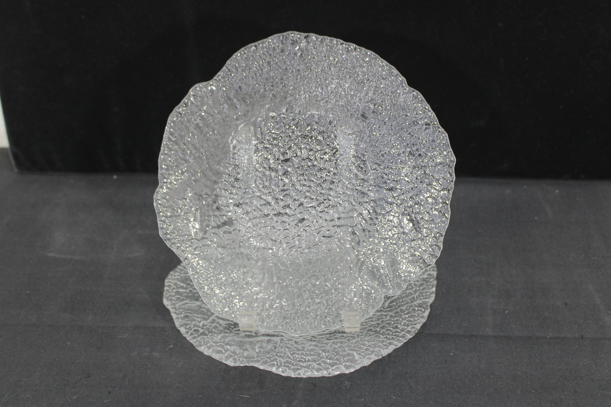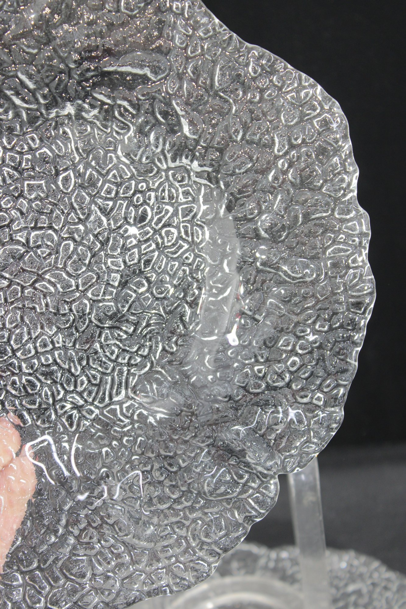 Beautiful vintage clear art glass bowl featuring a richly textured organic pattern throughout. The intricate pebble-like surface creates stunning light reflection and depth, making this piece both decorative and functional.
