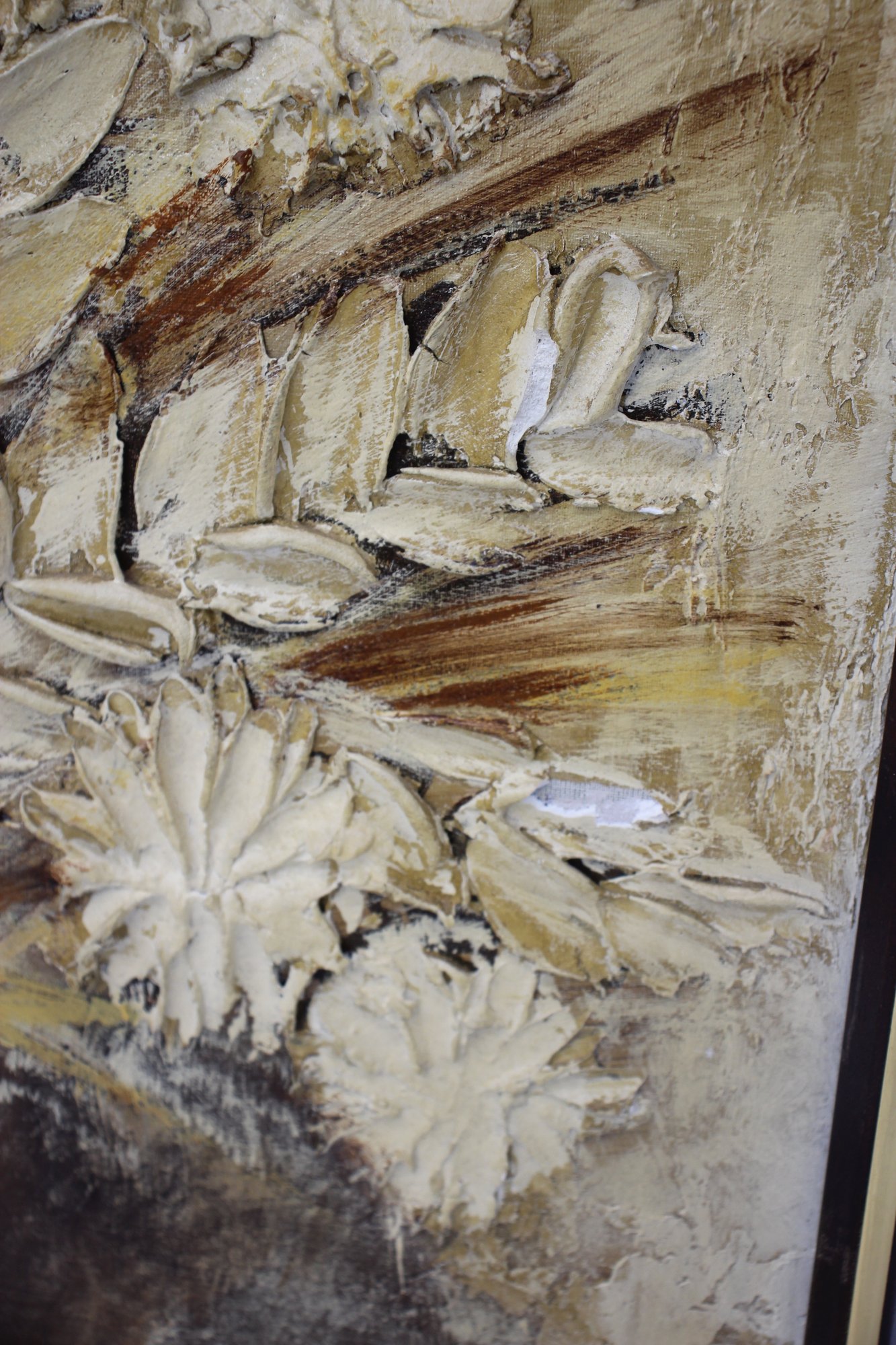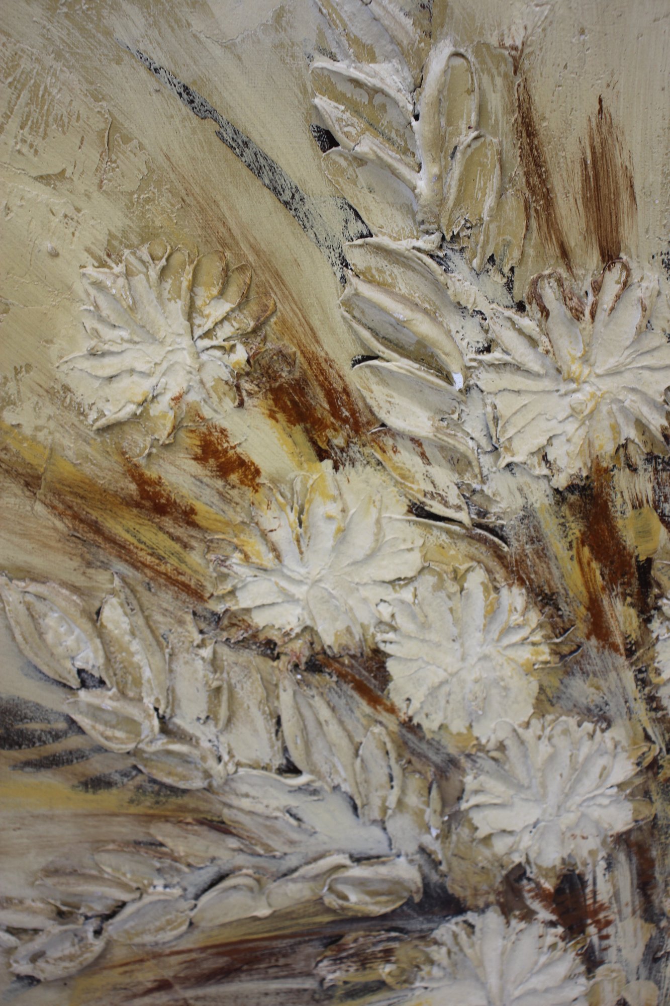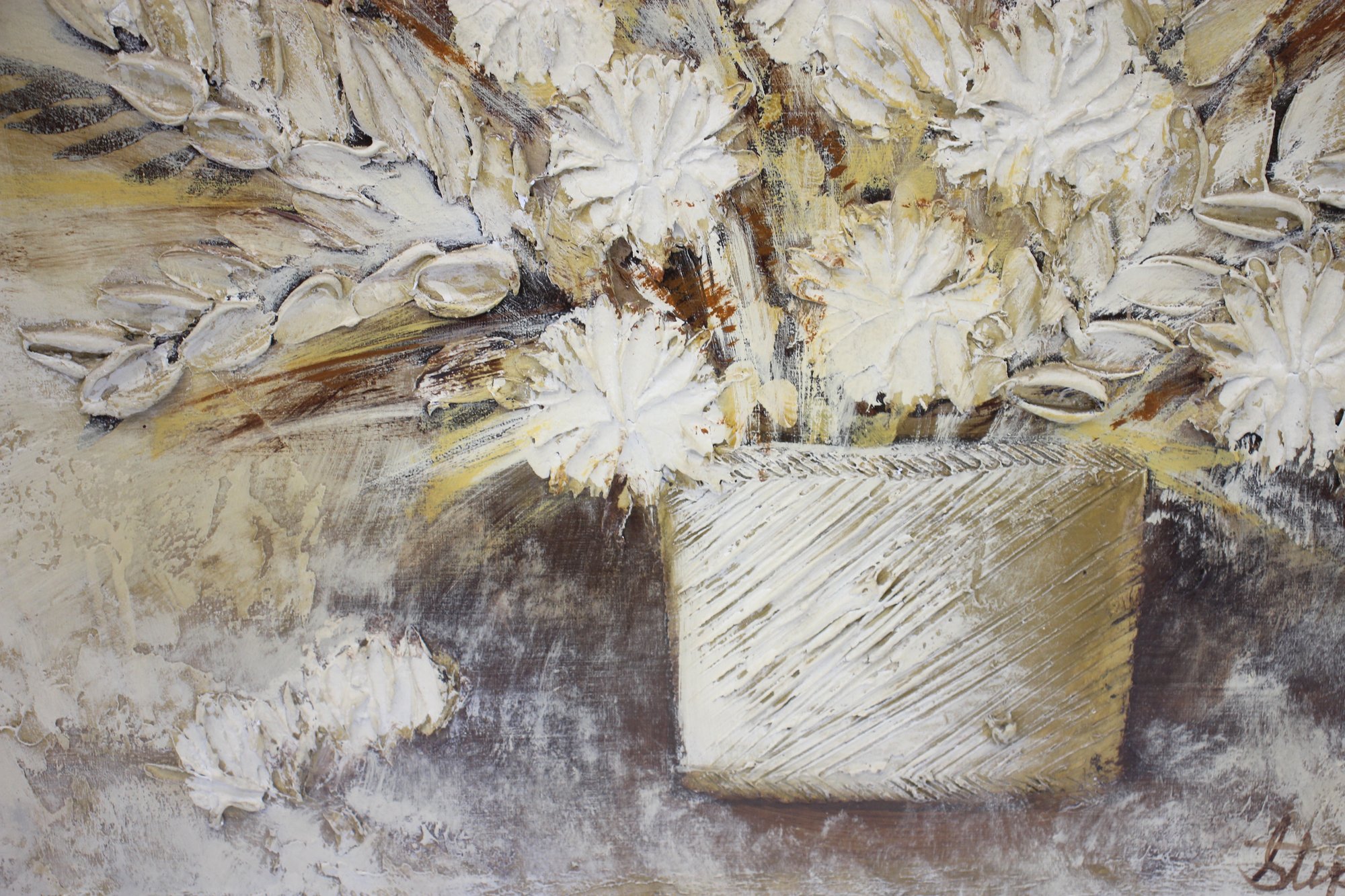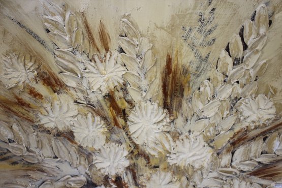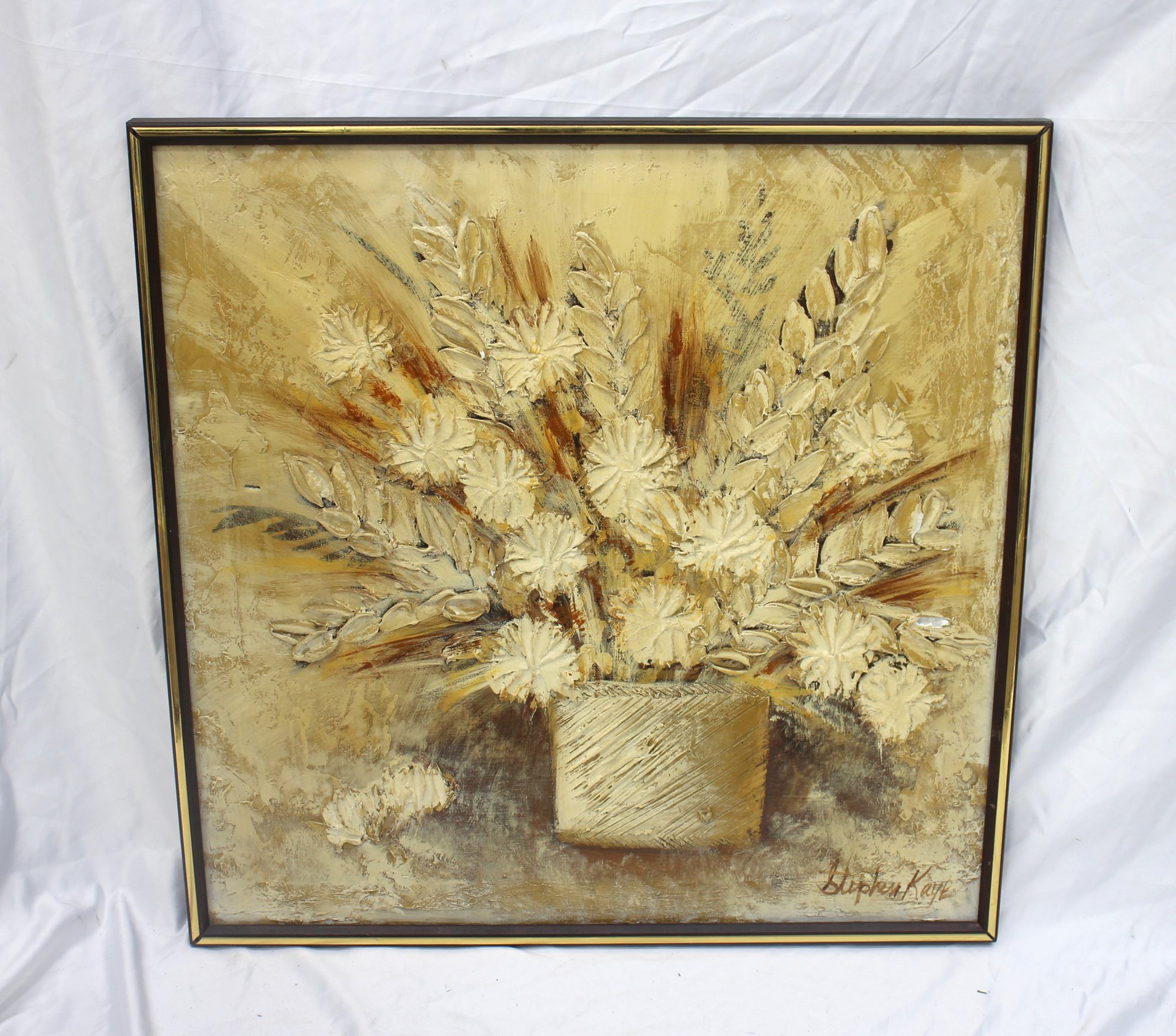 vintage floral still life painting by artist Stephen Kaye features a beautifully textured, dimensional composition of a golden-hued bouquet in an elegant vase. The artist’s skillful use of thick, impasto brushstrokes adds depth and movement, creating a rich, tactile surface that brings the floral arrangement to life.