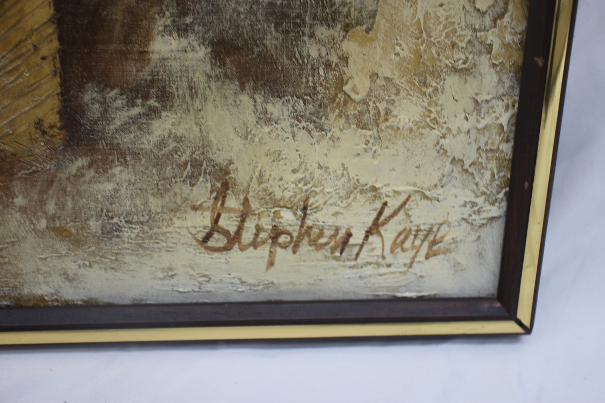 Measuring 27.5 inches in height and 27 inches in width, this piece is housed in a classic dark-toned wooden frame with gold trim, complementing the warm earthy tones of the artwork. The painting is signed by Stephen Kaye in the lower right corner, adding to its authenticity and collectible appeal.
